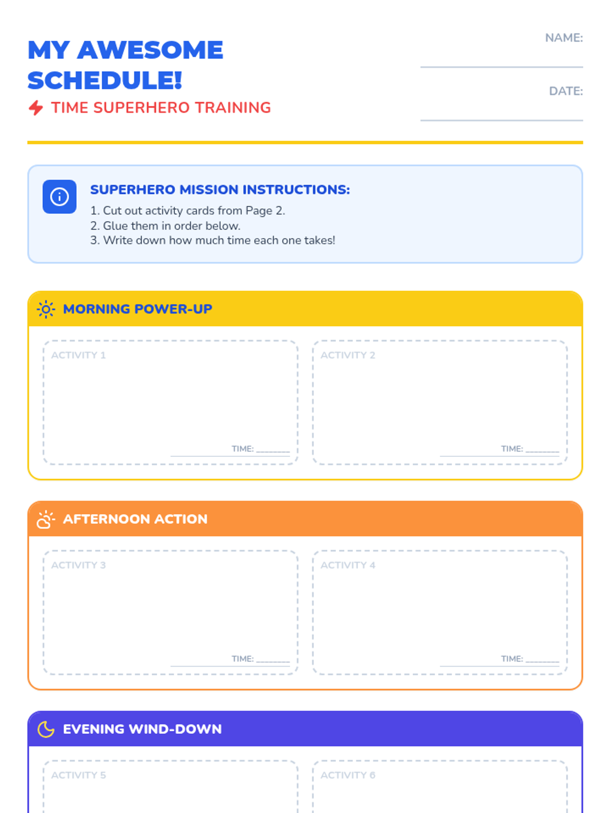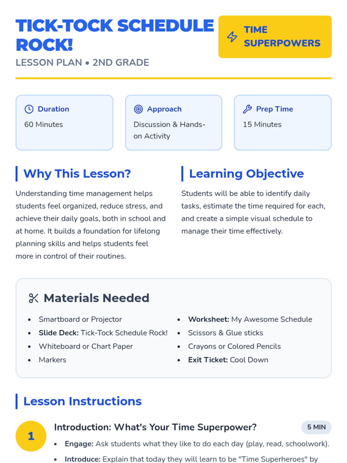 A 60-minute lesson for 2nd graders to learn time management through the concept of 'Time Superpowers,' featuring a visual scheduling activity.