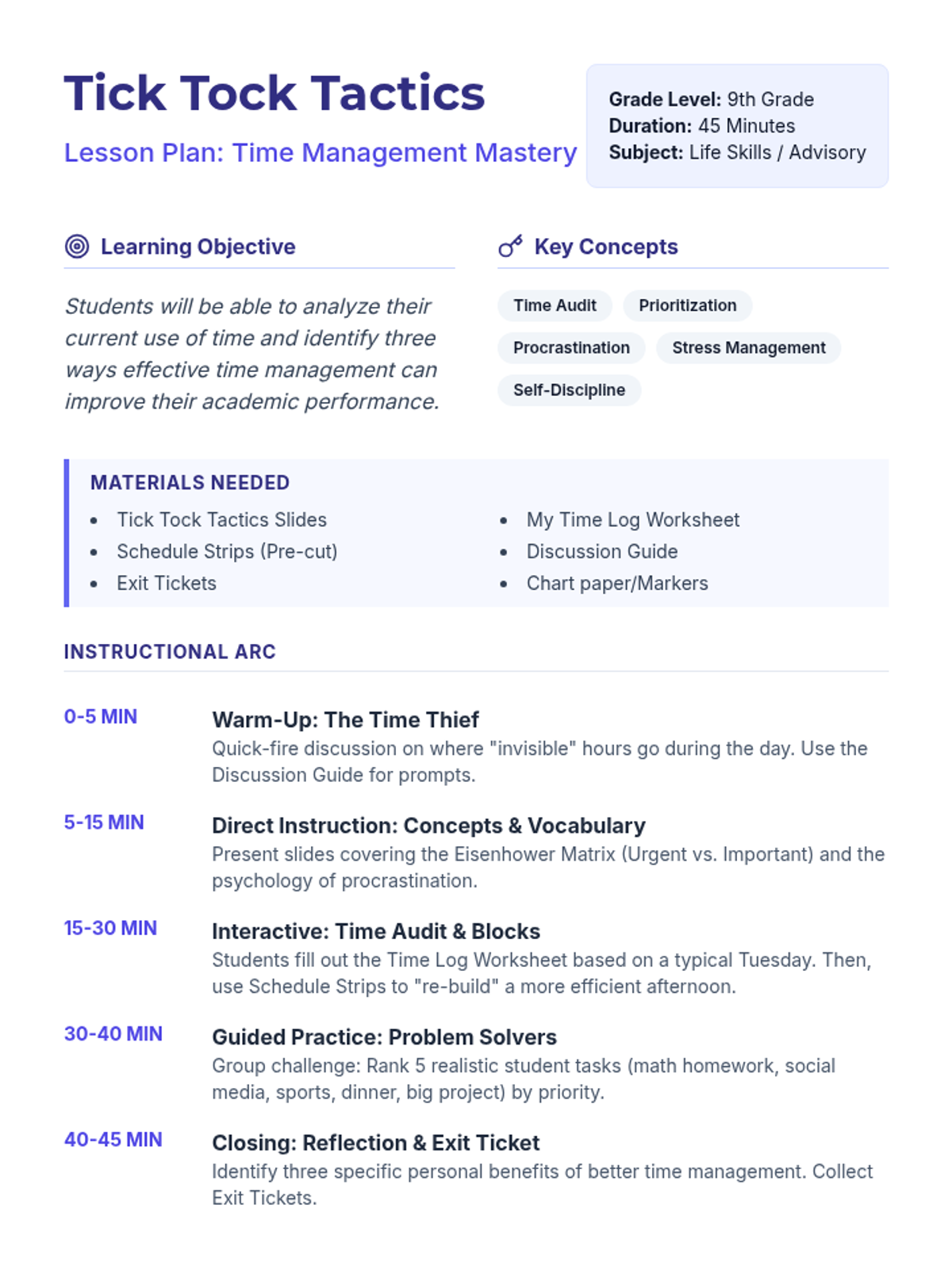 A comprehensive lesson for 9th-grade students on the fundamentals of time management, featuring a time audit activity and practical scheduling strategies to boost academic success and reduce stress.