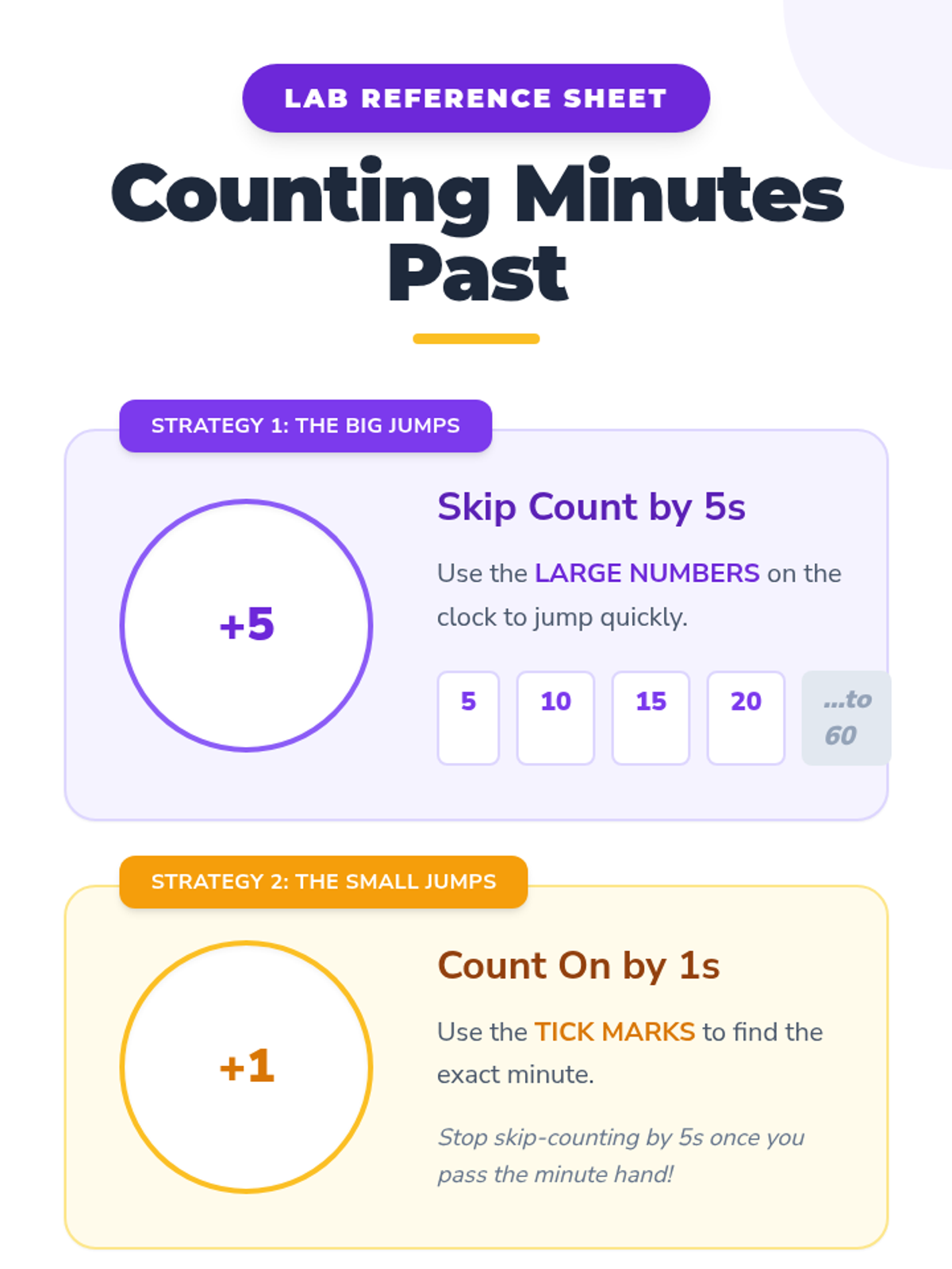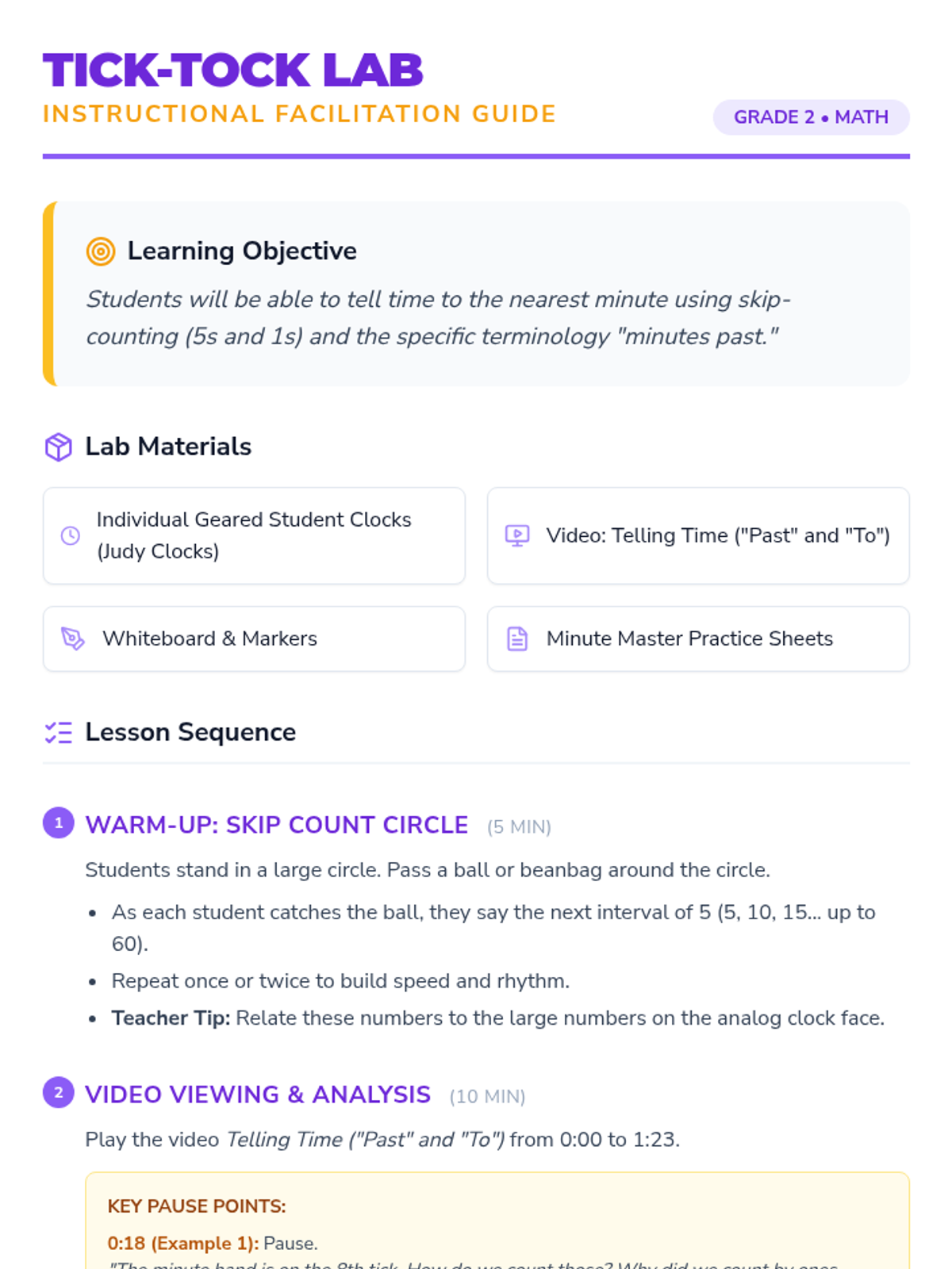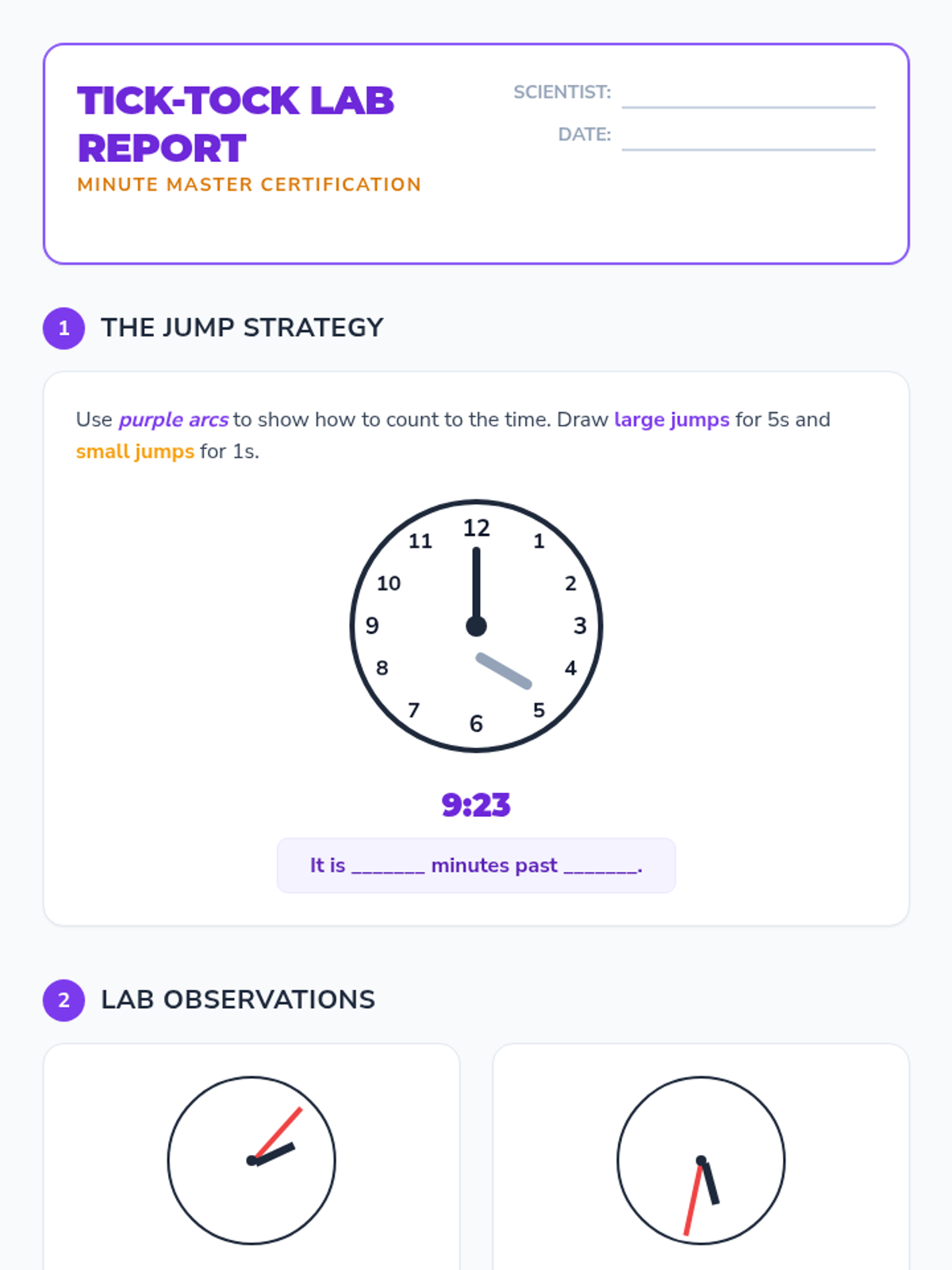 A 2nd-grade lesson focused on telling time to the nearest minute using 'minutes past' terminology, featuring skip-counting strategies and interactive clock manipulation.