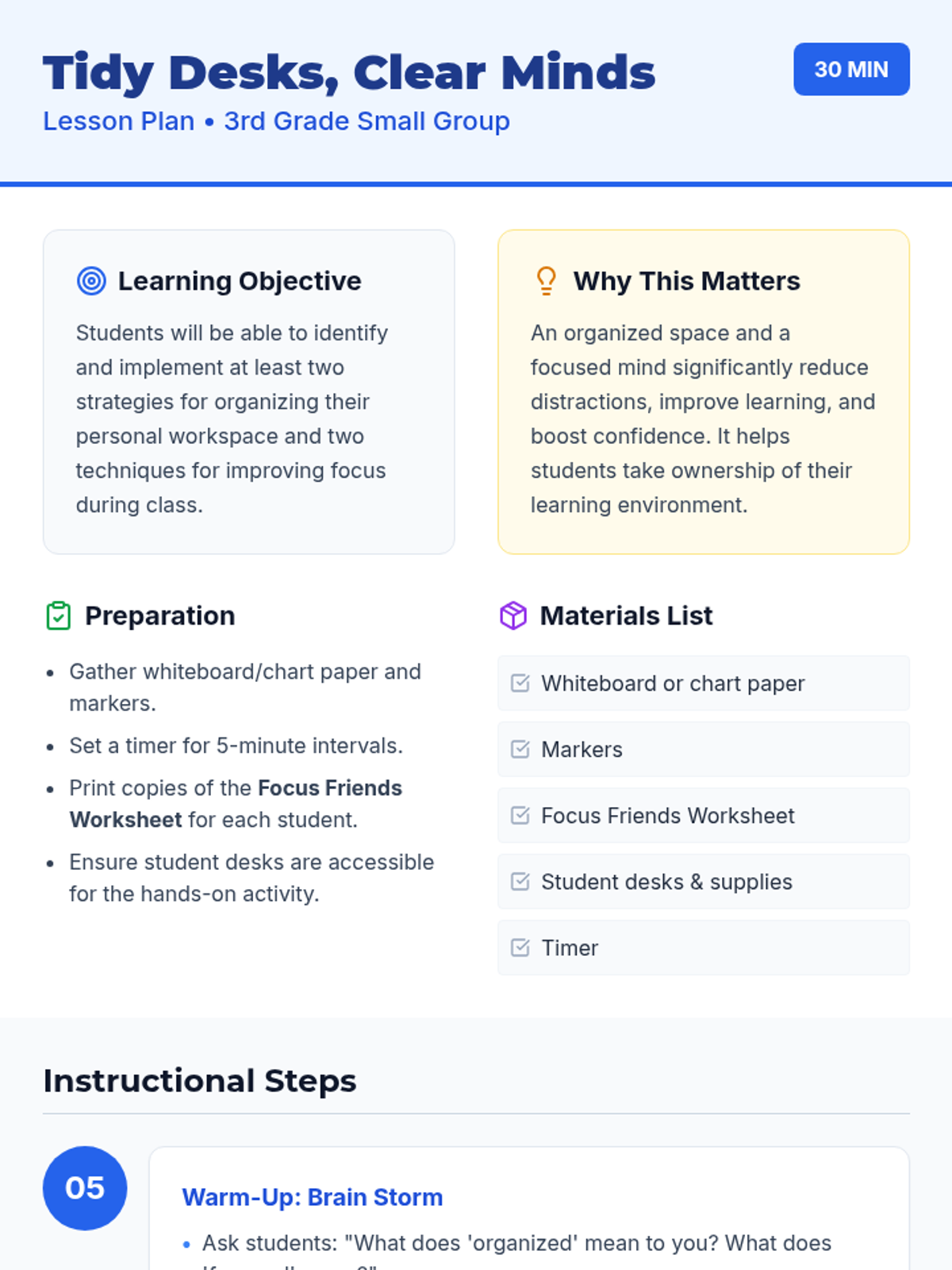 A 30-minute small-group lesson for 3rd graders focusing on practical desk organization and focus techniques to reduce stress and improve academic success.
