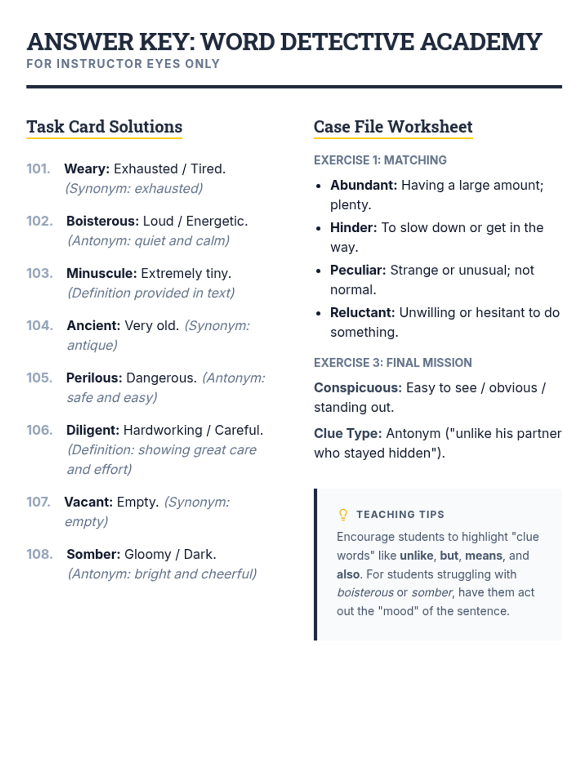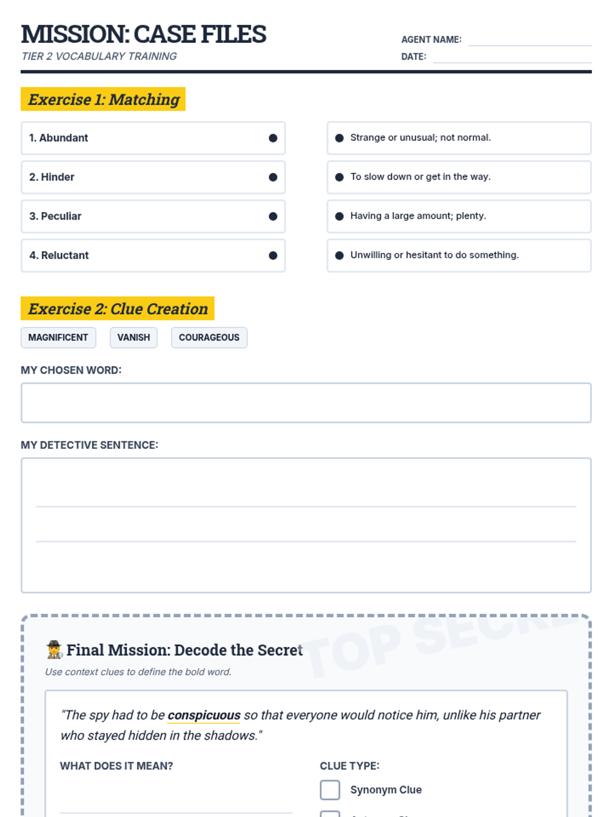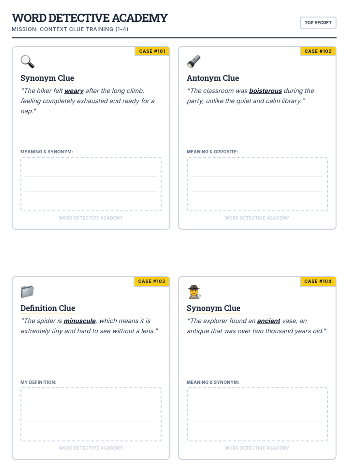 A mystery-themed lesson where students become 'Word Detectives' to uncover the meanings of Tier 2 vocabulary using synonym, antonym, and definition context clues.