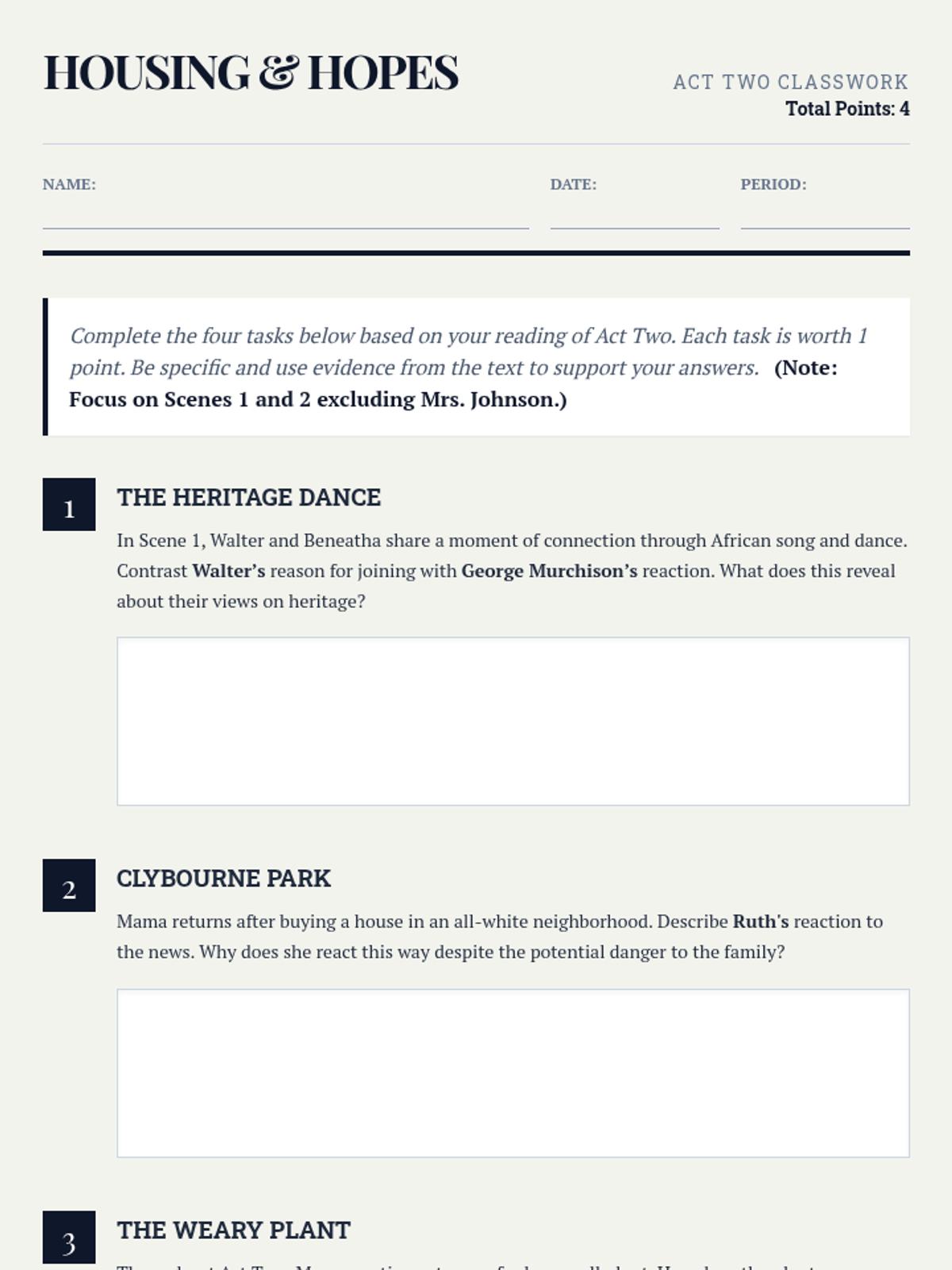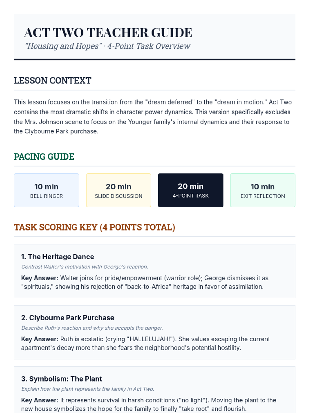 Explores the pivotal moments of Act Two, including the clash between assimilation and heritage, the purchase of the Clybourne Park house, and the shifting power dynamics within the Younger household.