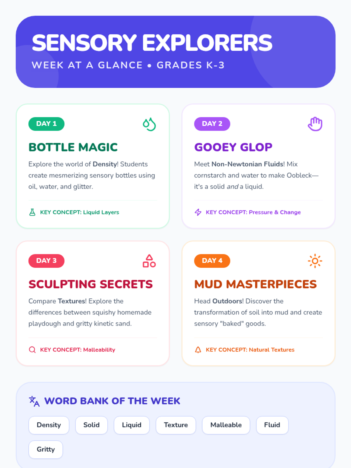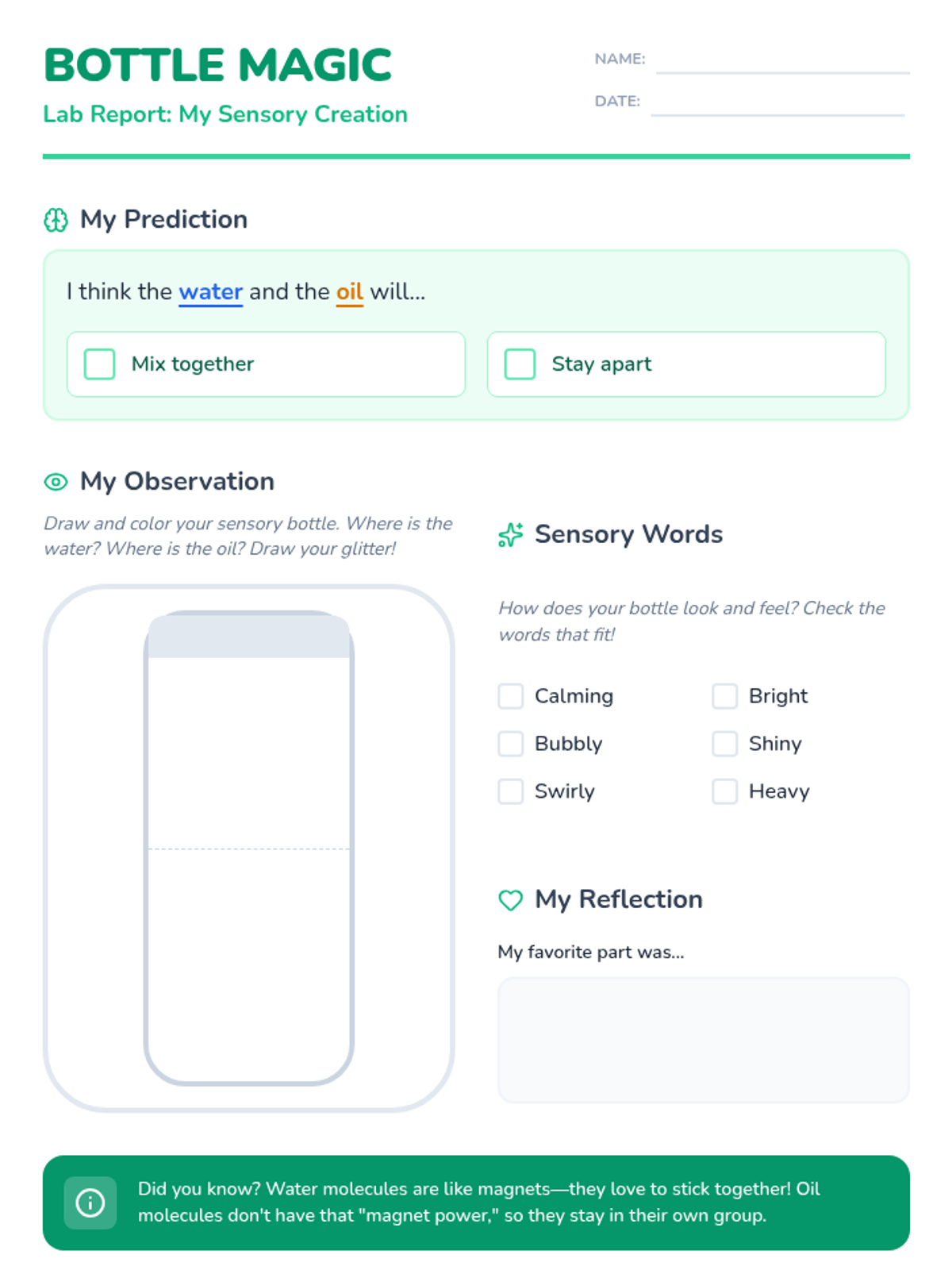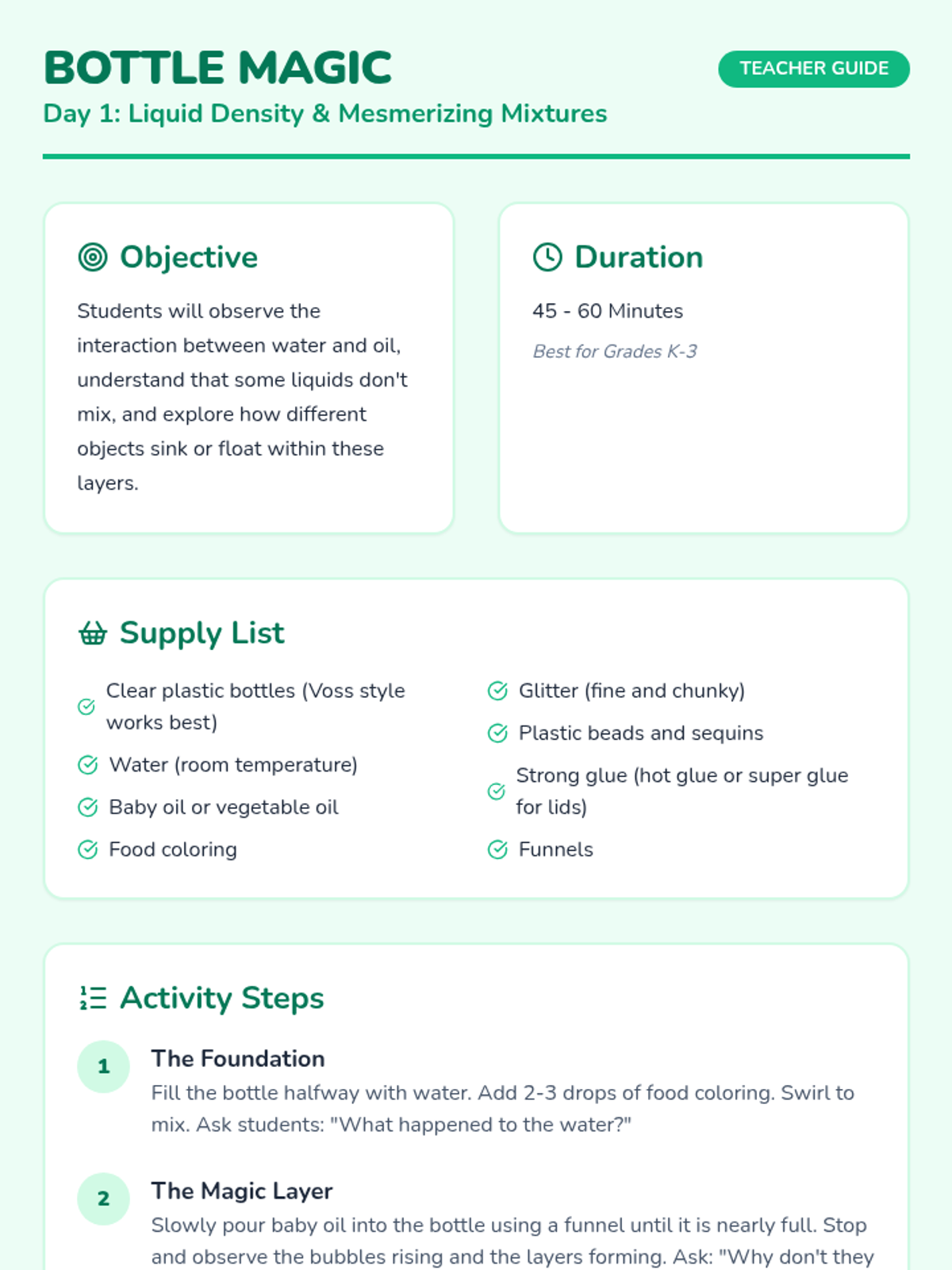 Students explore density and mixtures by creating mesmerizing sensory bottles using oil, water, and various floating objects.