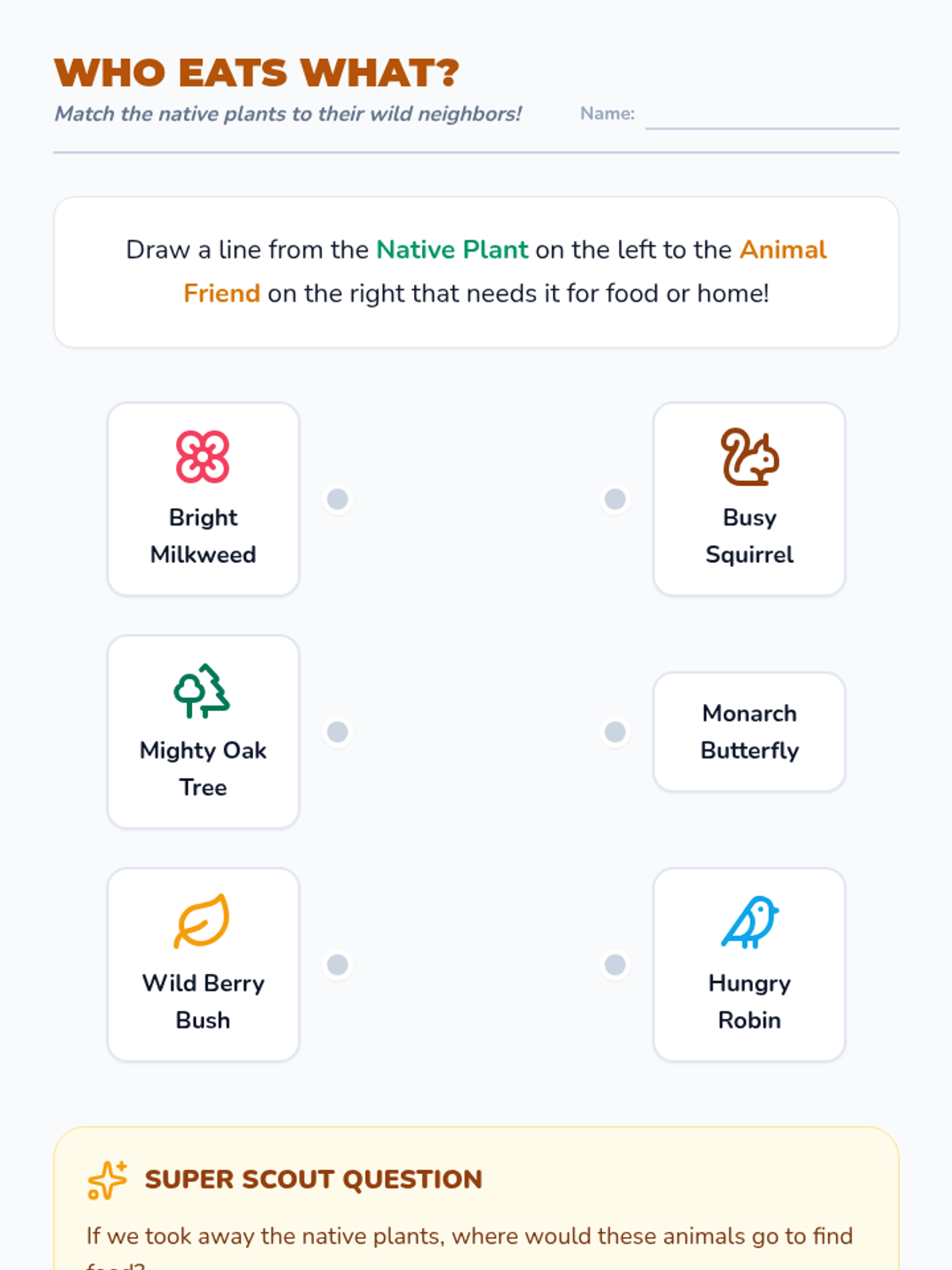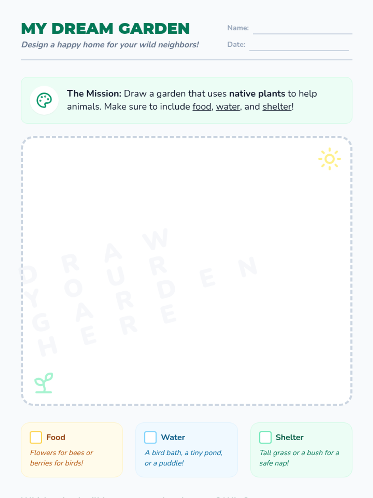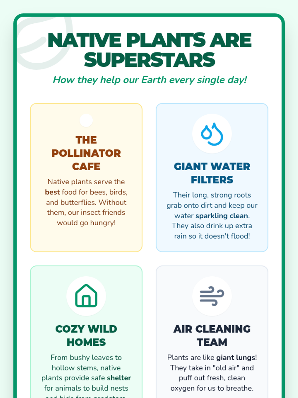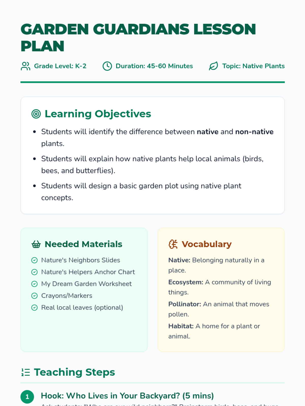 An introductory lesson on the importance of native plants for local ecosystems, designed for K-2 students. Includes hands-on garden design projects and visual aids for ecosystem services.