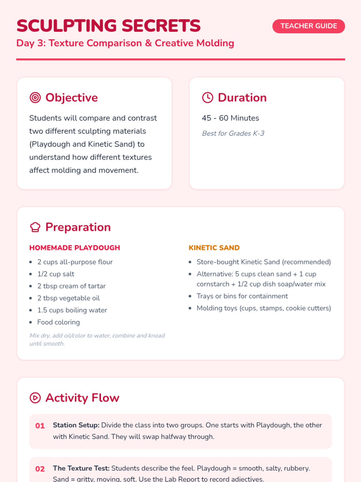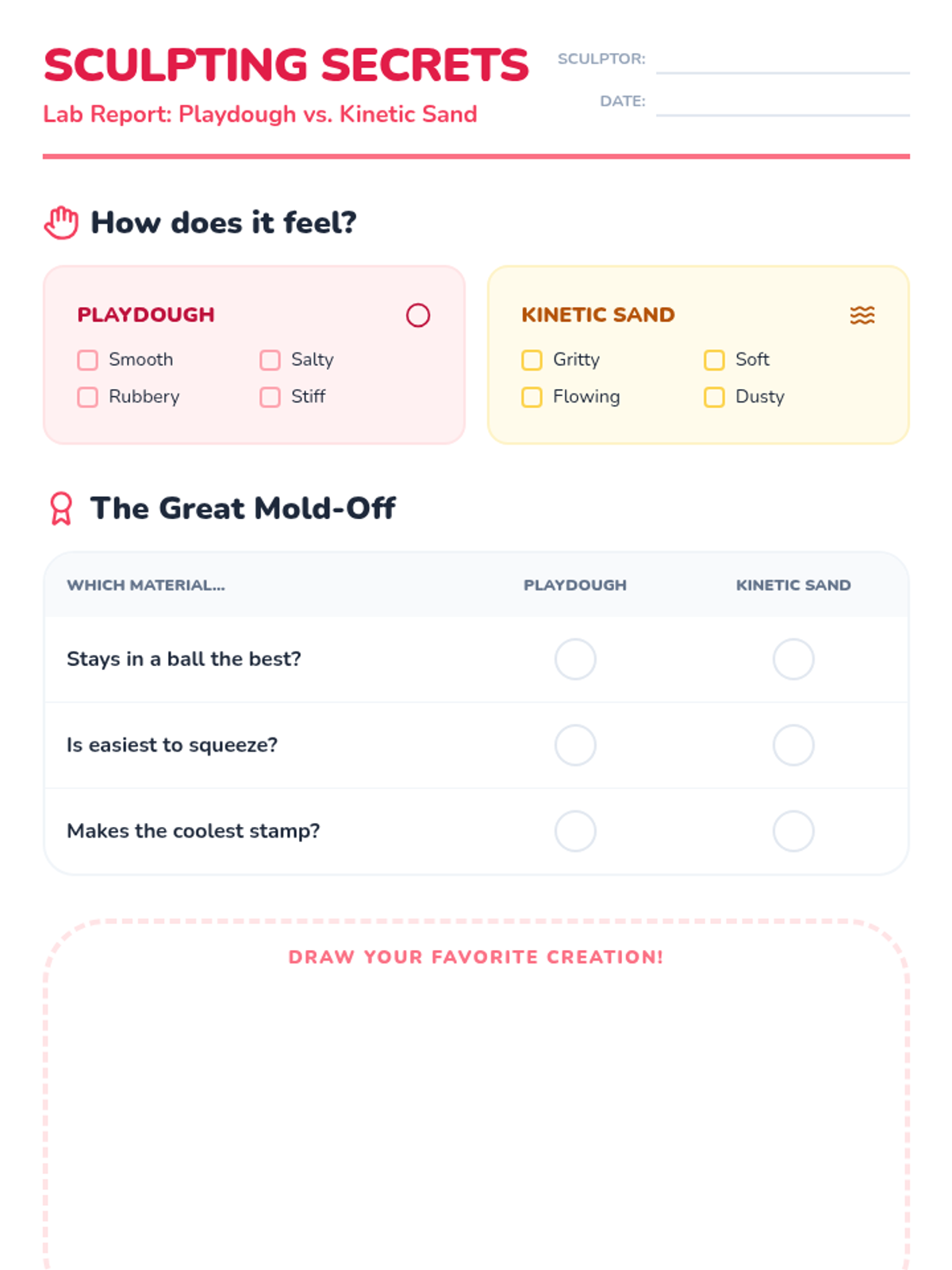 Students compare and contrast the textures and molding properties of homemade playdough and kinetic sand through tactile exploration.