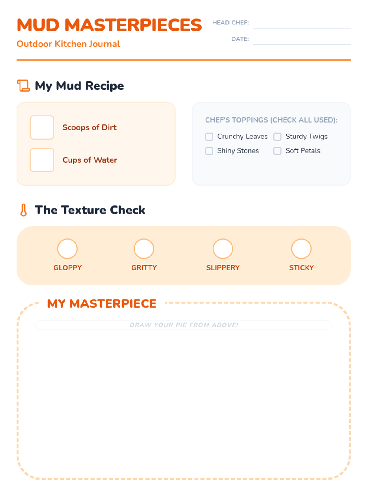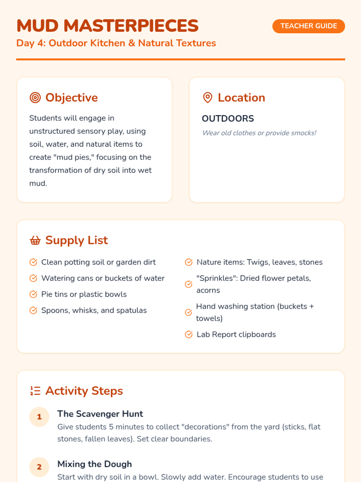 An outdoor sensory experience where students use natural materials to create 'mud pies,' focusing on texture, composition, and imaginative play.