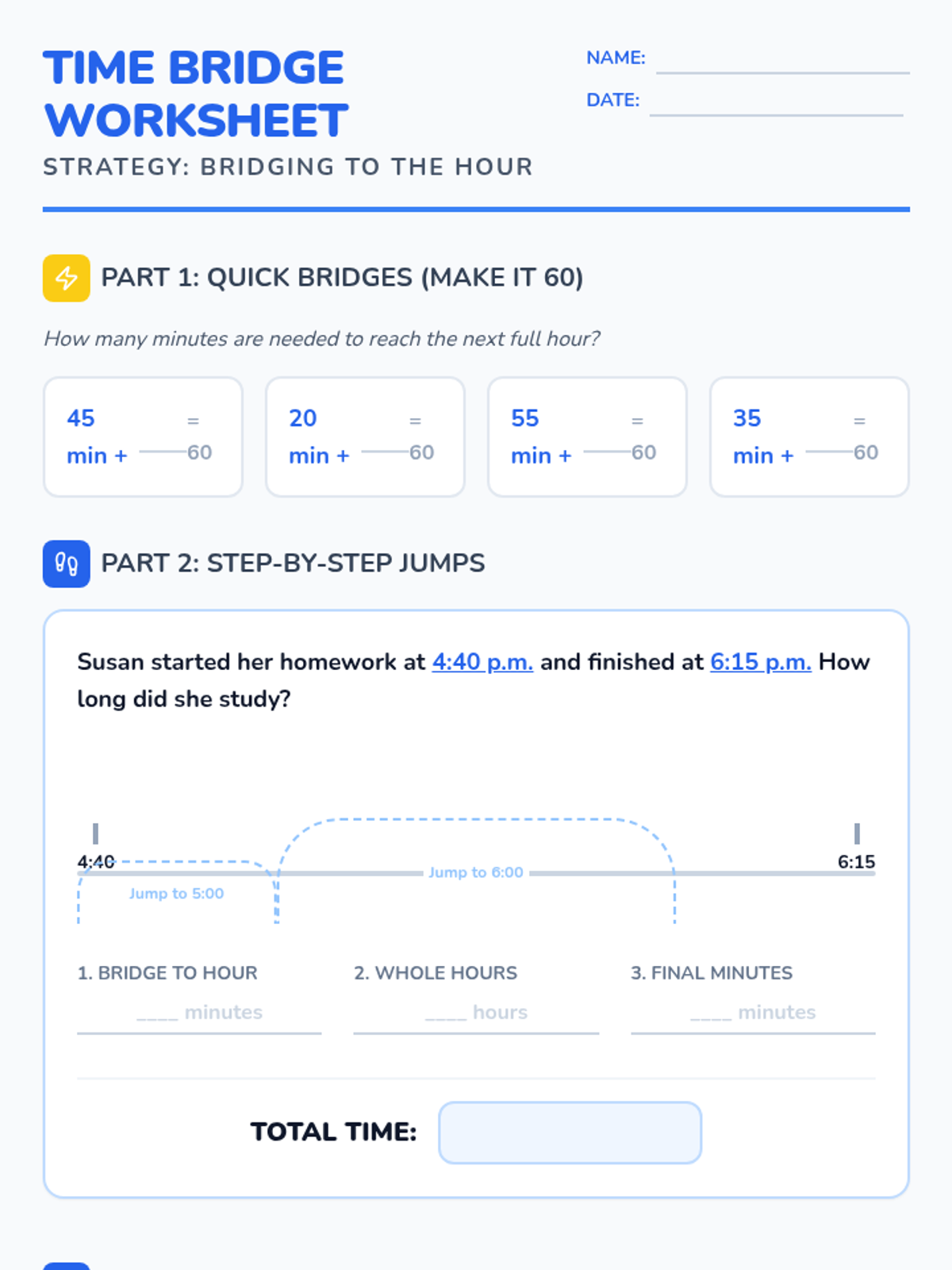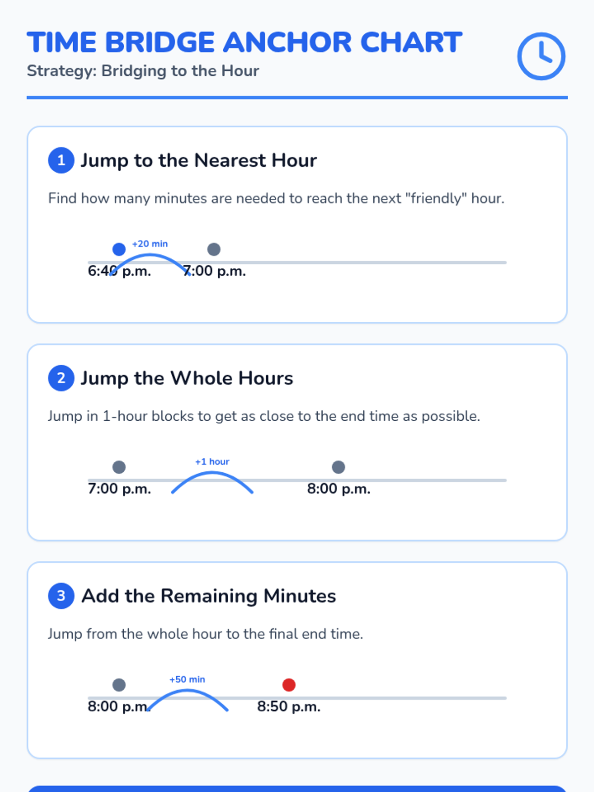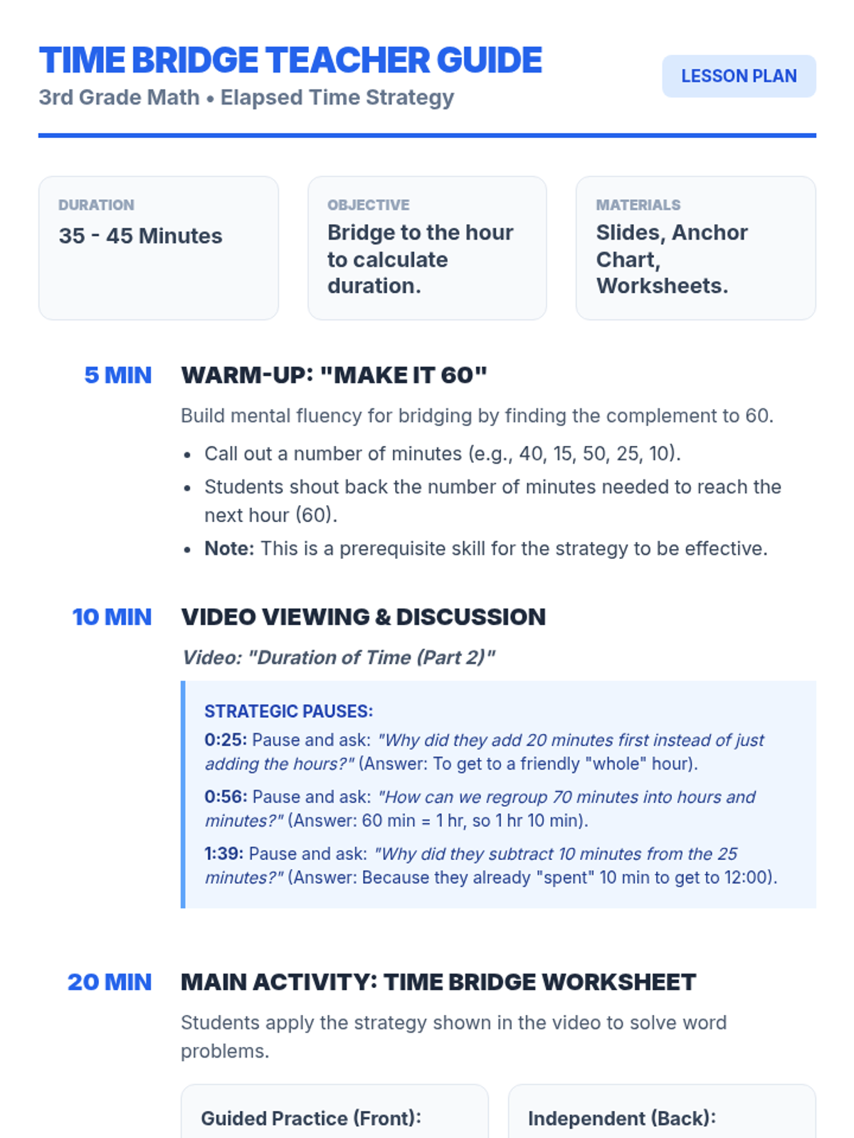 An explicit instruction lesson on elapsed time for 3rd graders, focusing on finding start and end times using the 'Mountain, Hill, Rock' number line strategy. Students will practice jumping through hours and minutes to solve real-world problems.