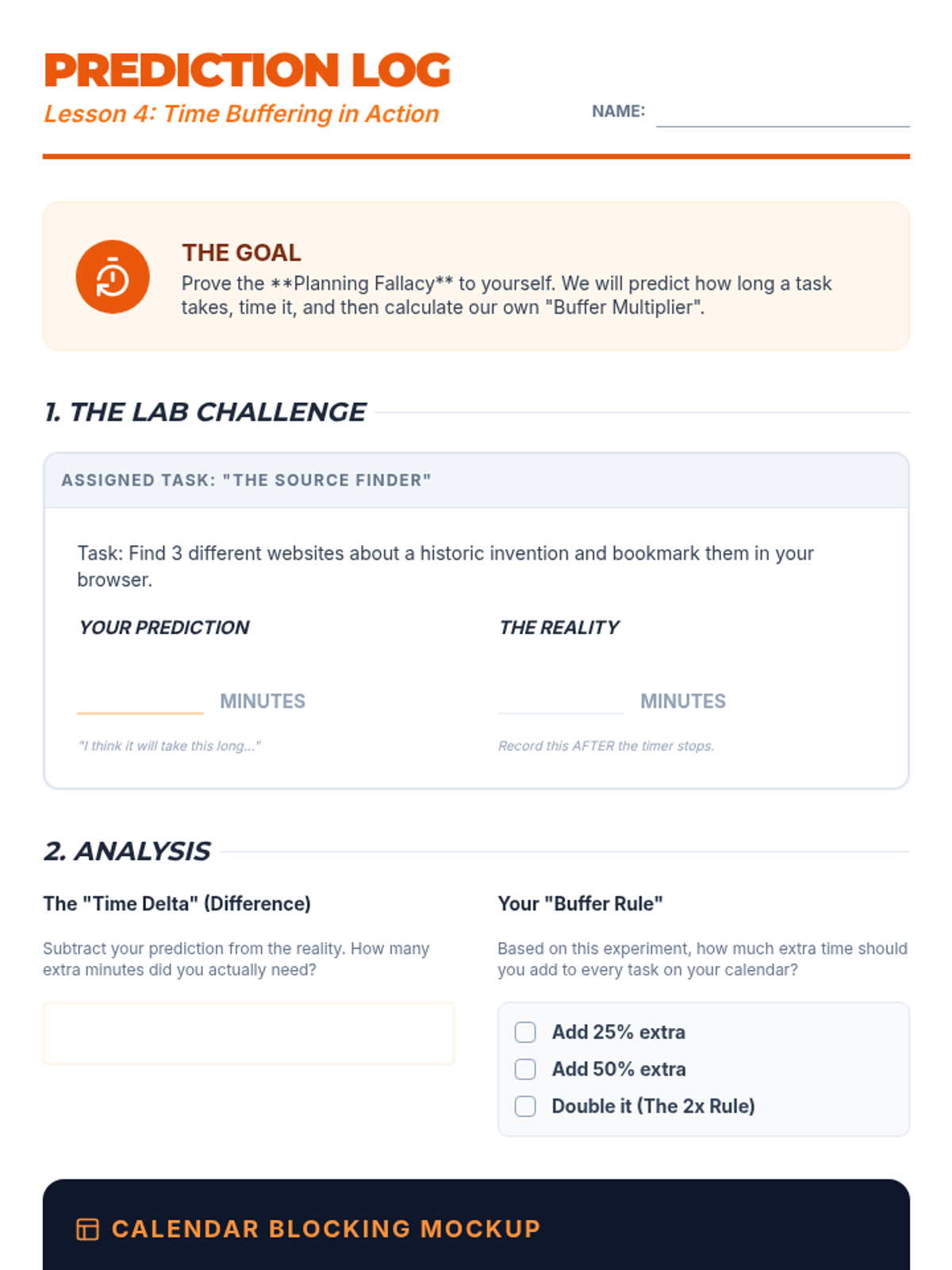 Students practice assigning realistic time blocks to tasks and learn to account for executive dysfunction by over-estimating duration with 'buffer time'.
