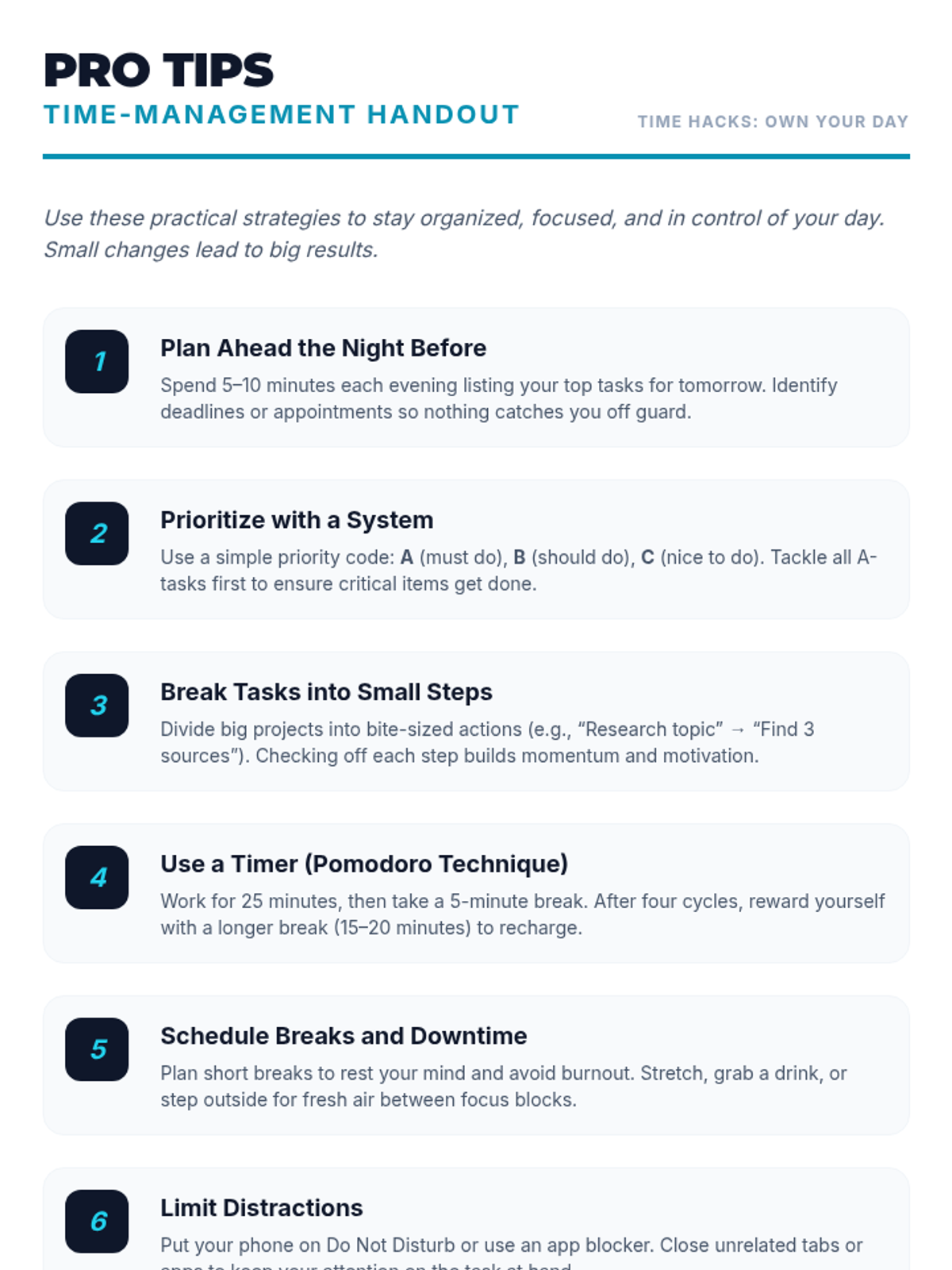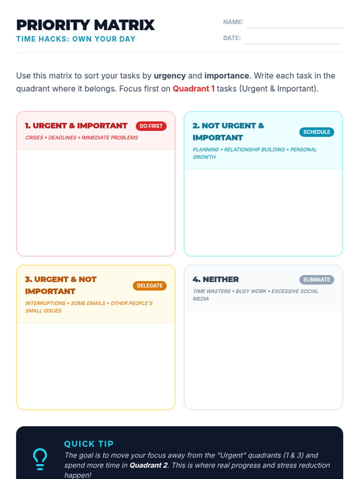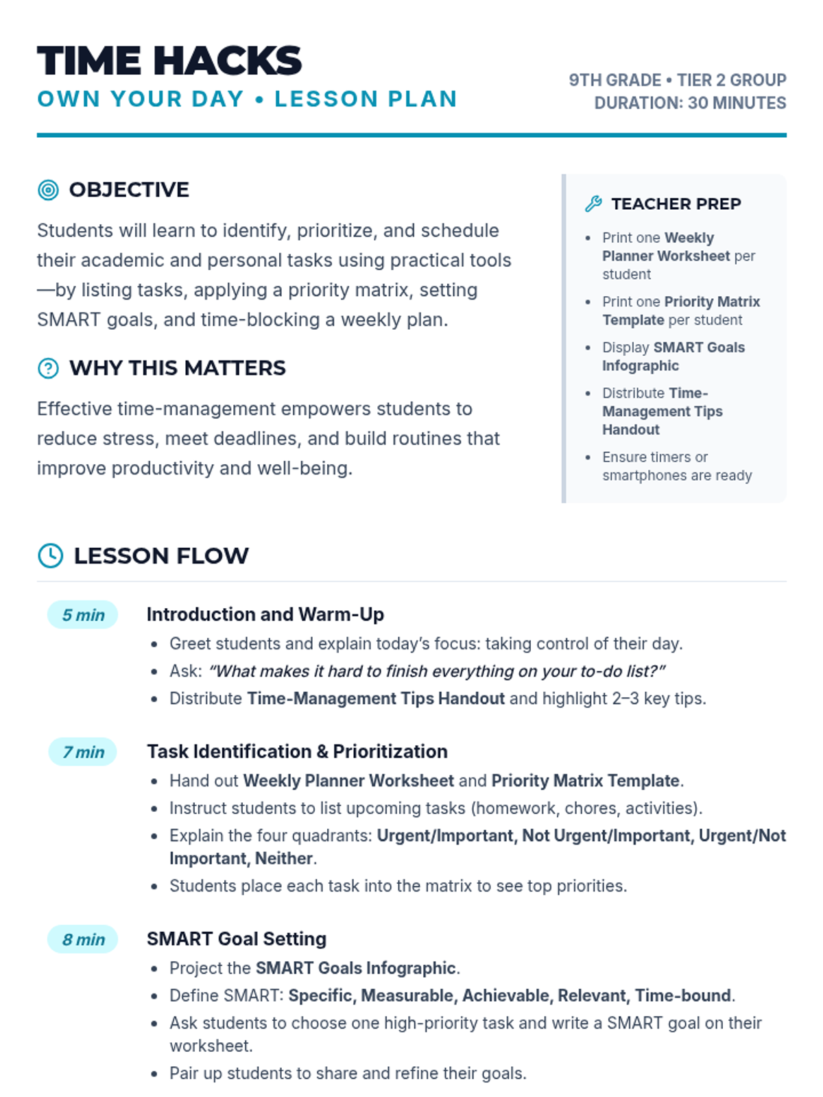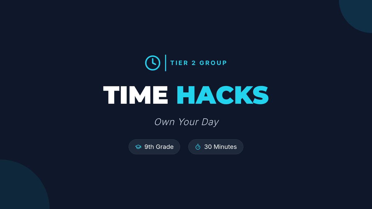 A 30-minute Tier 2 group lesson for 9th graders focused on practical time-management, task prioritization using the Priority Matrix, and goal-setting with the SMART framework.