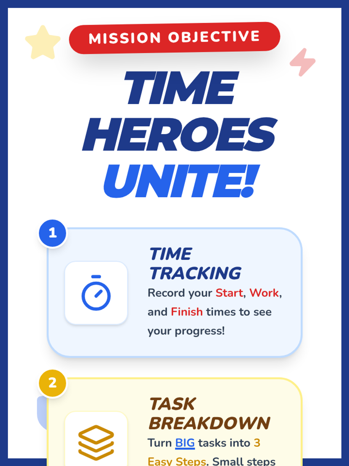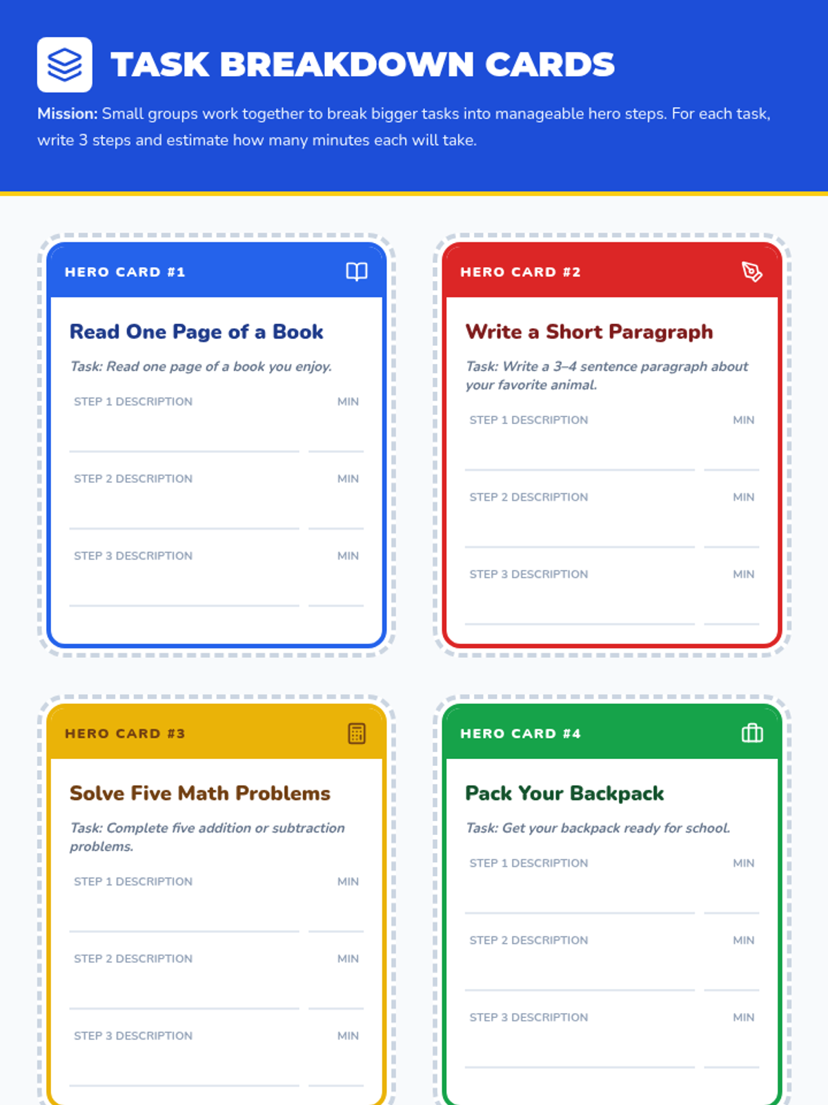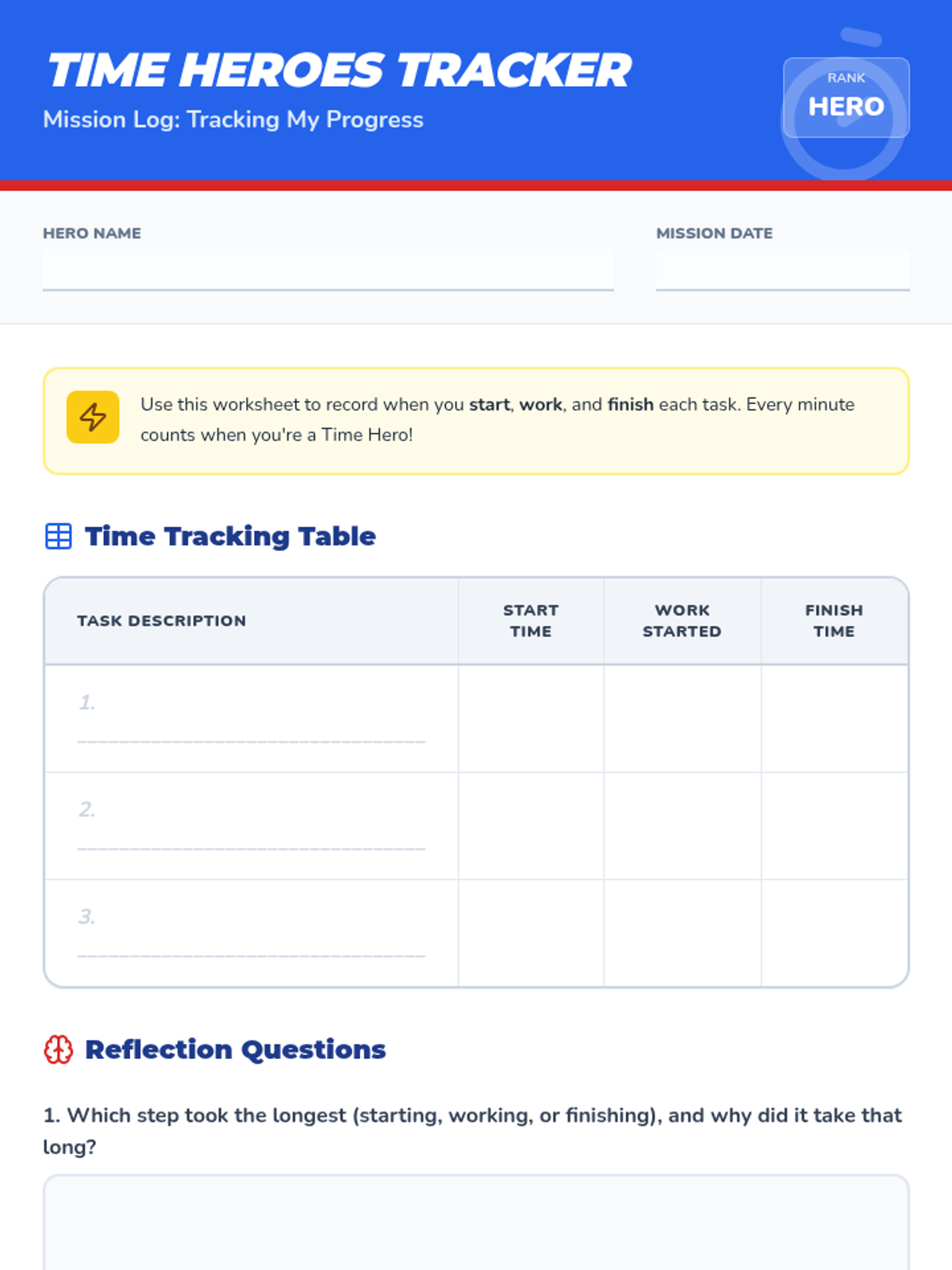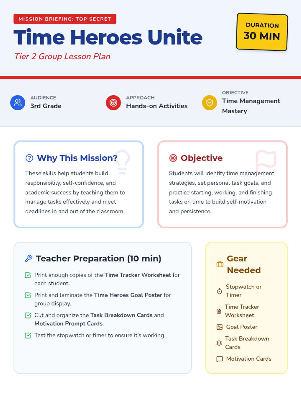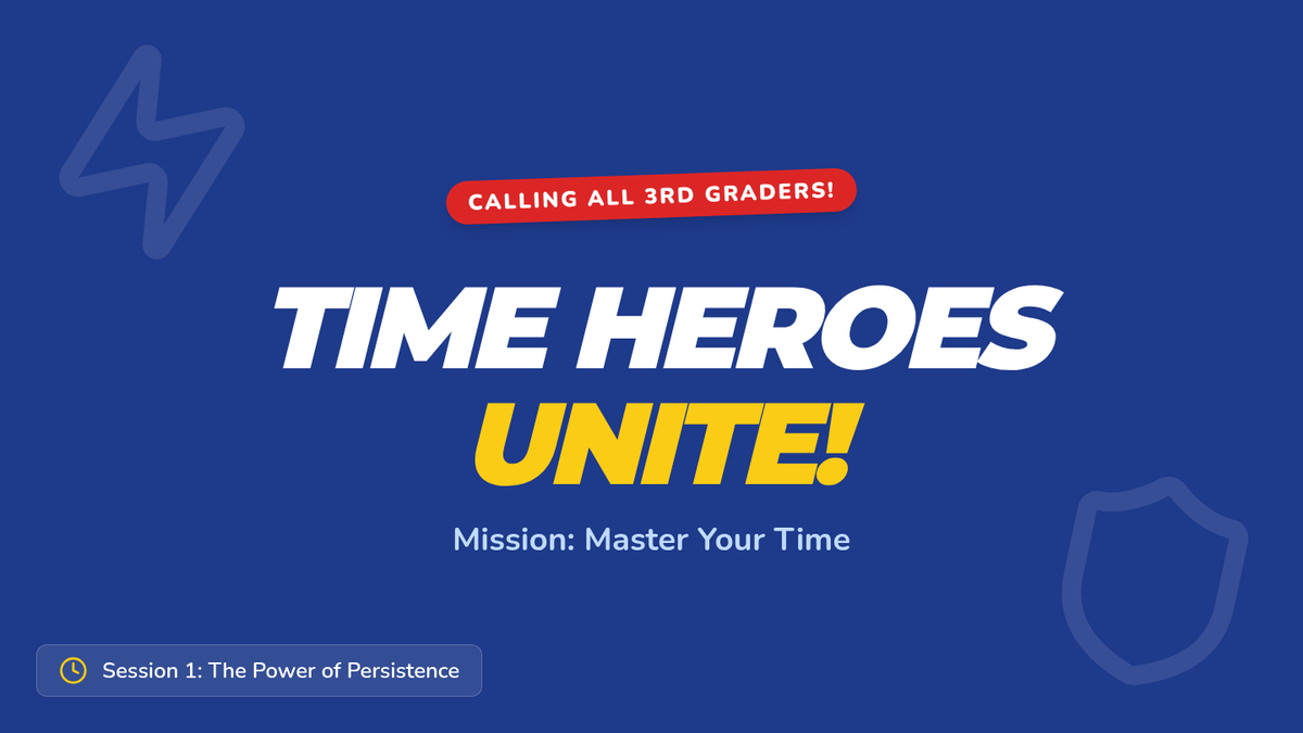 A 30-minute Tier 2 group session for third graders to master time management. Students learn to start, work, and finish tasks on time using superhero-themed strategies, goal-setting, and persistence.