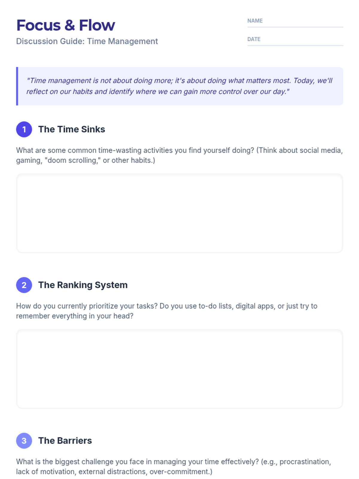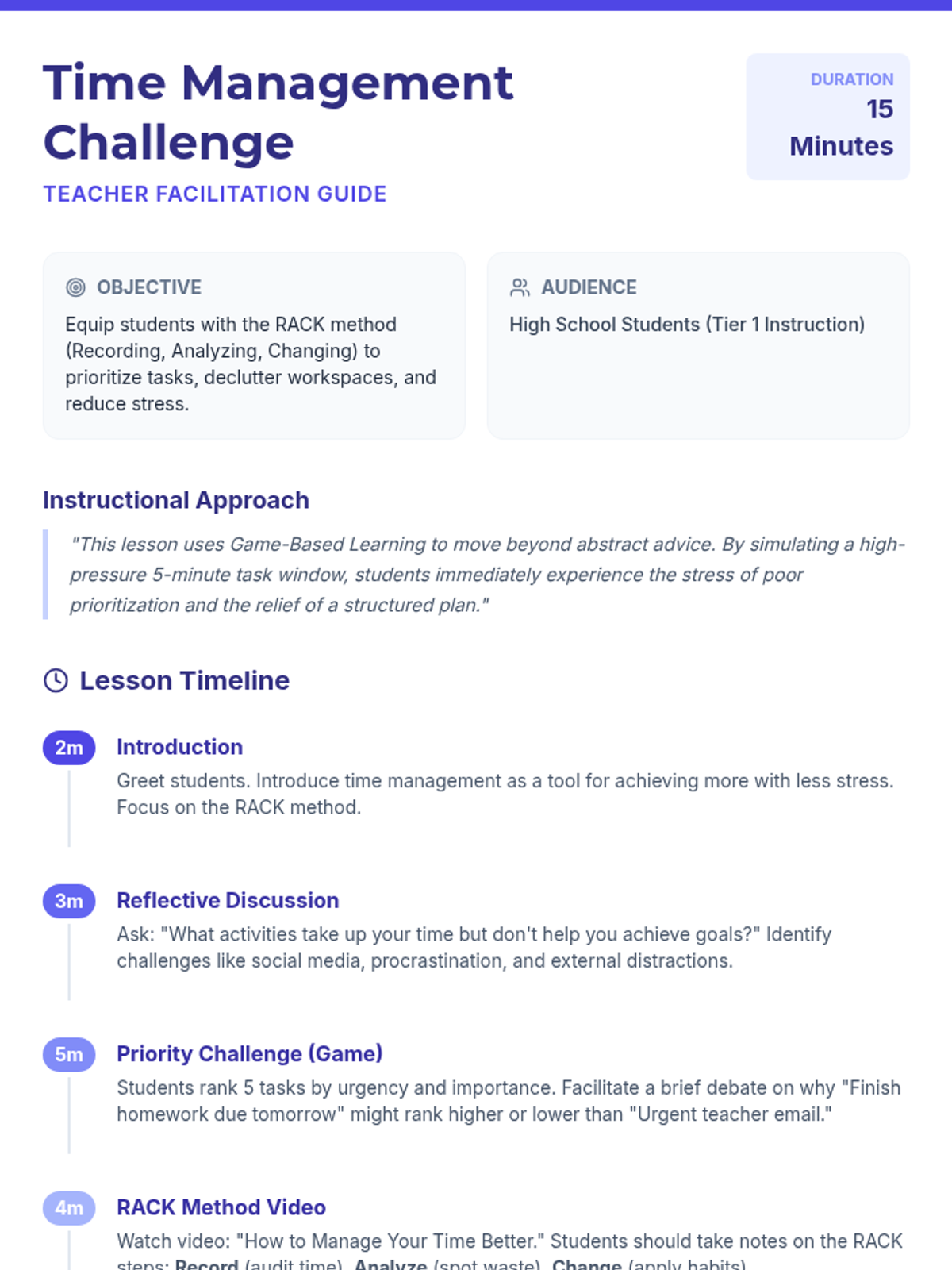 A high-energy lesson for high schoolers that uses the RACK method (Record, Analyze, Change) to master time management through games and reflection.
