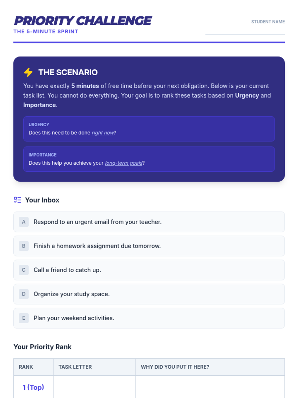 Reframes delayed gratification as a strategic investment. Students analyze the 'ROI' of their time and credits, participating in a simulation that mirrors real-world economic and academic trade-offs.