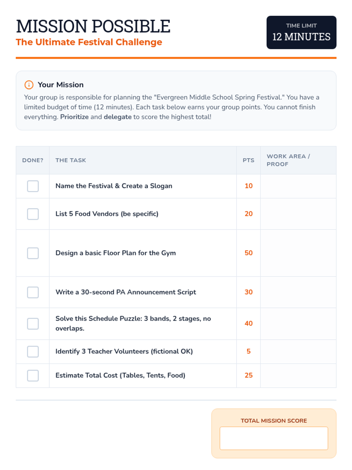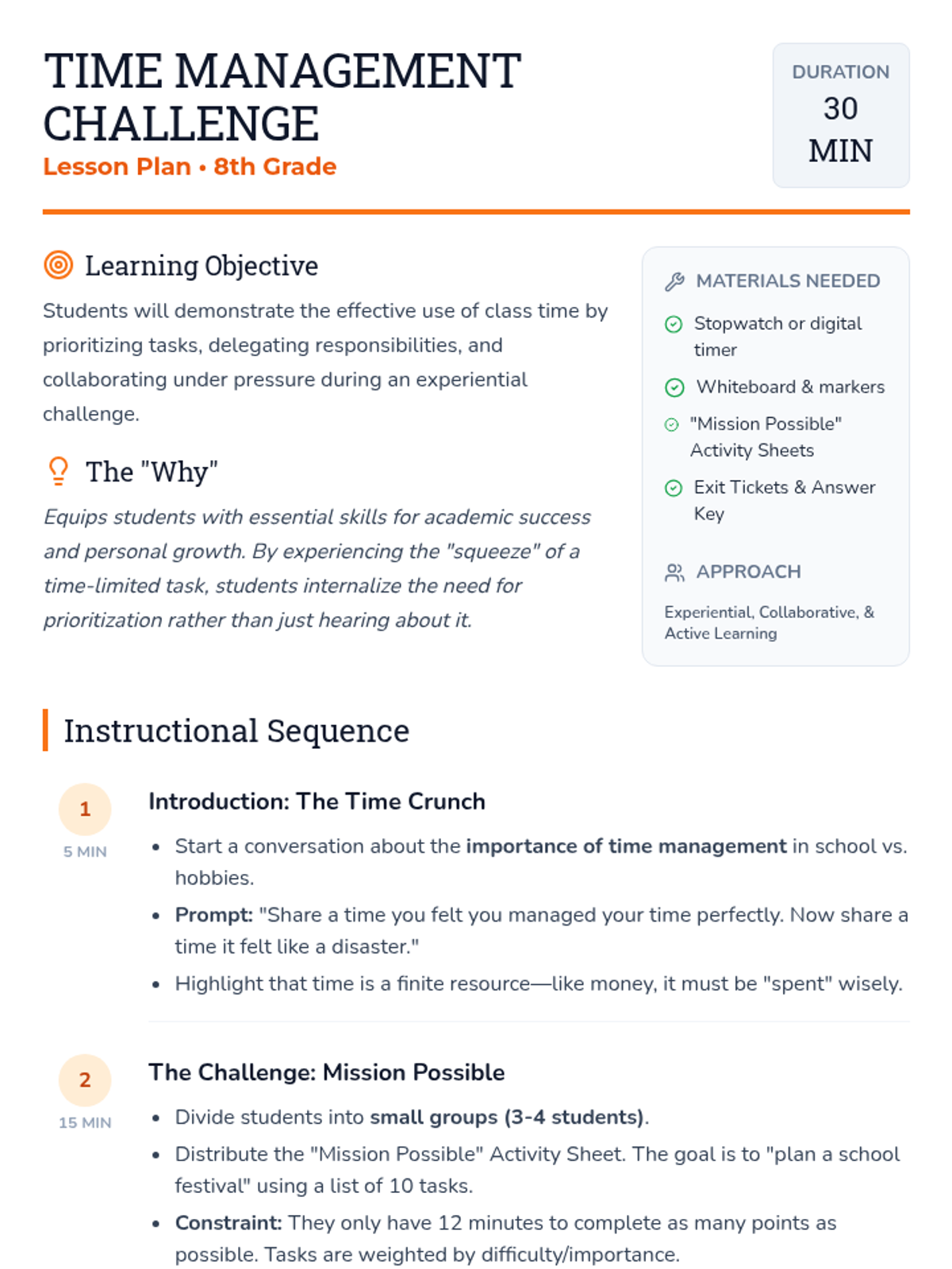 An experiential 30-minute lesson for 8th graders to master time management through a high-stakes collaborative challenge and reflective discussion.