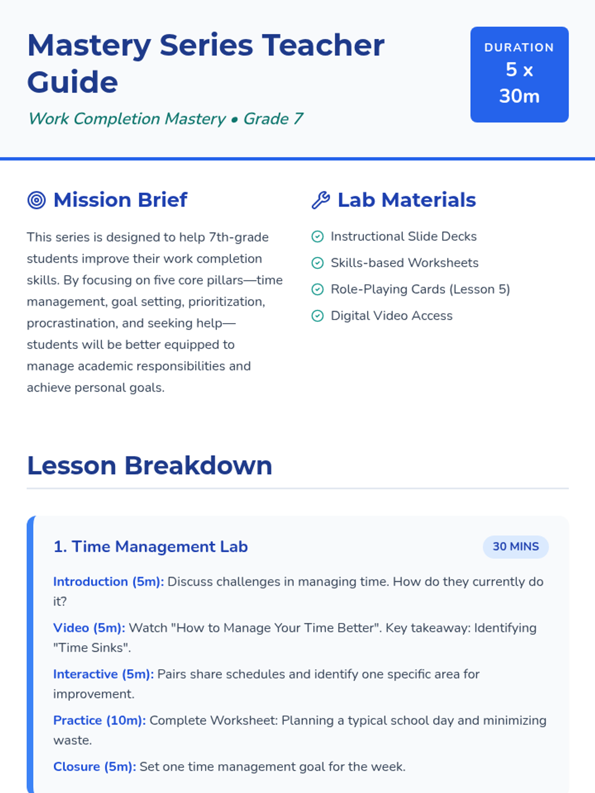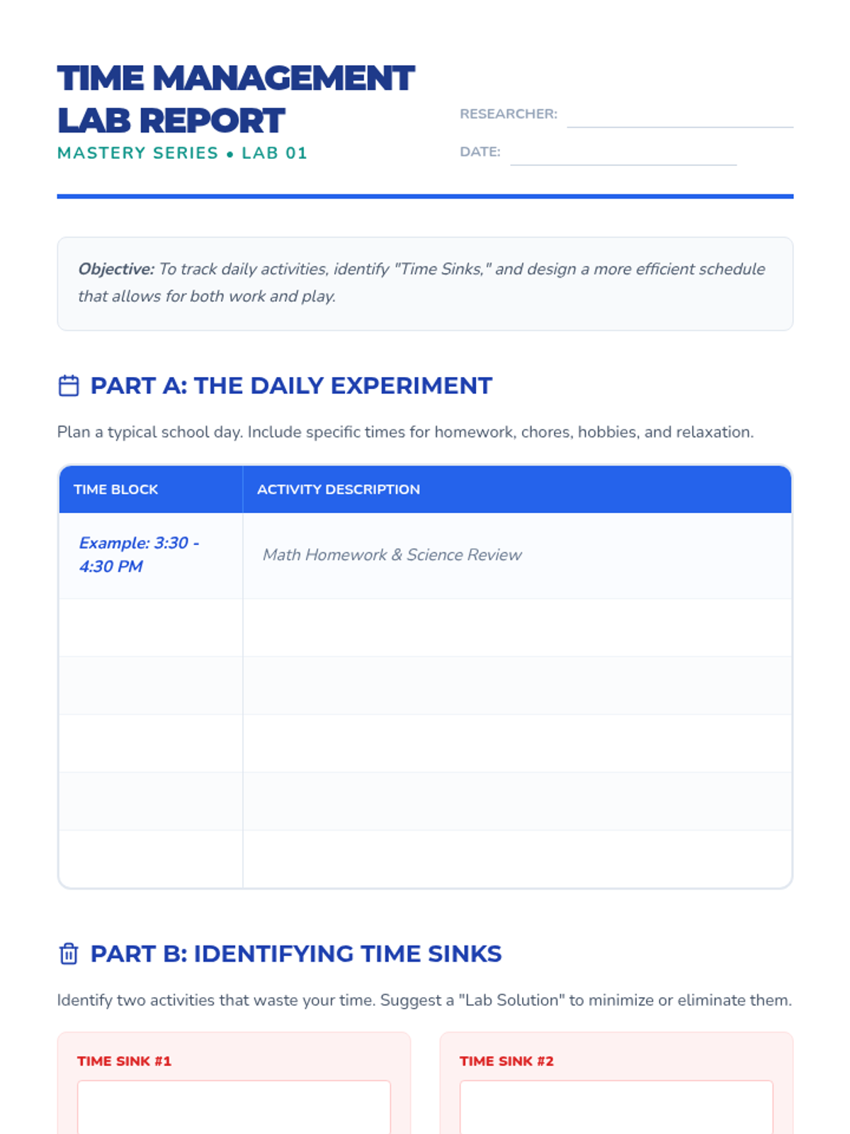 Students learn to track their time, identify time-wasters, and create a functional daily schedule.