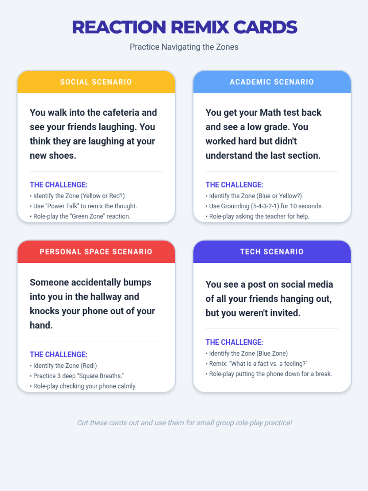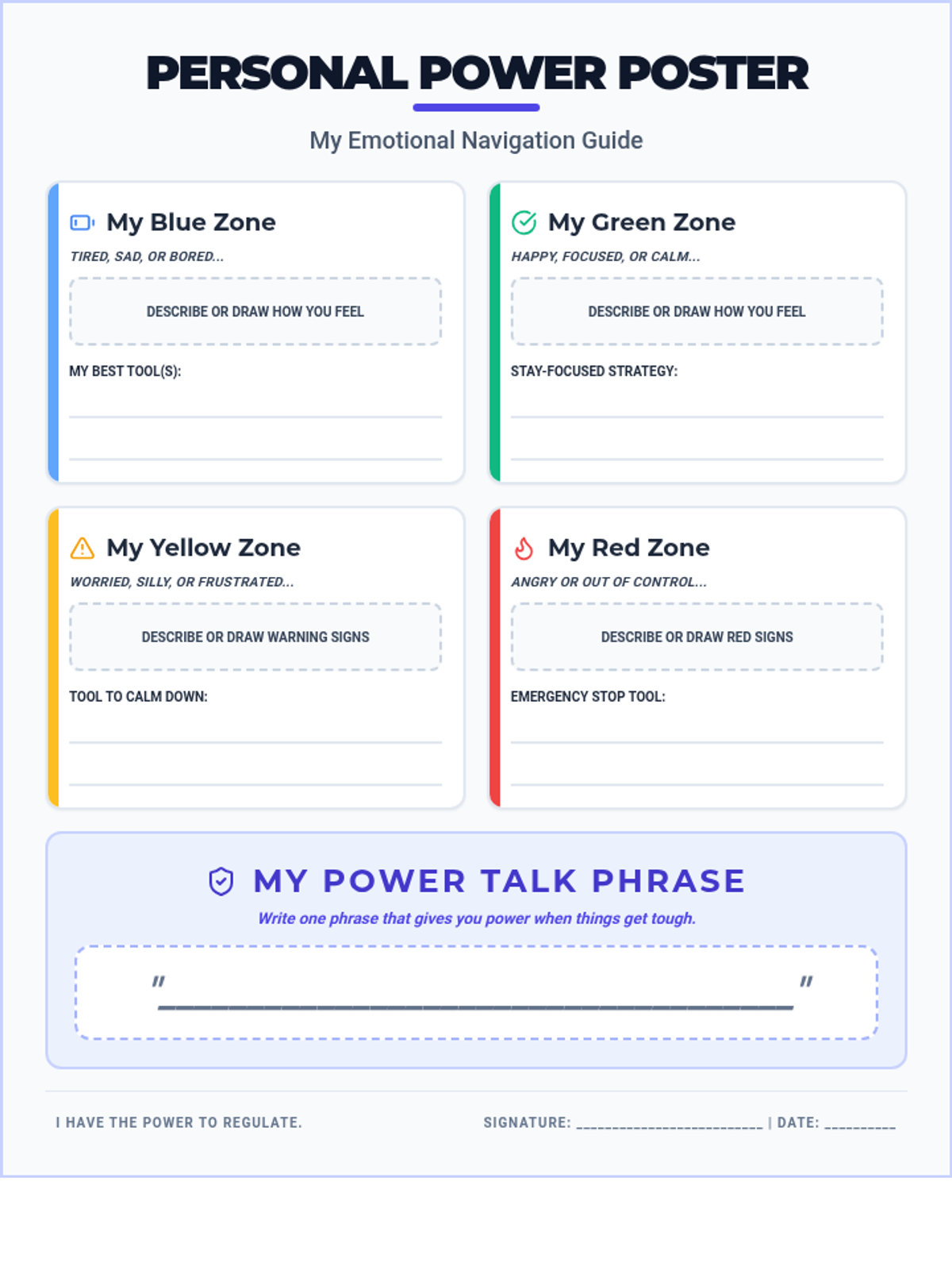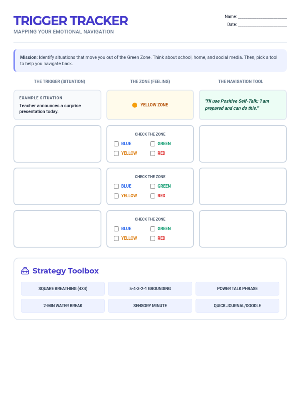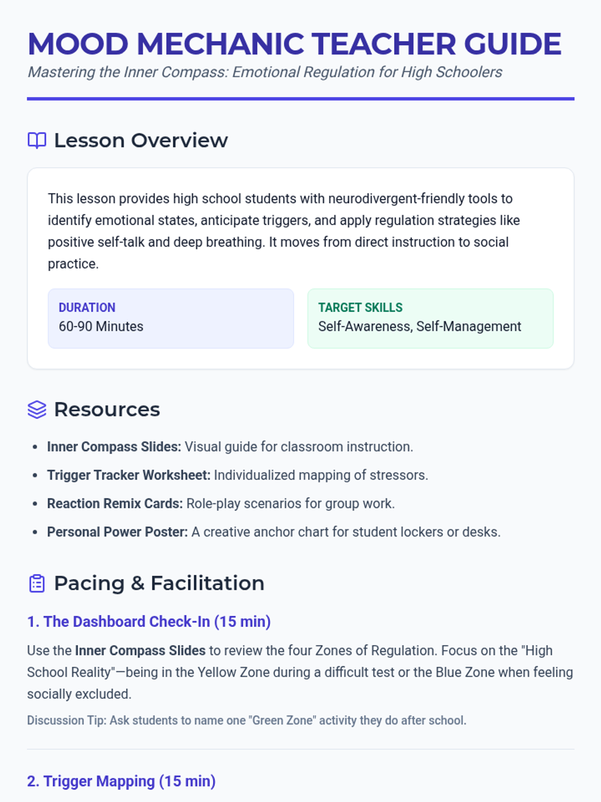 A comprehensive lesson for high school special education students to master emotional regulation through the Zones of Regulation, trigger identification, and calming strategies.