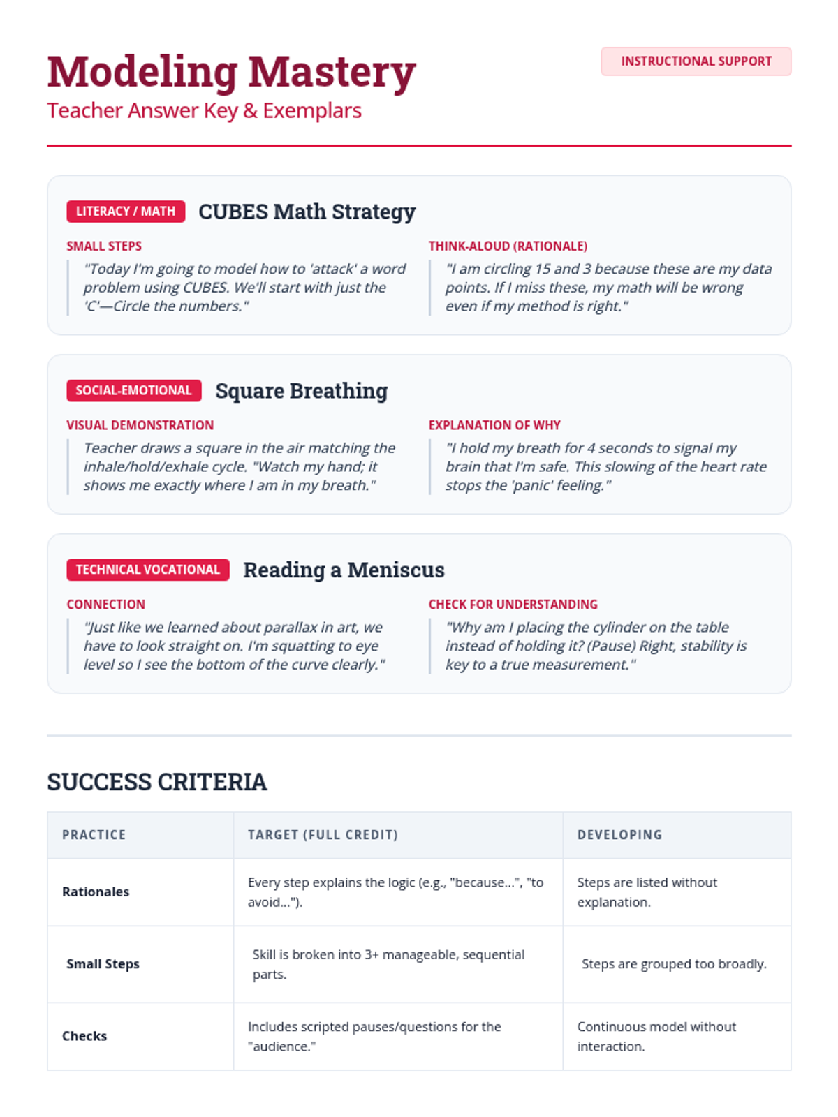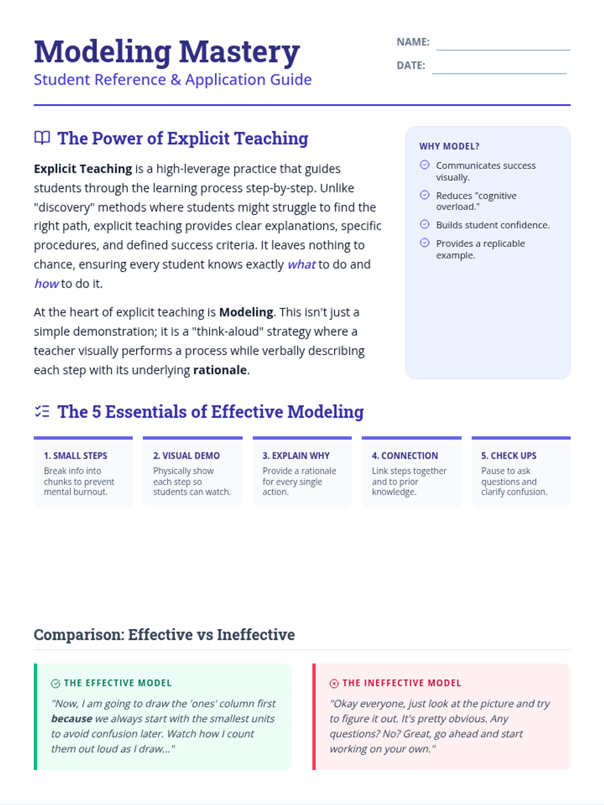A lesson on the principles of explicit teaching and the strategy of teacher modeling, including key practices for effective implementation and analysis of modeling examples.