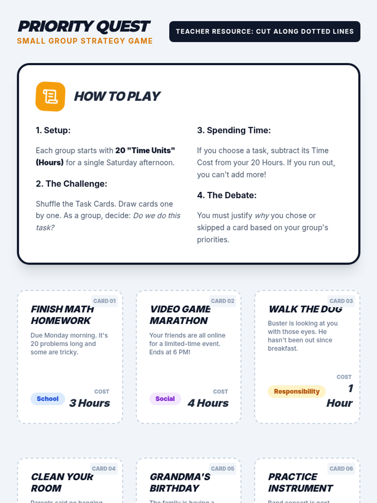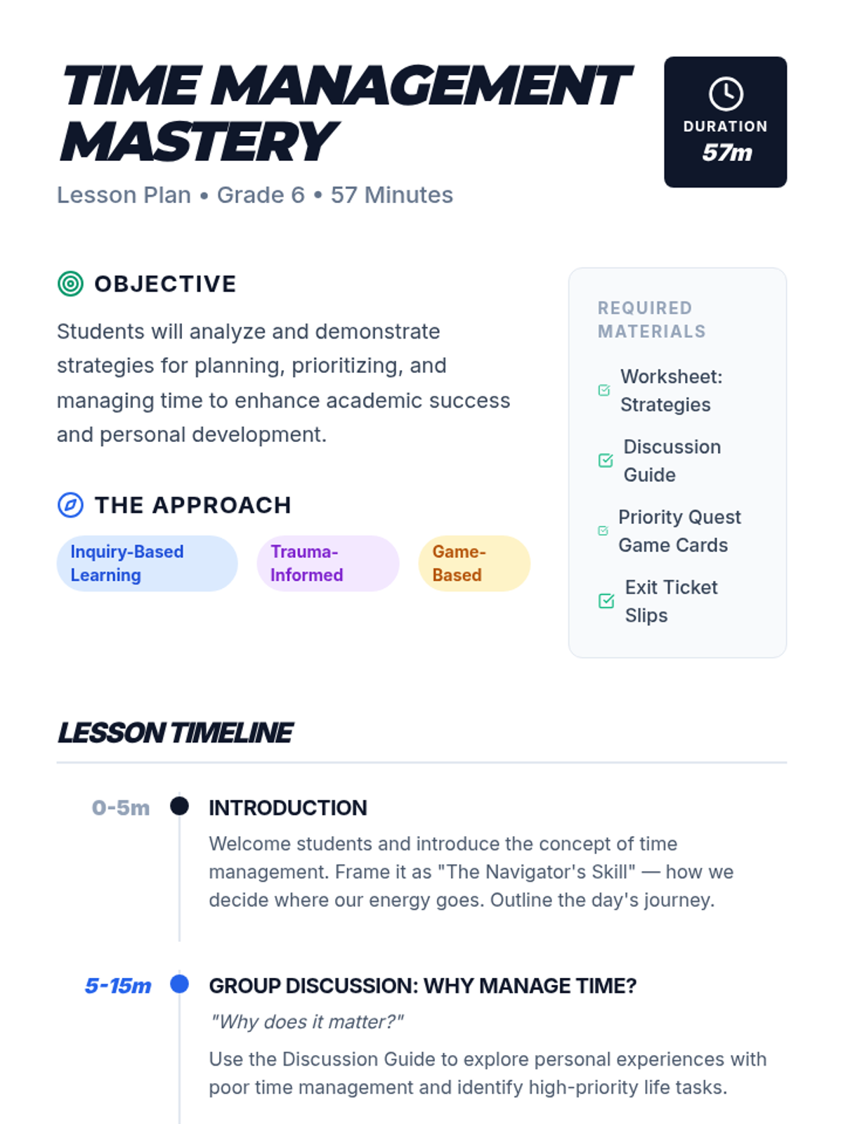 A comprehensive 6th-grade lesson on time management, featuring interactive discussions, a strategic worksheet, and a priority-based game. Students learn to navigate their schedules with ease and intentionality.