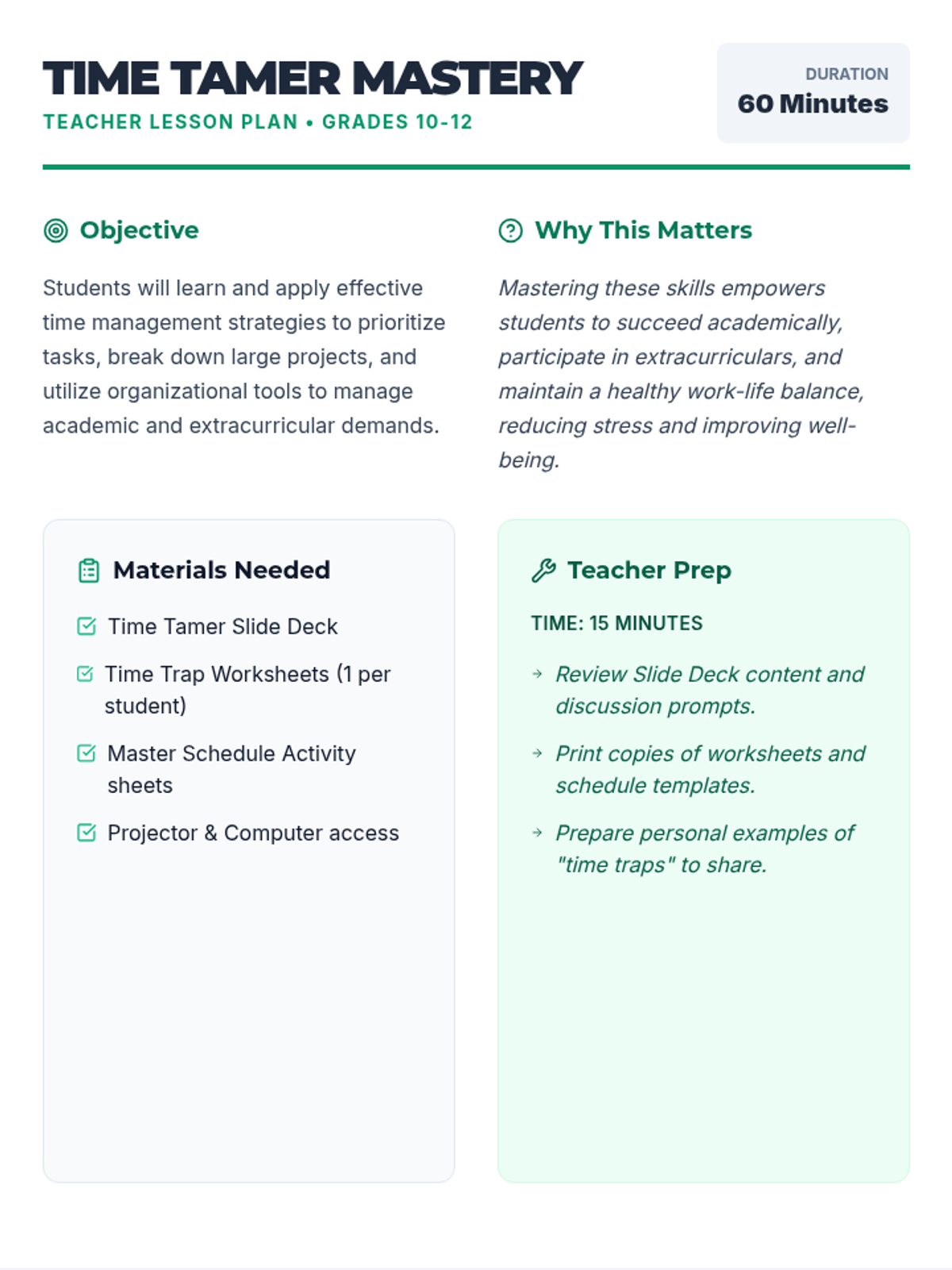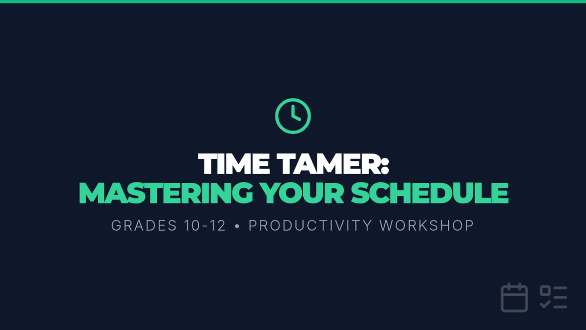 A comprehensive lesson for 10th-12th graders to master time management. Students will identify time-wasting habits, learn prioritization techniques like the Eisenhower Matrix, and build a personalized weekly schedule to balance academics, extracurriculars, and well-being.
