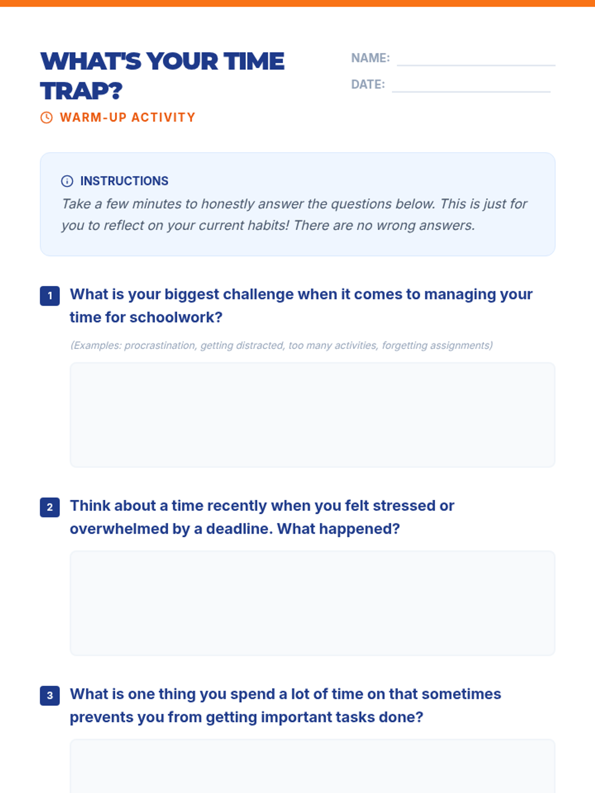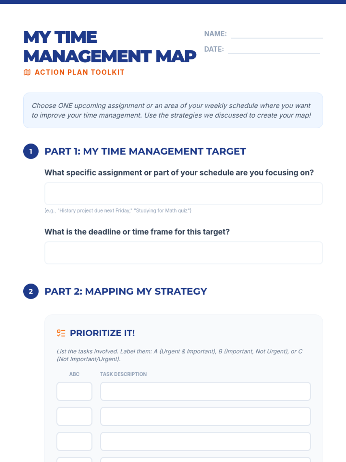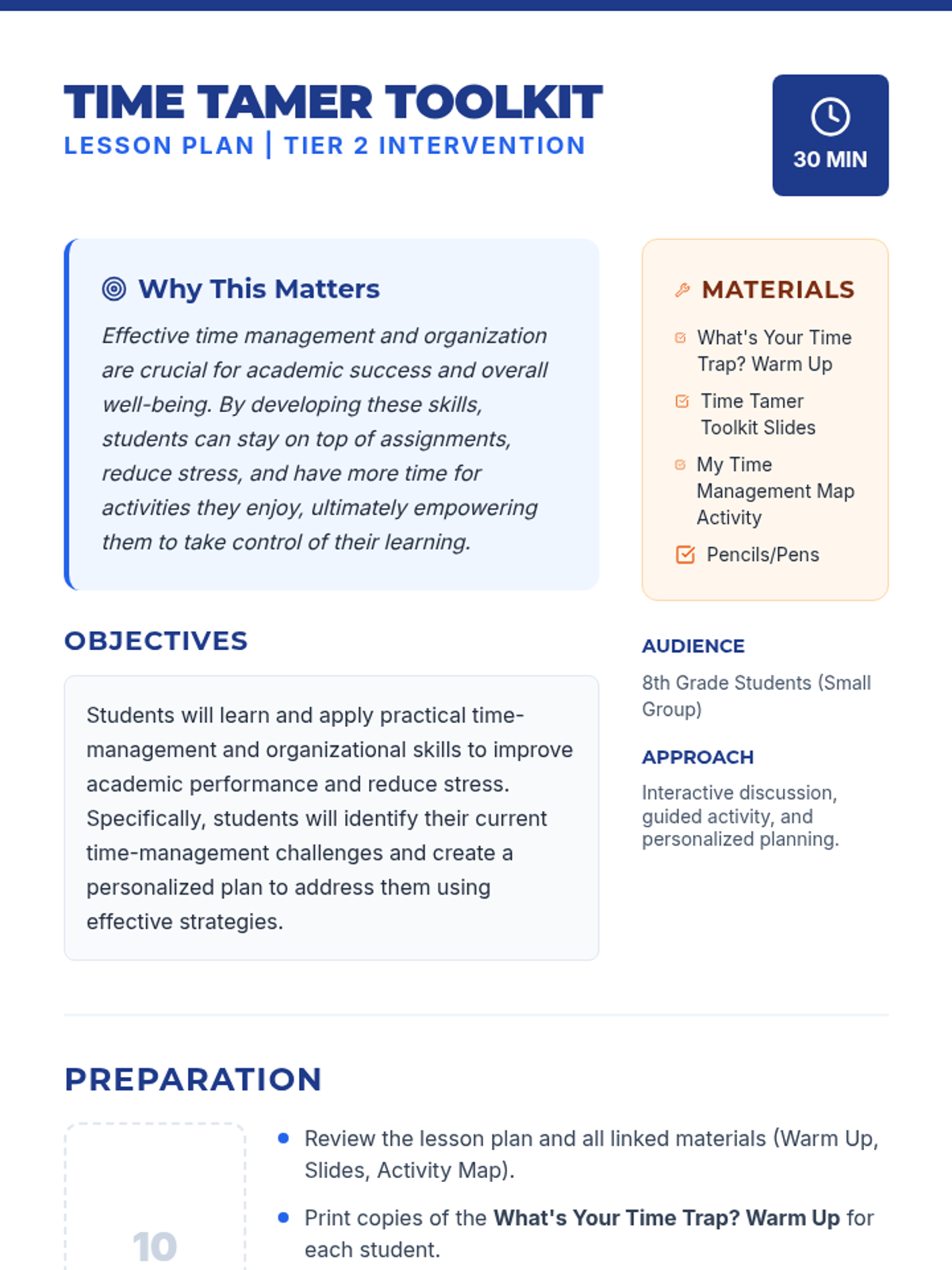 A small-group Tier 2 lesson for 8th graders focused on practical time-management strategies, task prioritization, and stress reduction through effective planning.