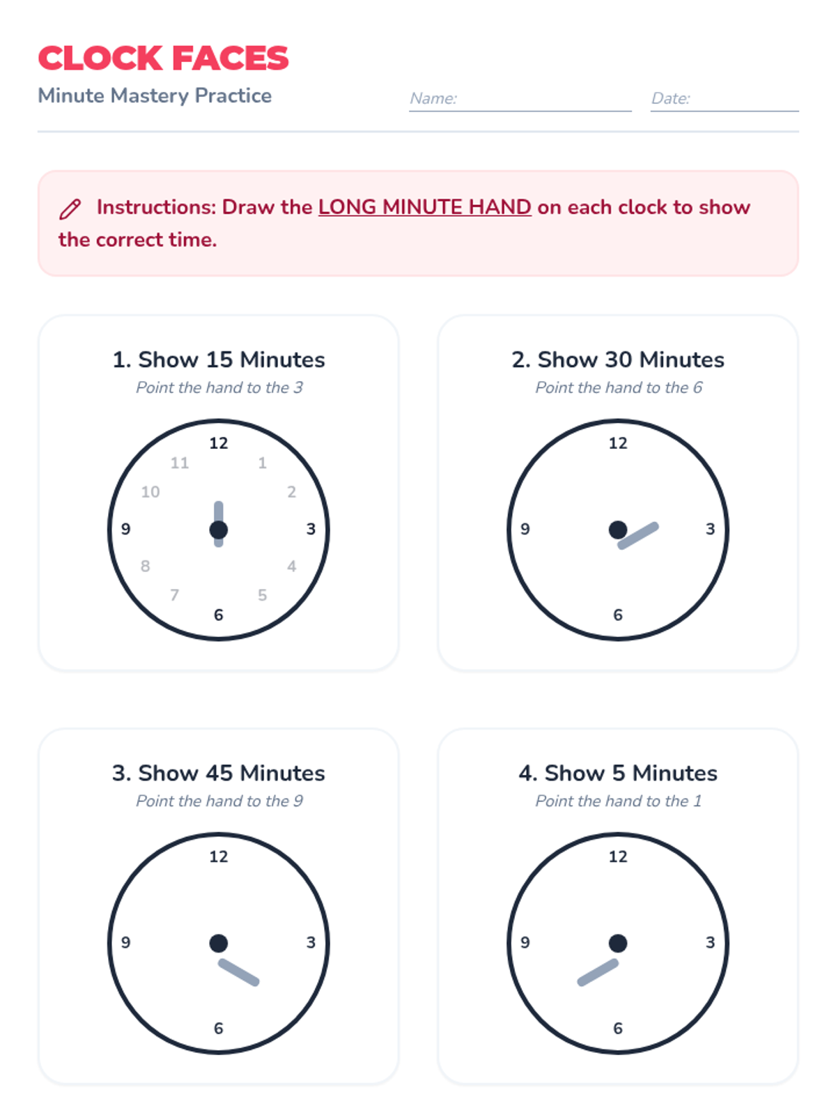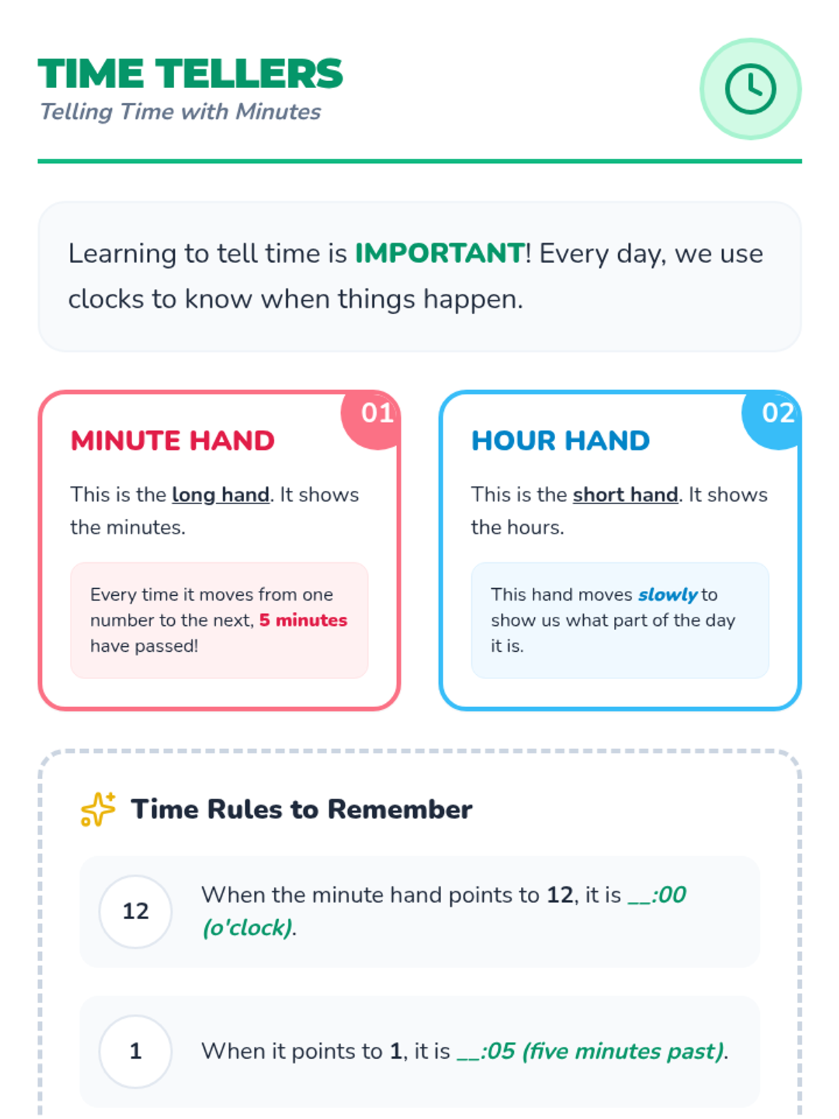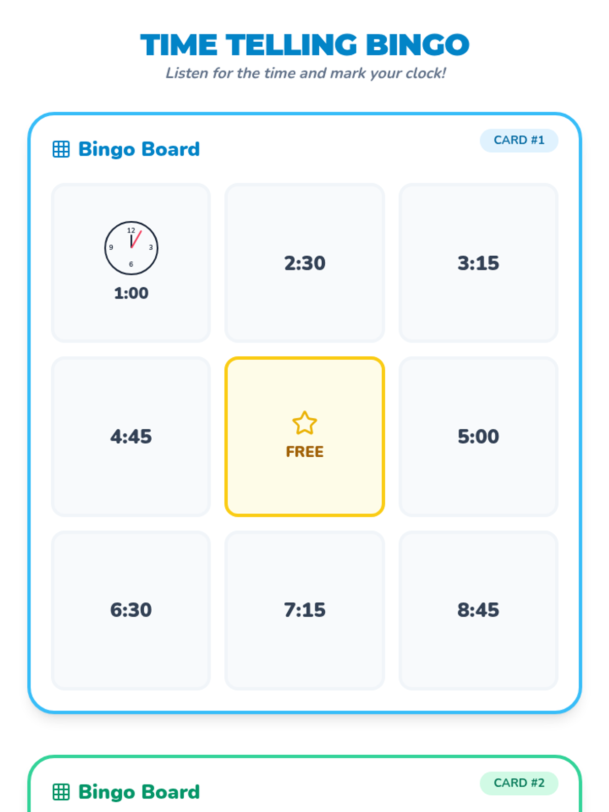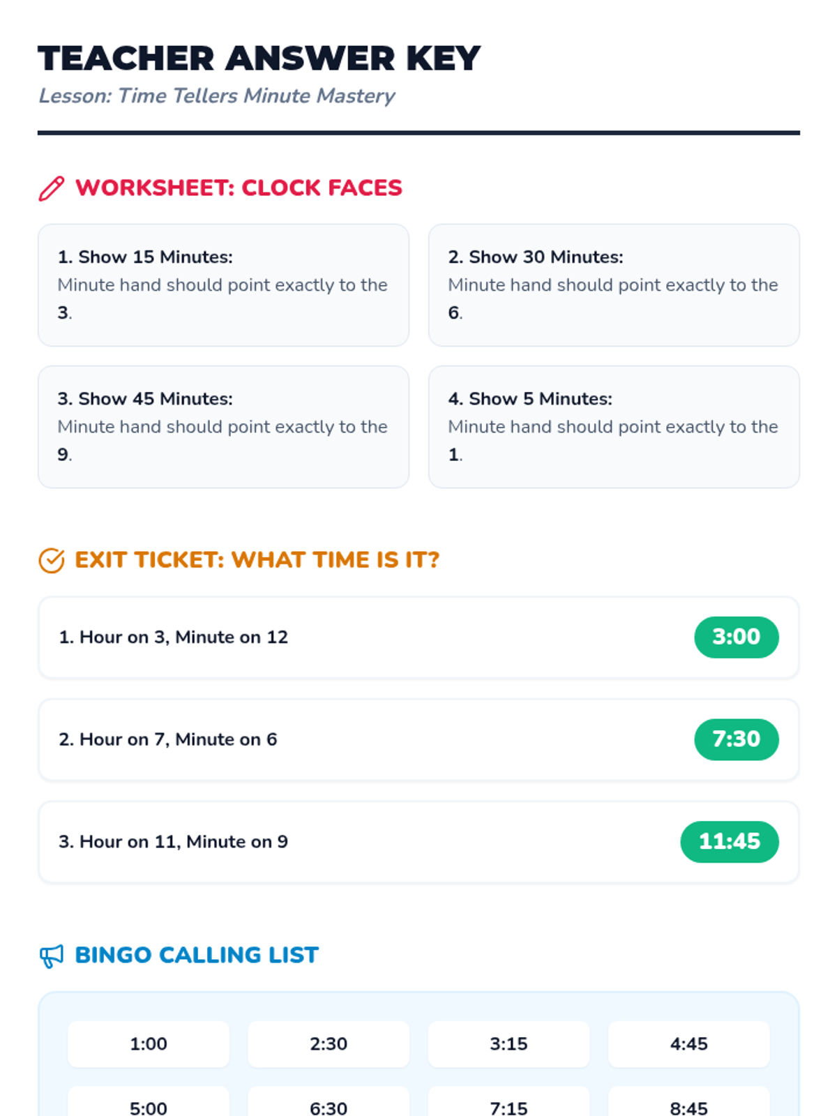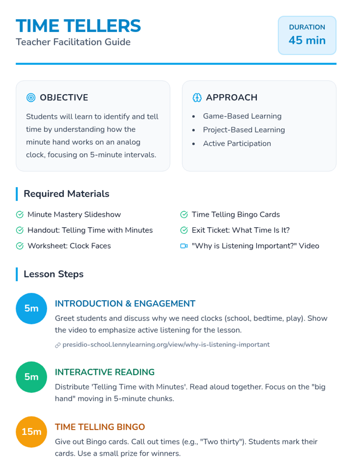 A comprehensive 1st-grade lesson on telling time by understanding the minutes on a clock, featuring interactive bingo, drawing activities, and a video on active listening.