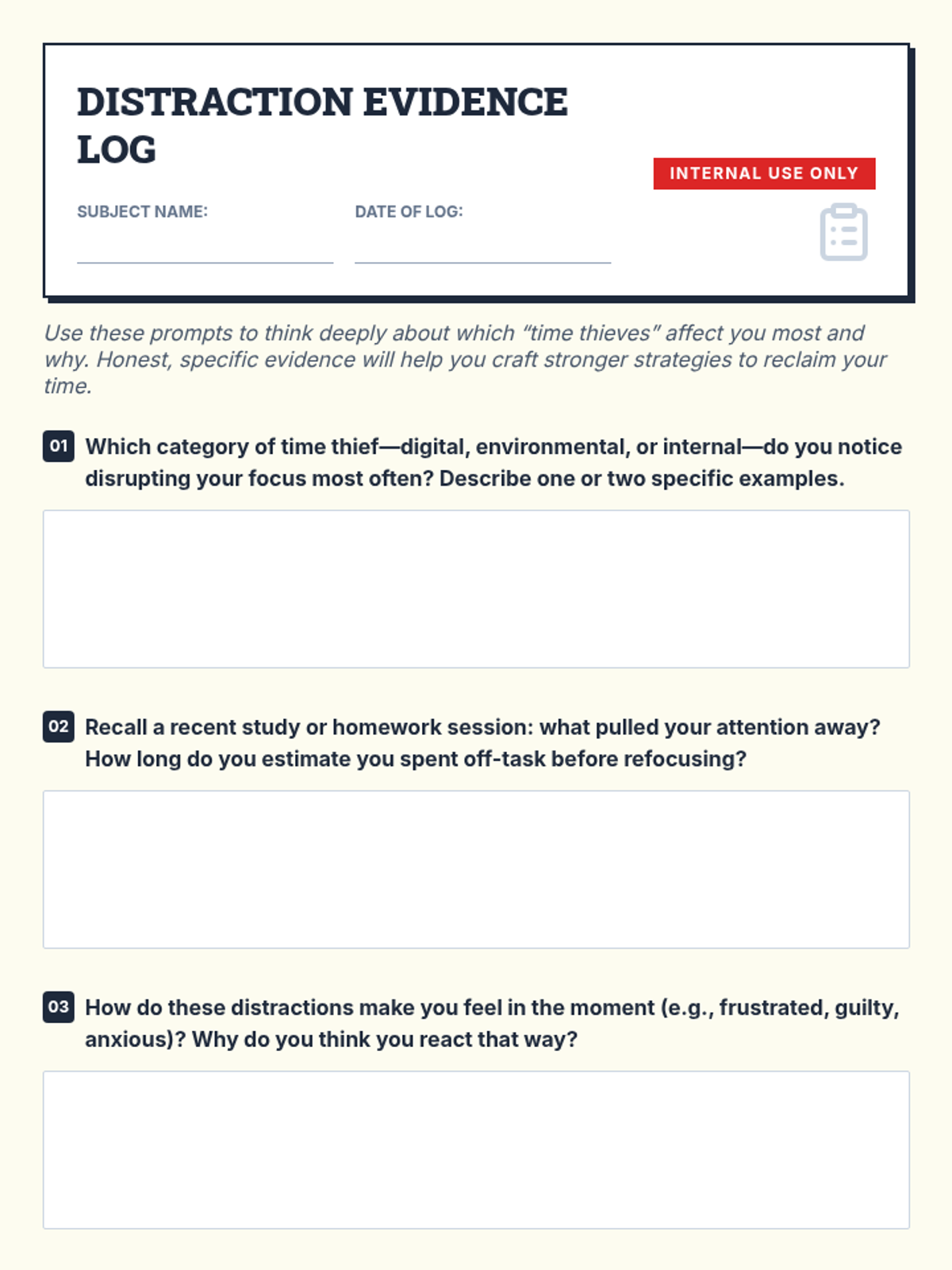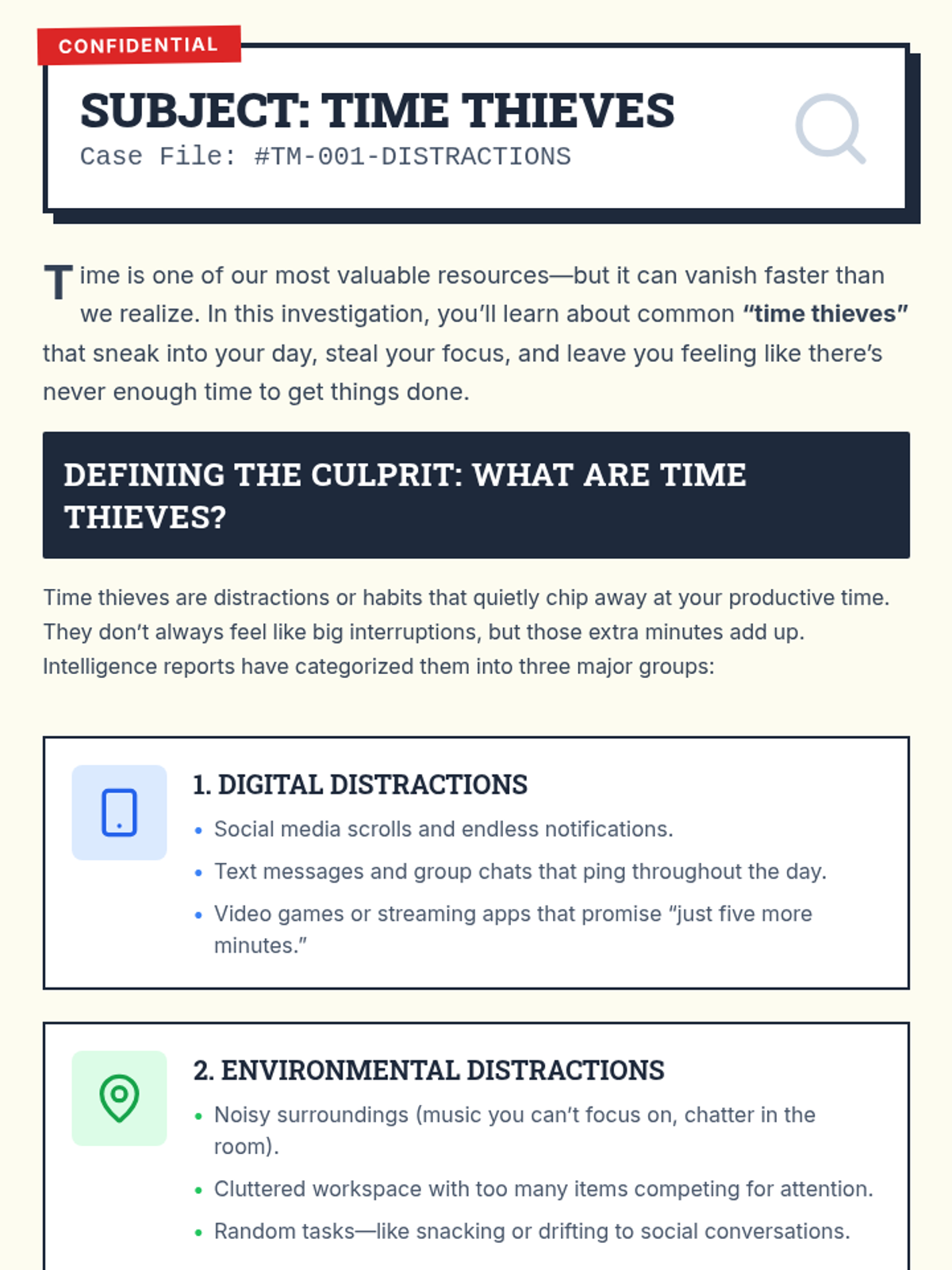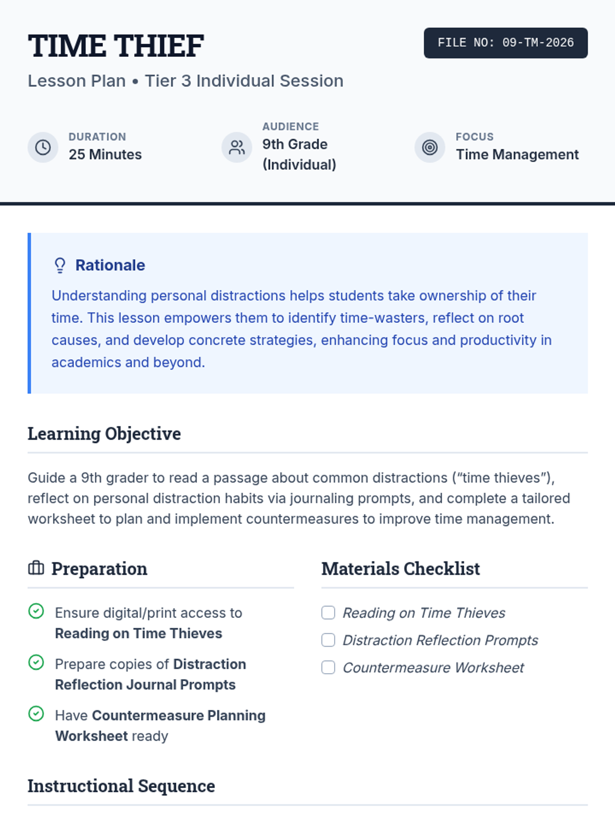 A 25-minute Tier 3 individualized lesson helping 9th graders identify 'time thieves' and develop concrete countermeasures for better focus.