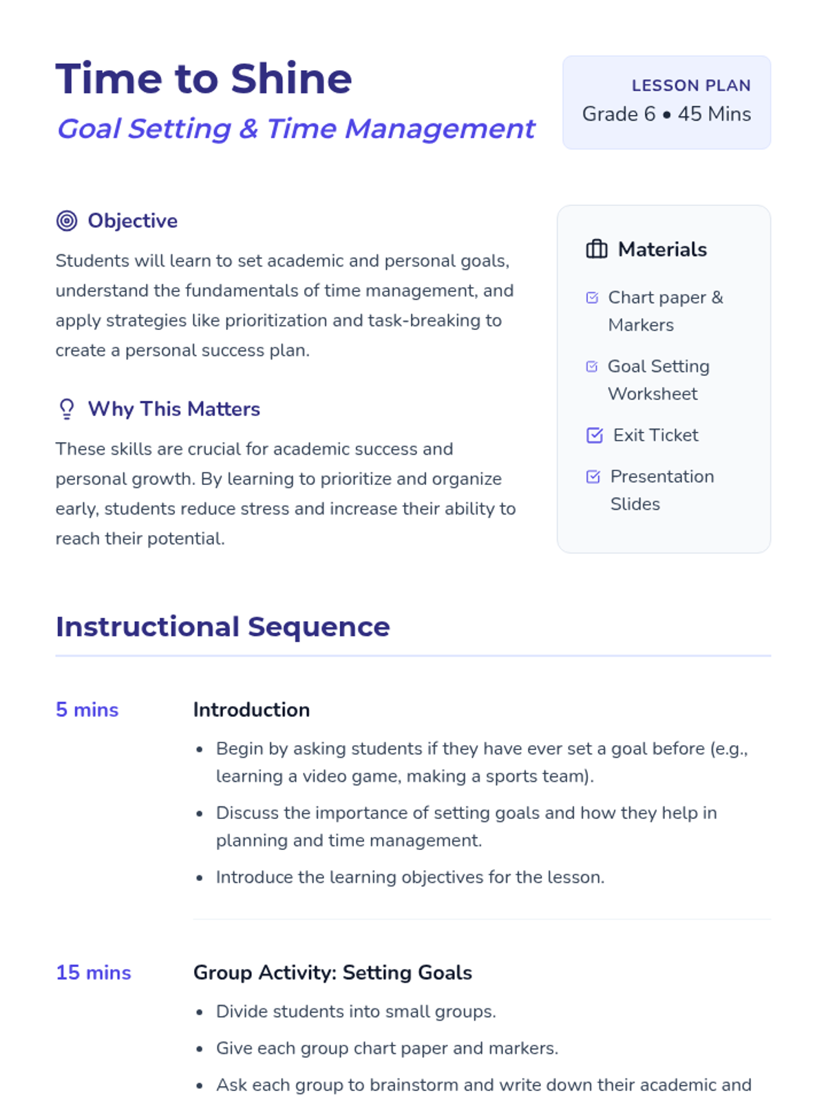 This lesson teaches Grade 6 students how to set SMART goals and manage their time effectively using practical strategies like prioritization and task-breaking. Students will engage in group brainstorming and individual planning to create their own 'star charts' for success.