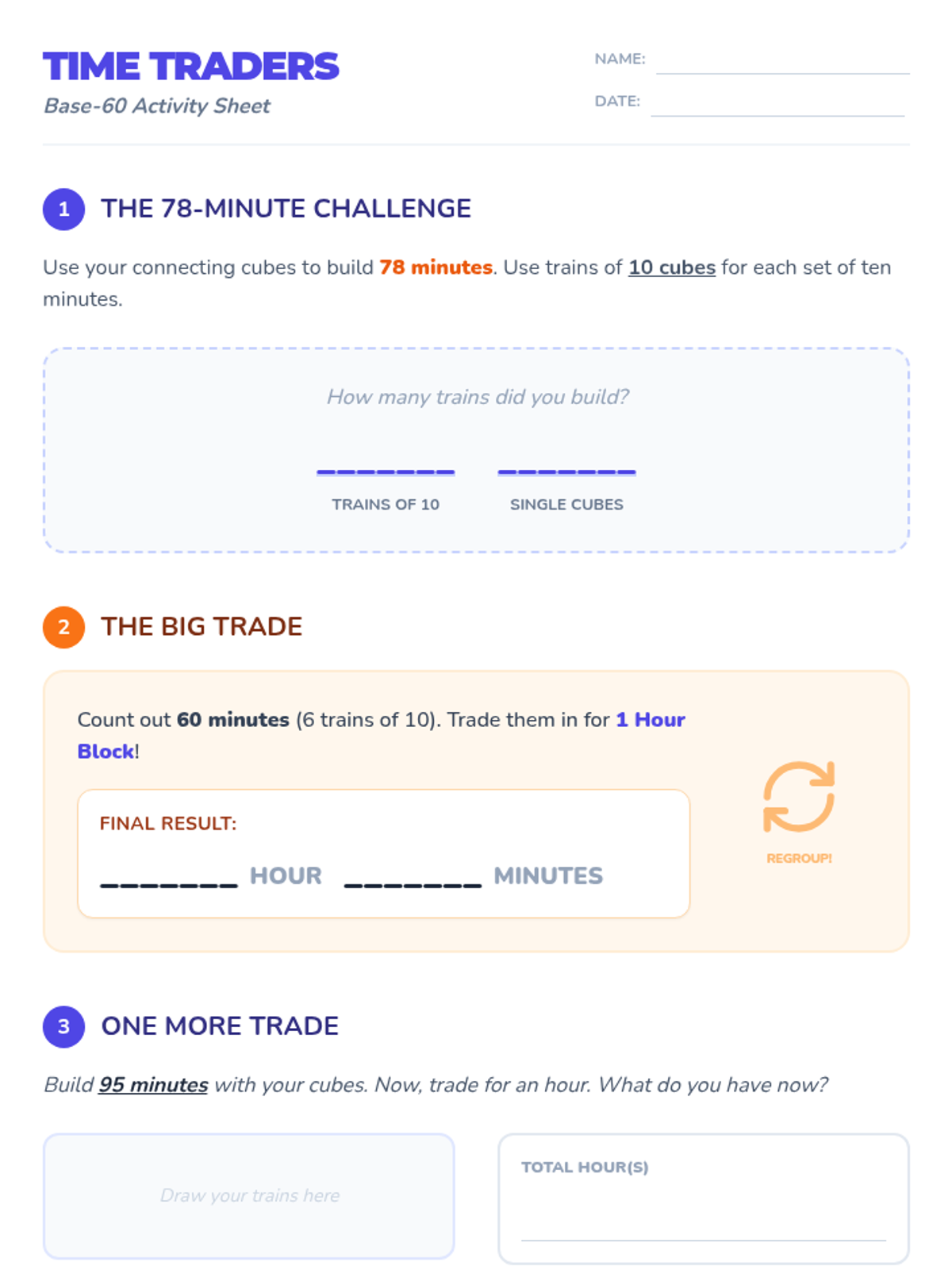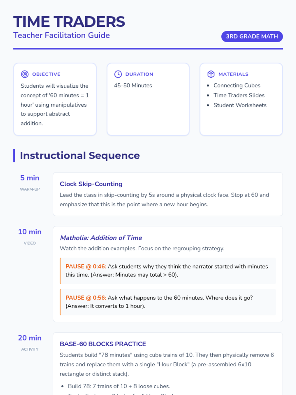 Students will master the concept of time regrouping (60 minutes = 1 hour) through a hands-on 'Base-60' activity using connecting cubes, supported by a visual lesson on adding and subtracting time.