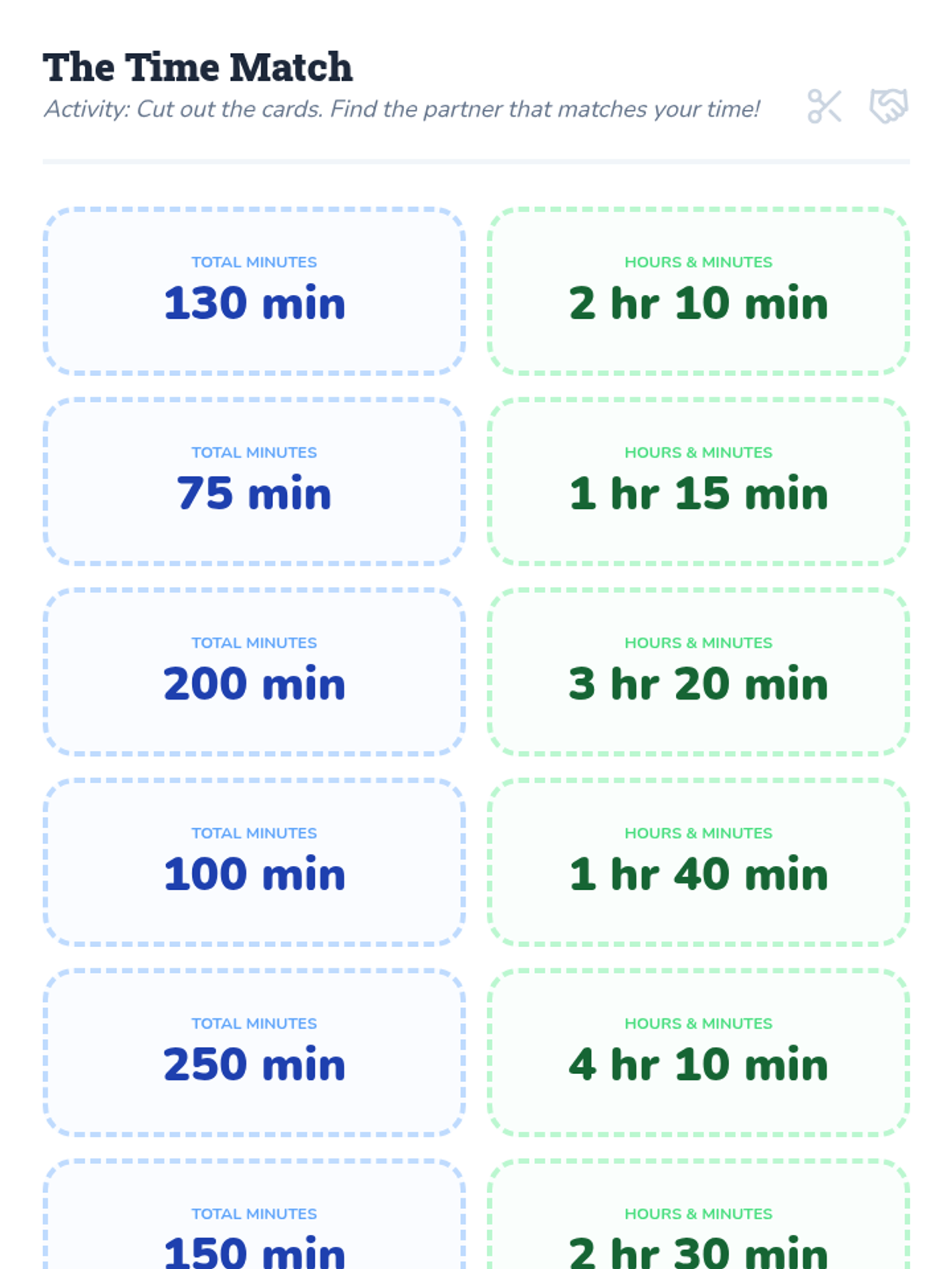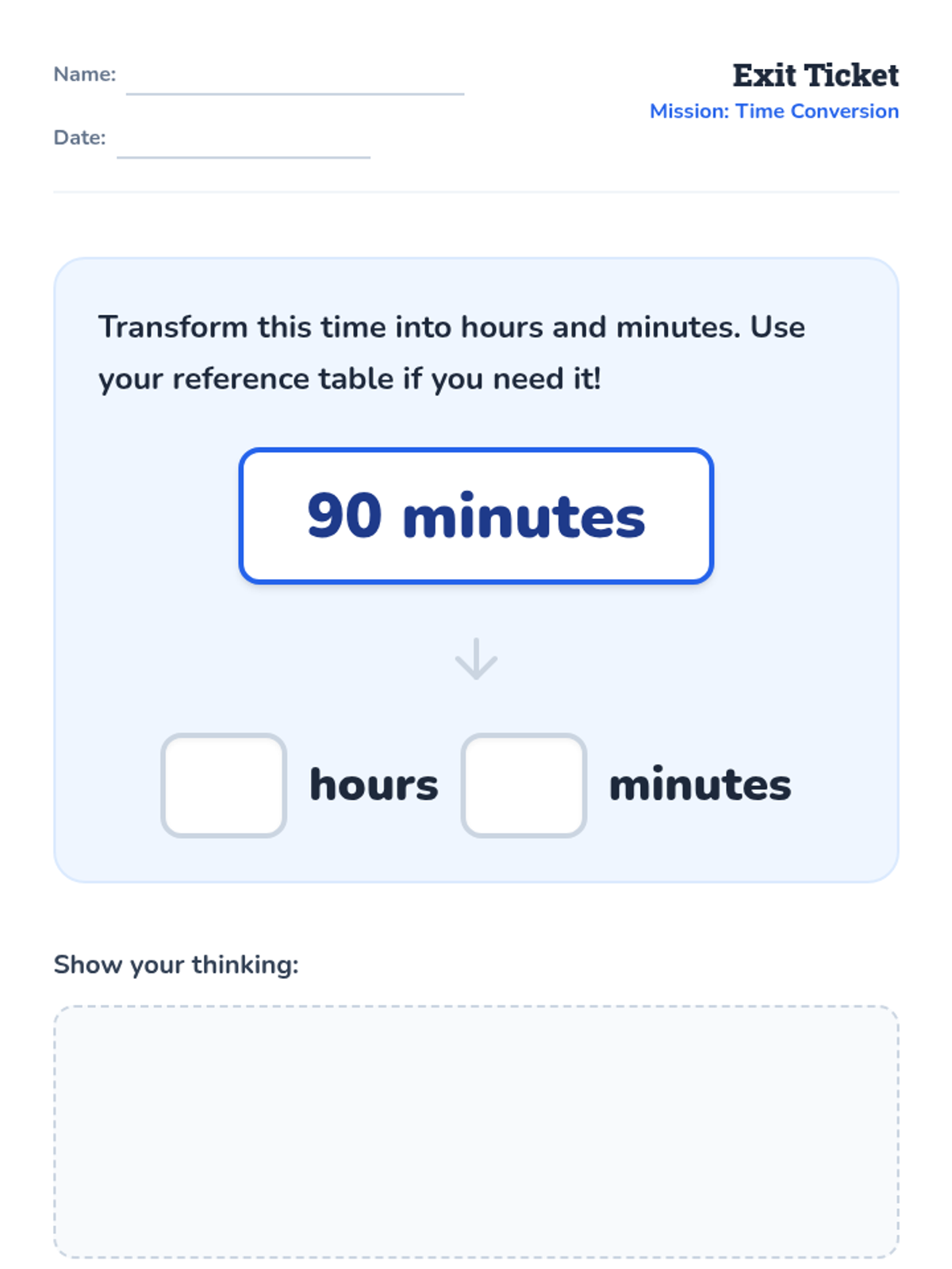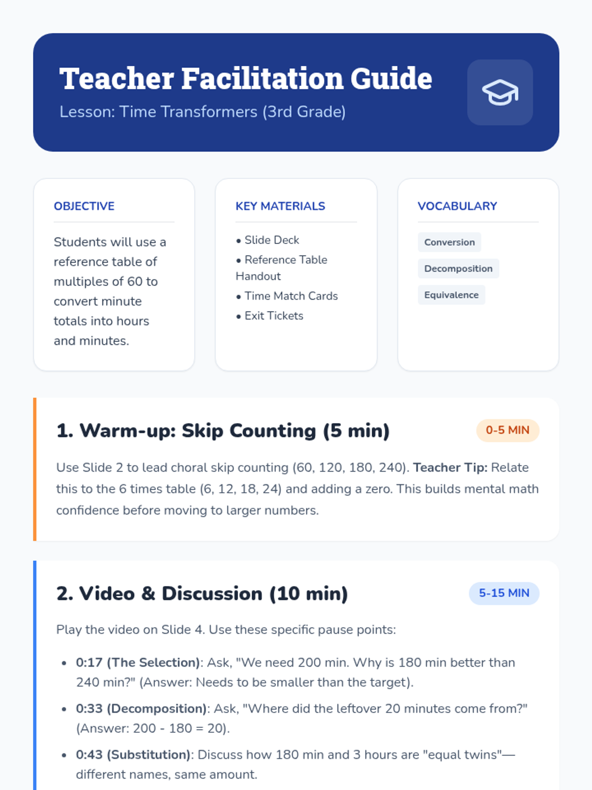 Students will learn to convert large minute totals into hours and minutes using a reference table of multiples of 60. The lesson includes a warm-up, a video demonstration, a partner matching activity, and an exit ticket.