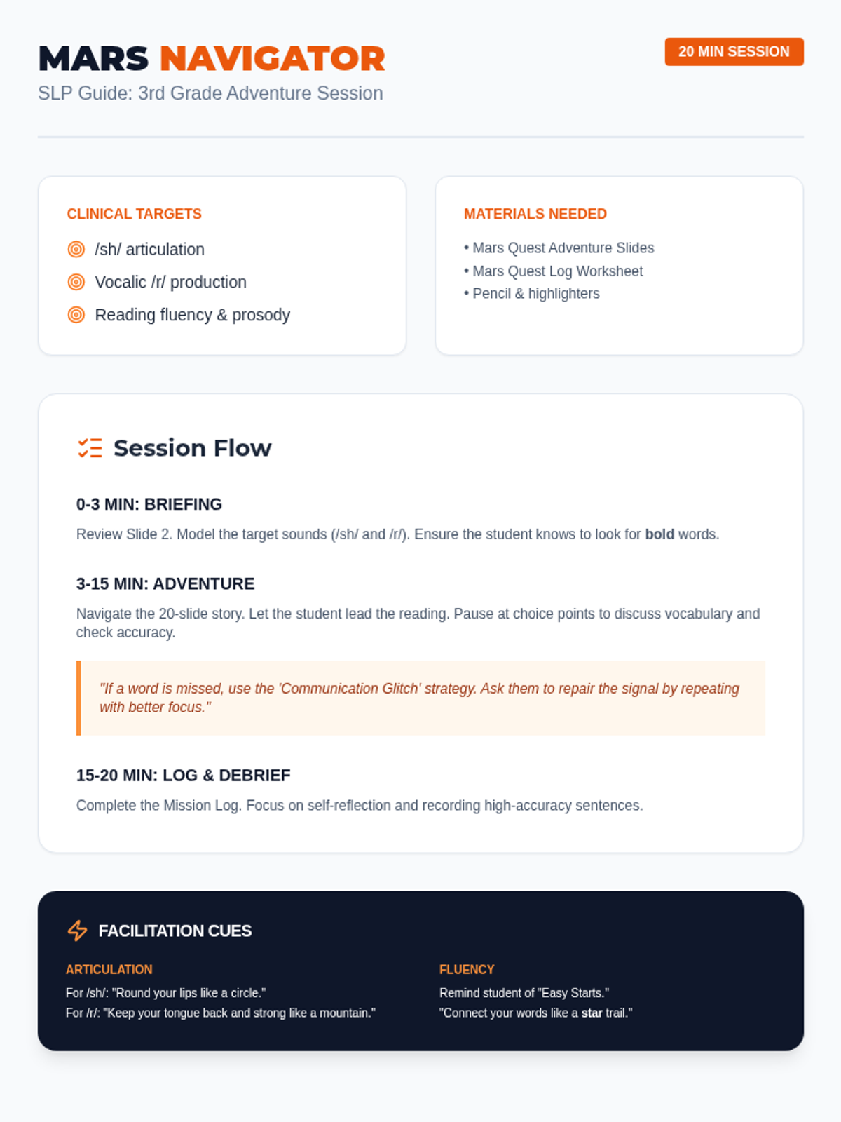 A 20-minute speech-language therapy session focused on mixed articulation, fluency, and intelligibility goals using space-themed narrative prompts. Students practice target sounds and repair strategies while narrating a mission to Mars.
