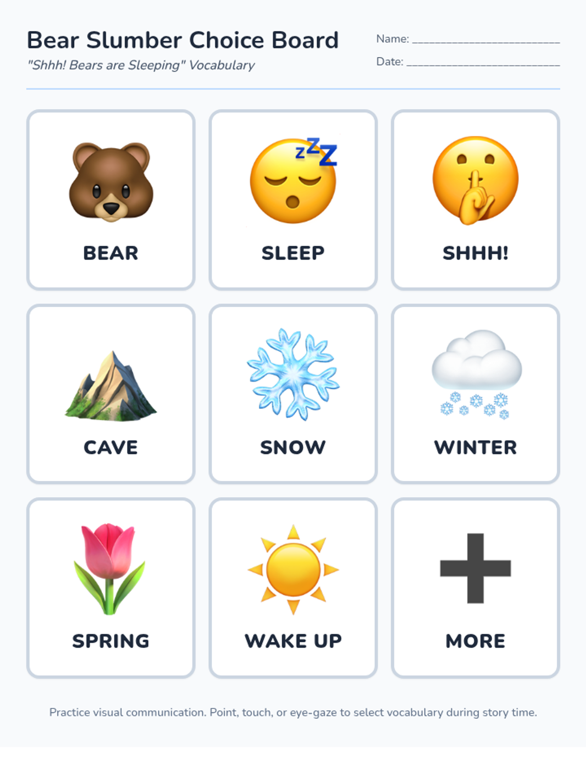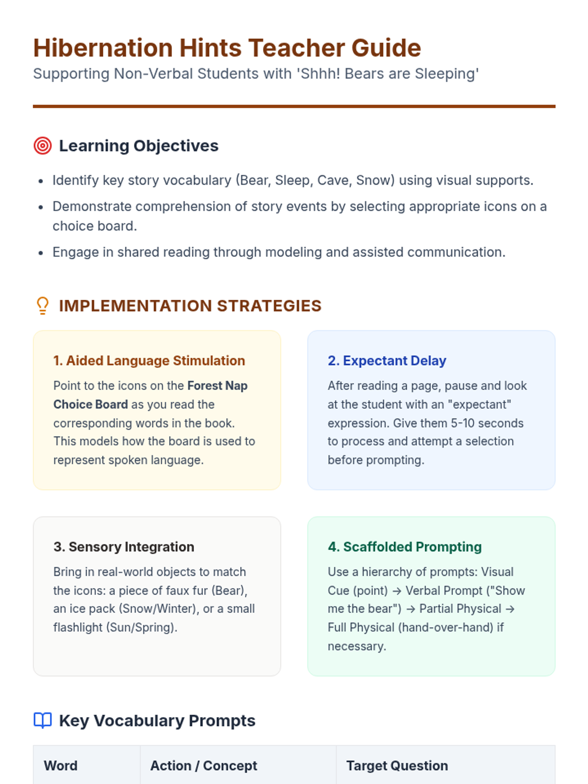 A foundational literacy lesson for non-verbal students focusing on the book 'Shhh! Bears are Sleeping', using visual supports to build vocabulary related to hibernation and seasons.