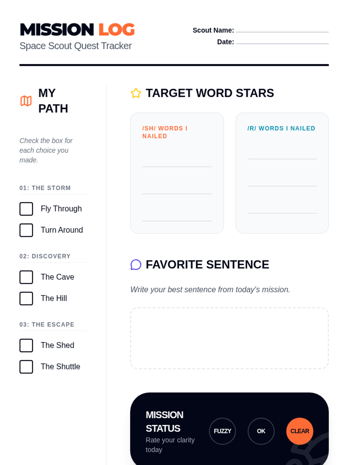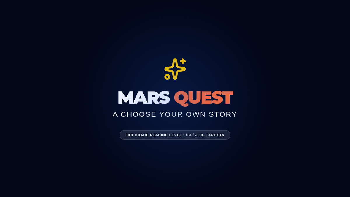 A 20-minute interactive choose-your-own-adventure speech therapy session at a 3rd-grade reading level. Students guide a young space scout on a mission to Mars while targeting /sh/ and vocalic /r/ sounds and fluency strategies.