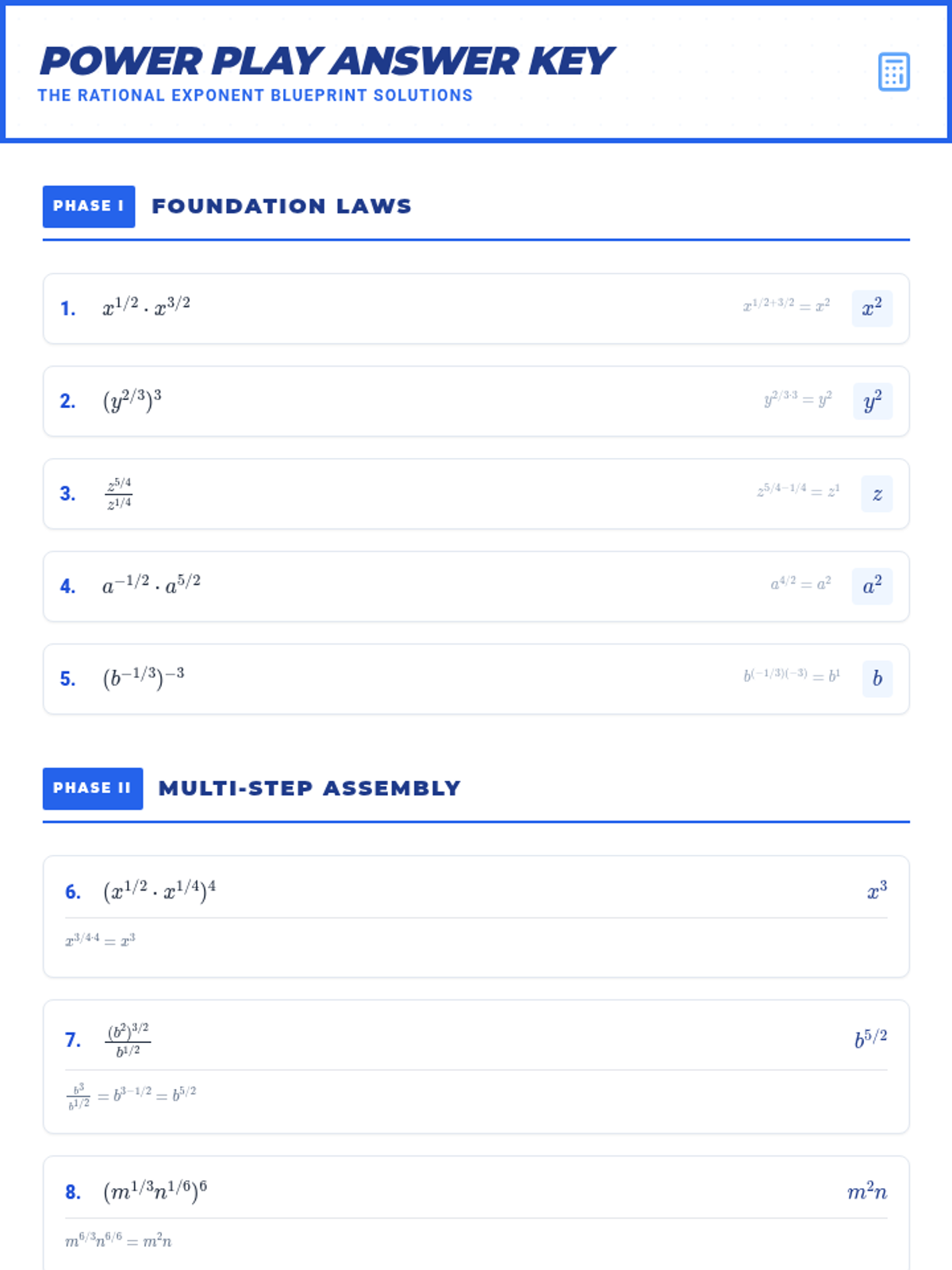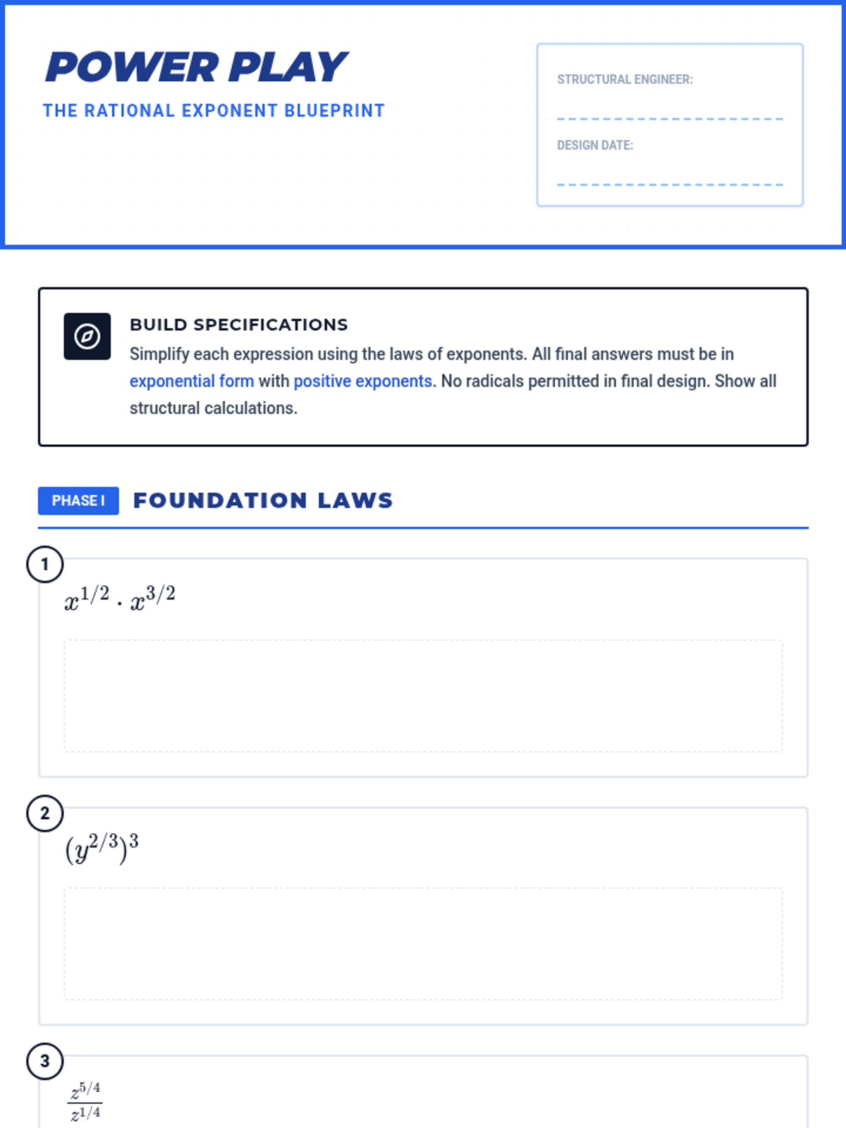 A lesson focused on mastering the laws of exponents with rational exponents, progressing from single-step applications to complex multi-step simplifications without using radical notation.