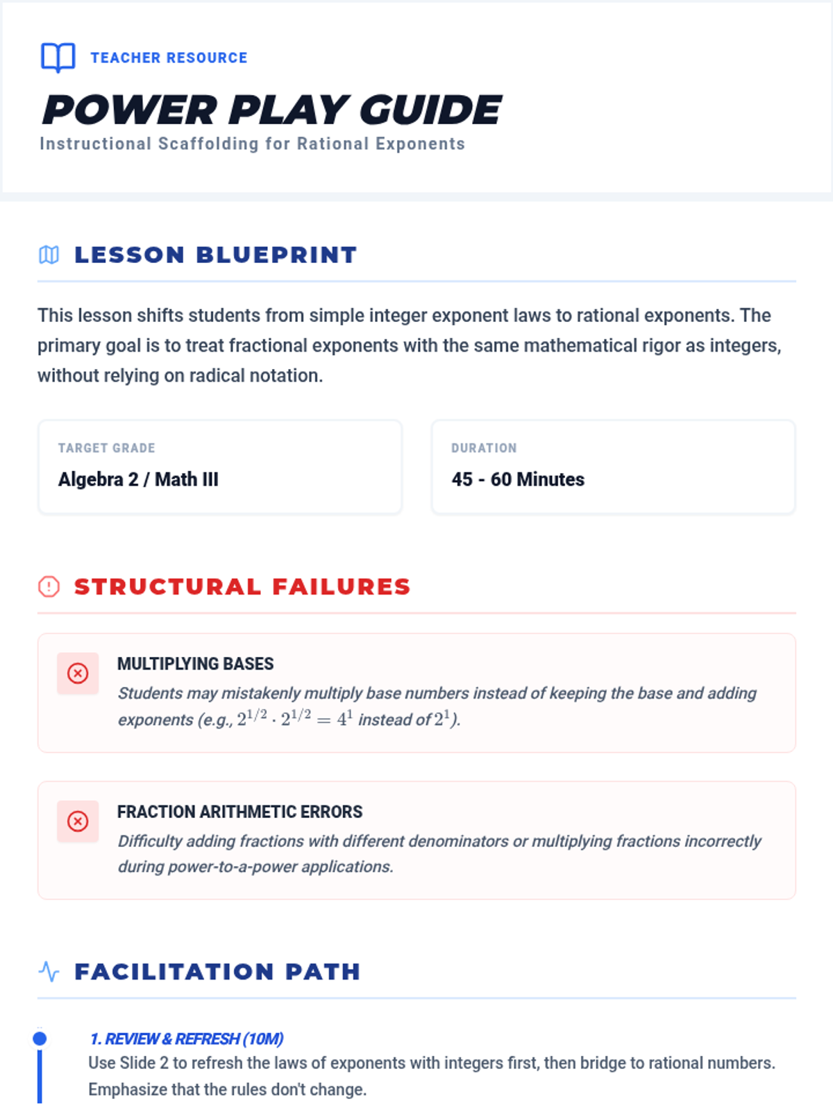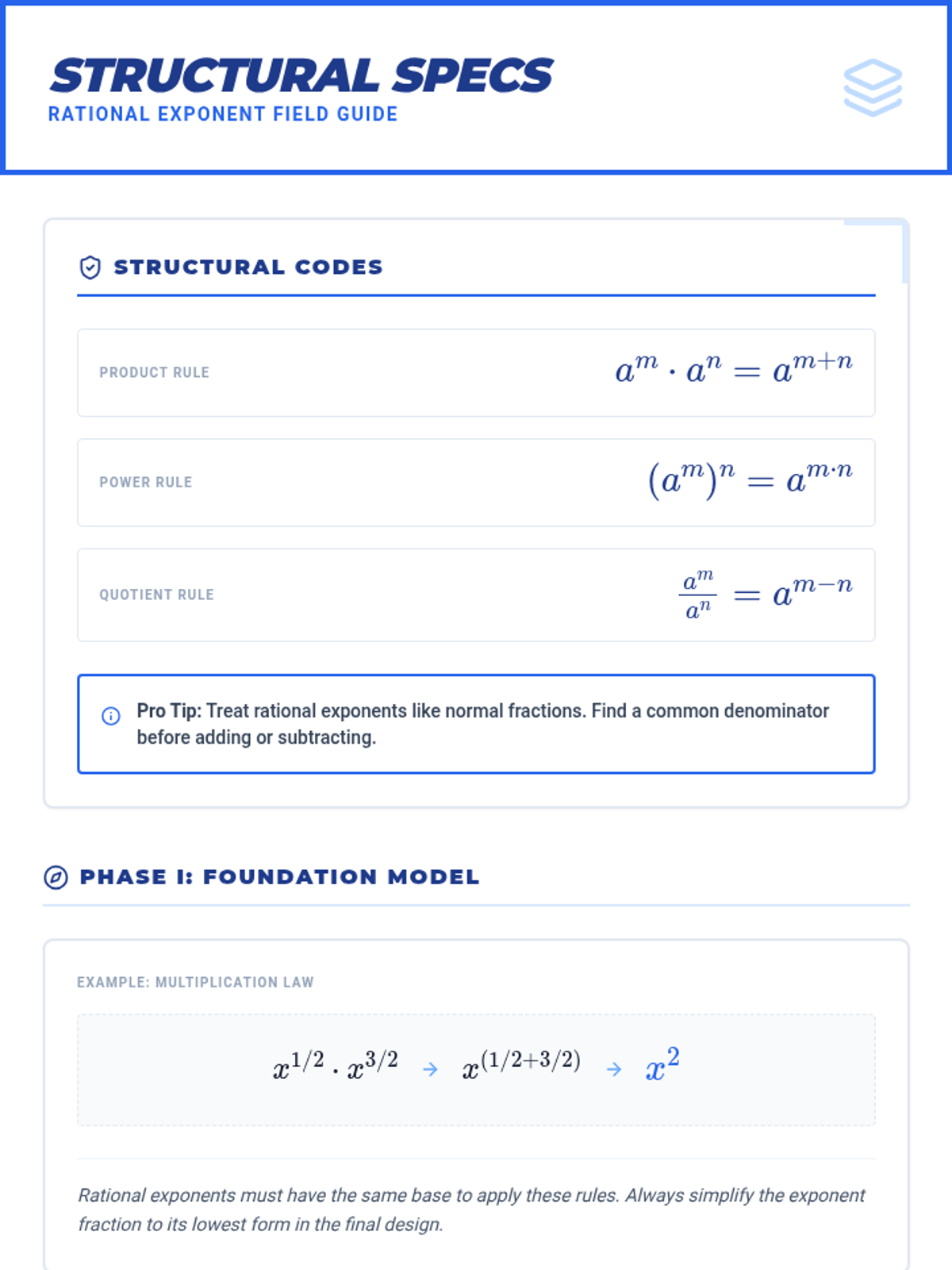 A comprehensive guide to mastering exponent rules, including product, quotient, power, zero, negative, and fractional (rational) exponents through technical organizers and tiered practice.