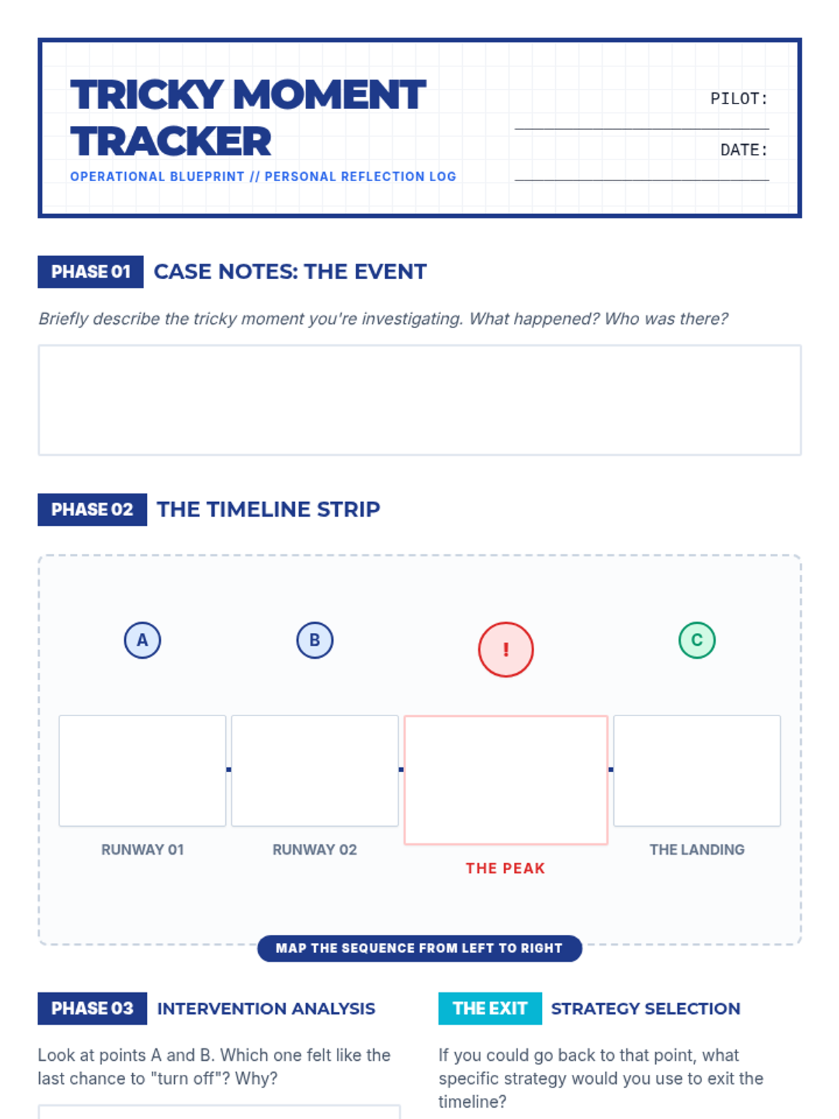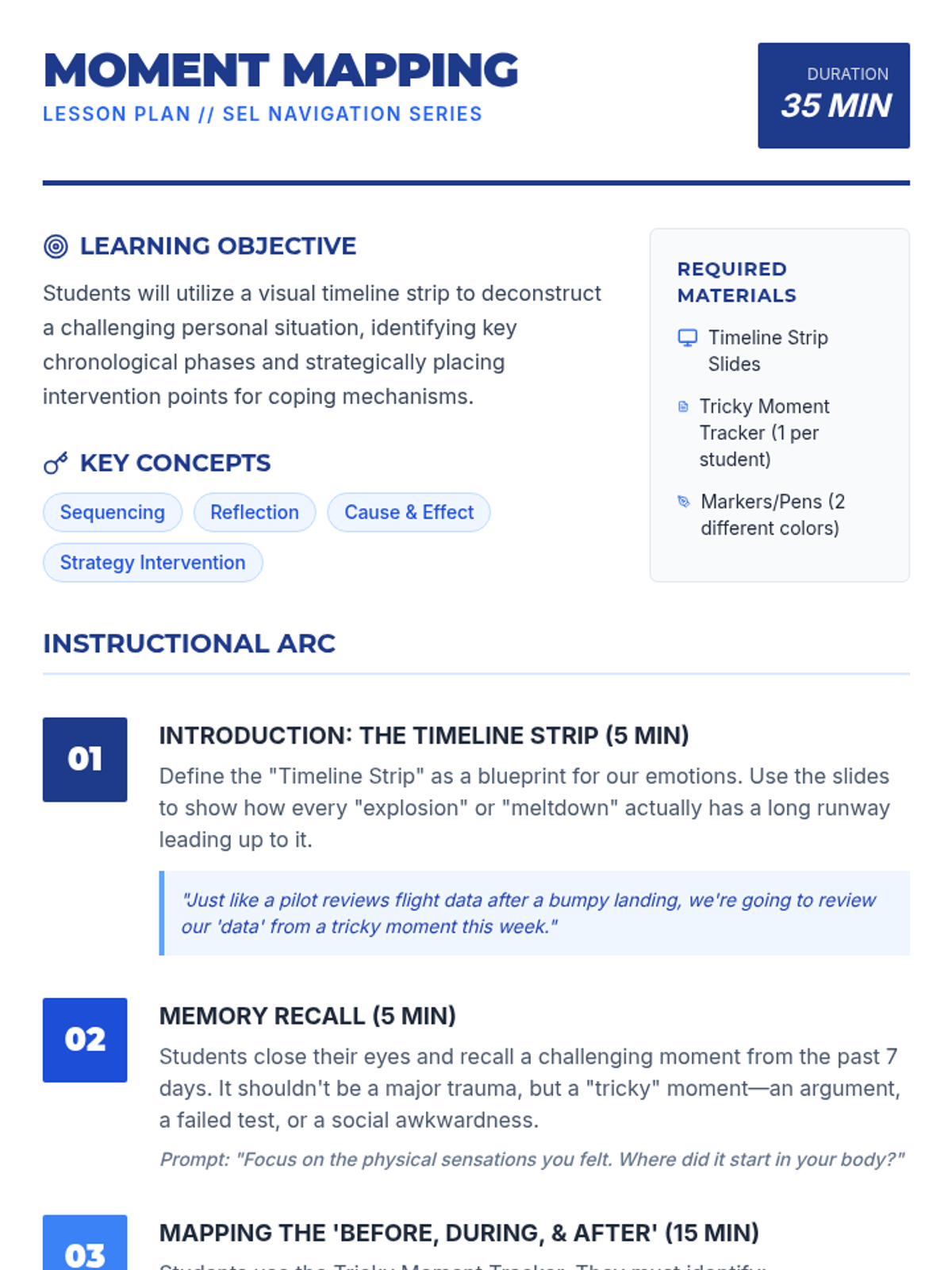 Students learn to deconstruct challenging social or emotional situations by mapping them onto a timeline, identifying the trigger, the peak, and the resolution, and then pinpointing where coping strategies could have been effectively introduced.