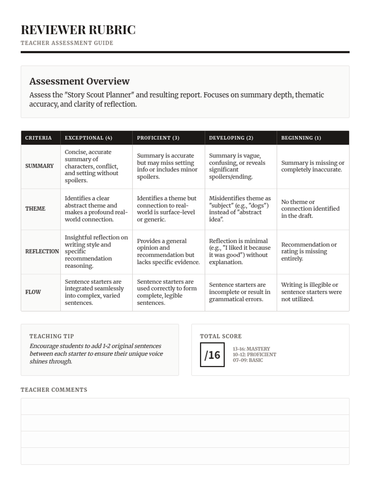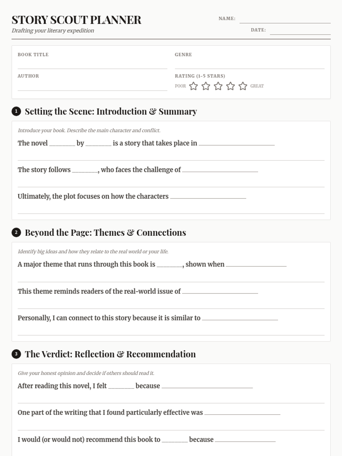 A guided lesson to help students structure a comprehensive book report focusing on summary, theme, and personal reflection.