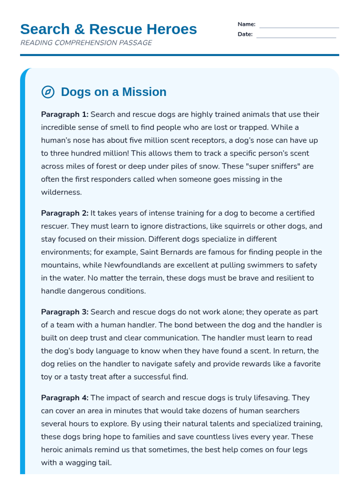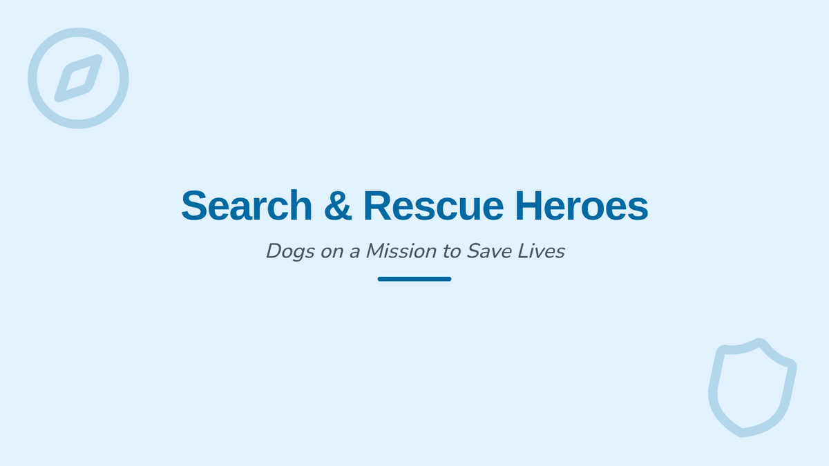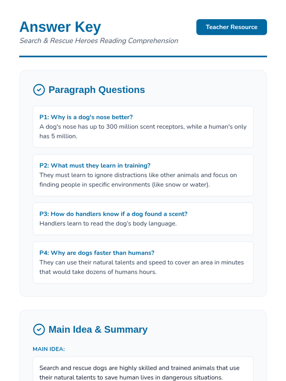 A reading comprehension lesson focused on identifying main ideas, supporting details, and summarizing, centered on the heroic work of search and rescue dogs.