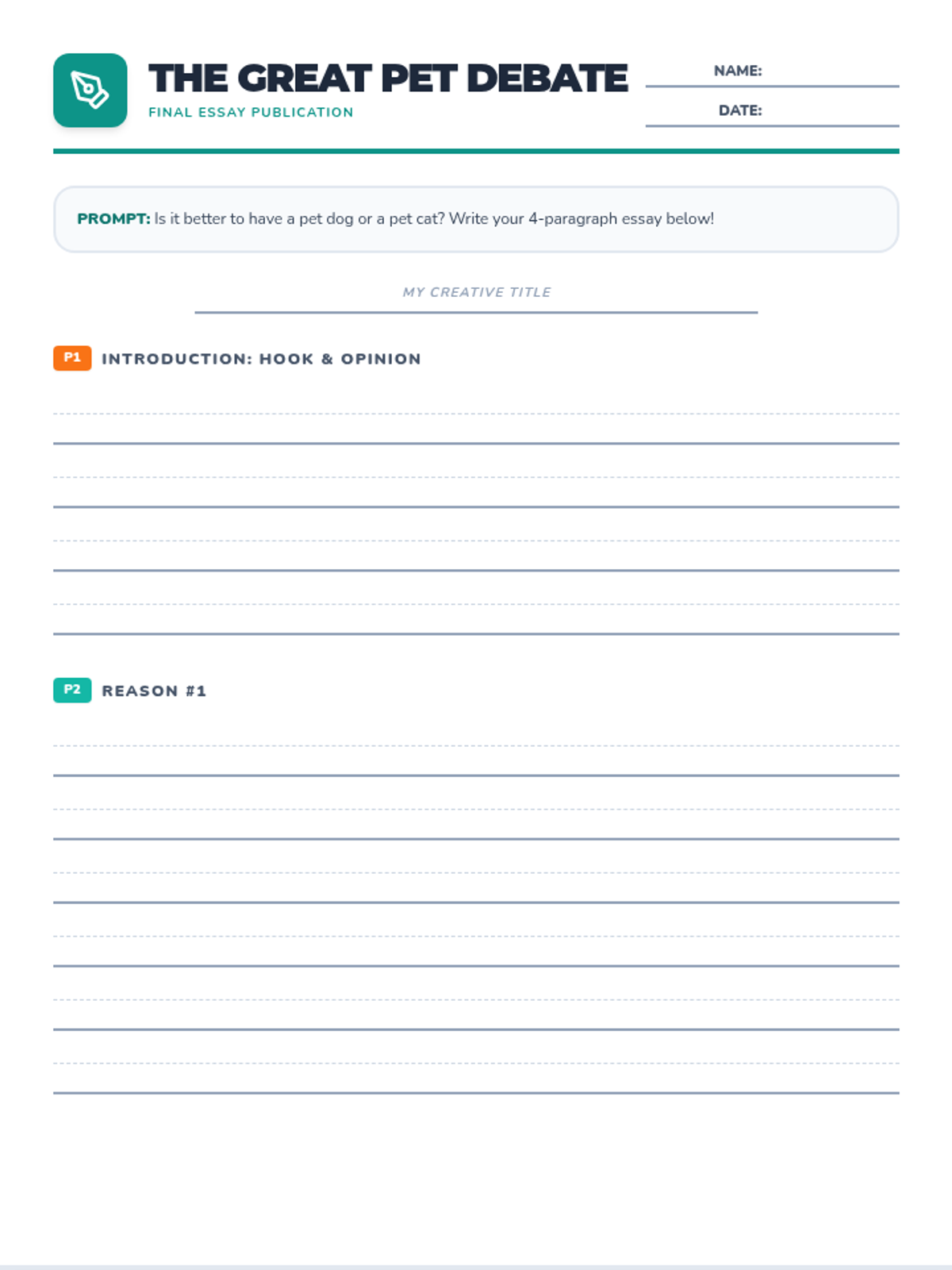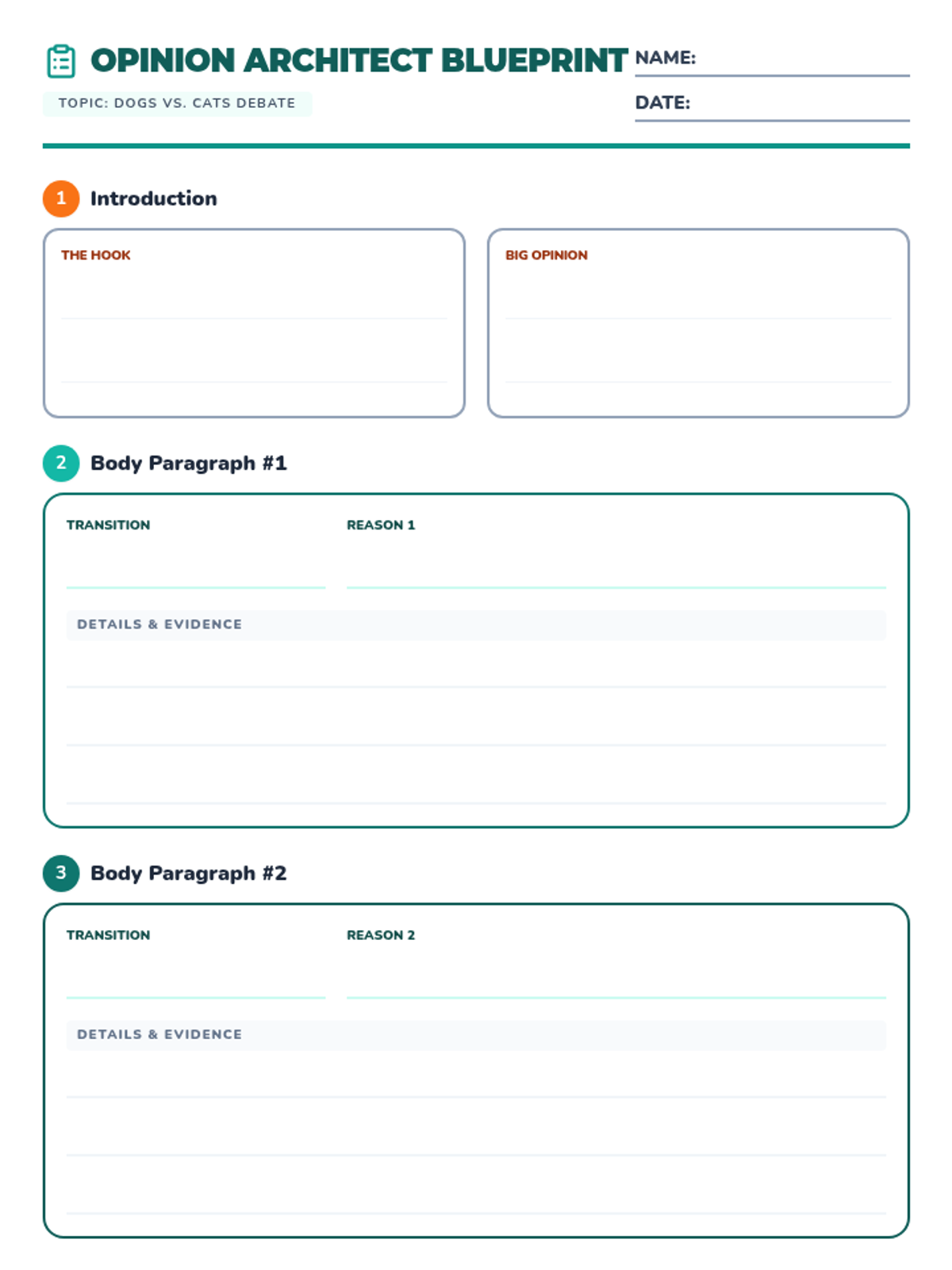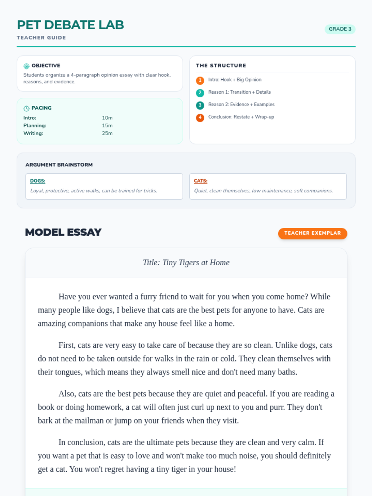 A one-day lesson focused on teaching 3rd-grade students how to structure a multi-paragraph opinion essay comparing dogs and cats. Students will learn the components of an introduction, body paragraphs, and a conclusion.