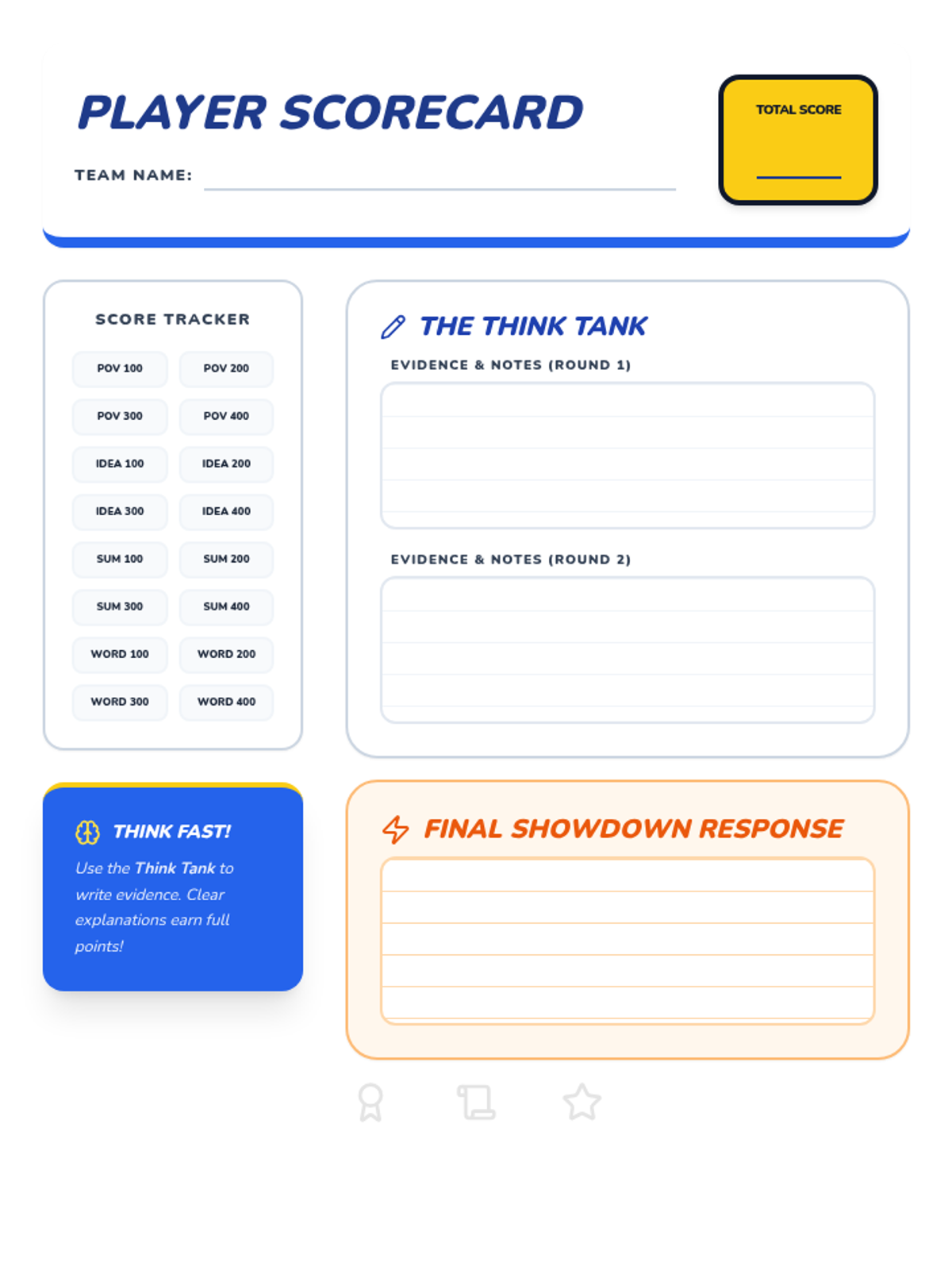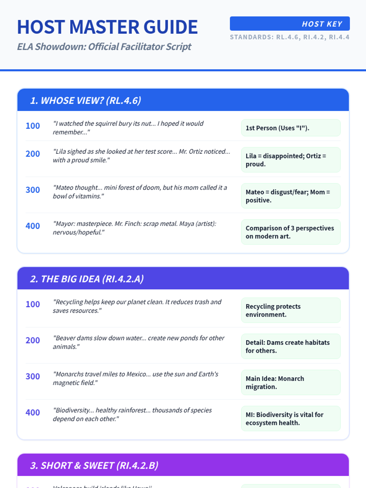 A high-energy, game-show style lesson where students master point of view, main idea, summarizing, and academic vocabulary through a collaborative Jeopardy-style competition.