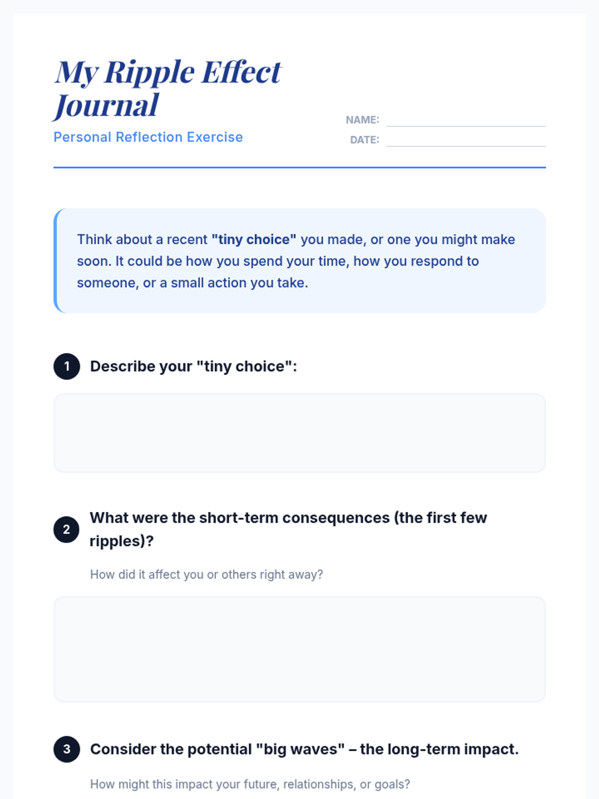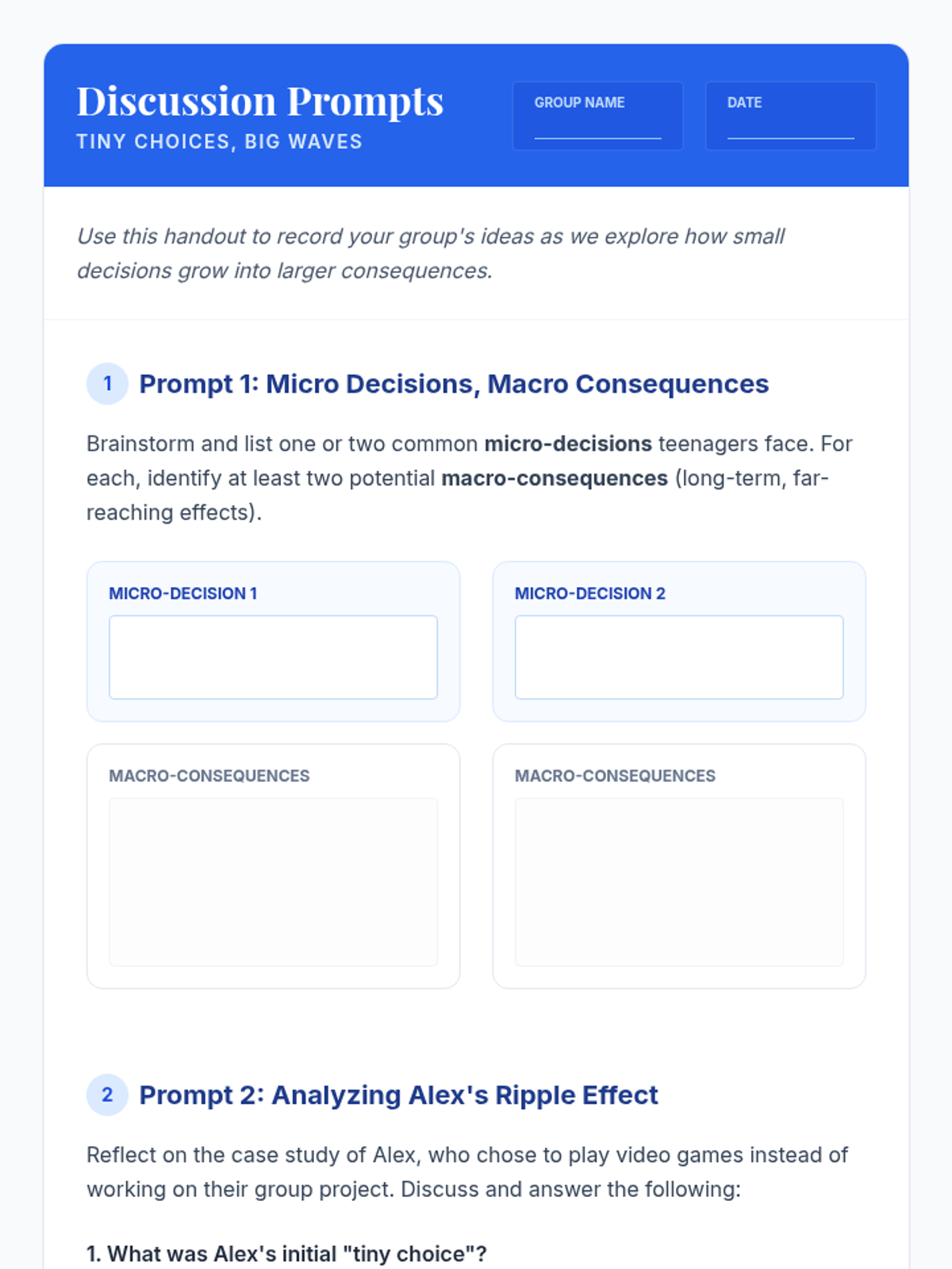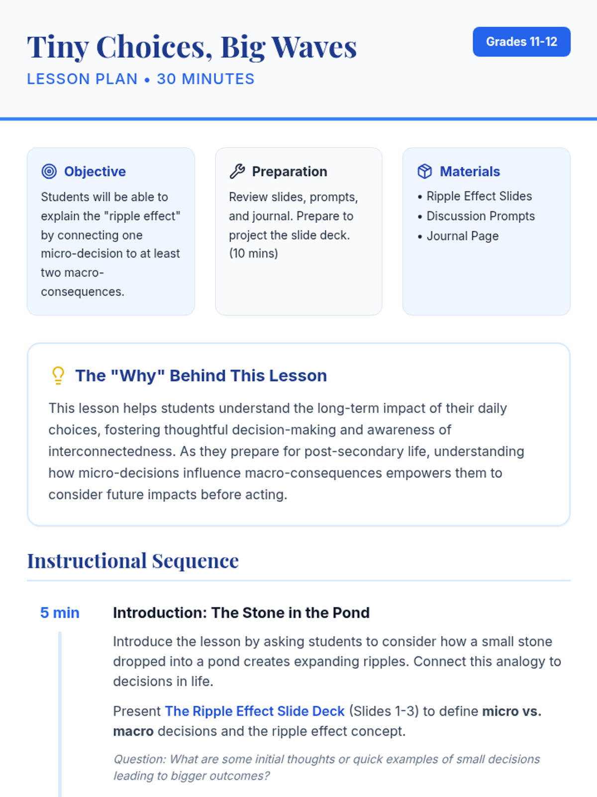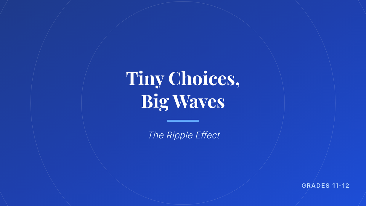 A 30-minute session for 11th and 12th graders exploring how micro-decisions lead to macro-consequences through the ripple effect analogy. Students analyze a case study and reflect on their own choices.