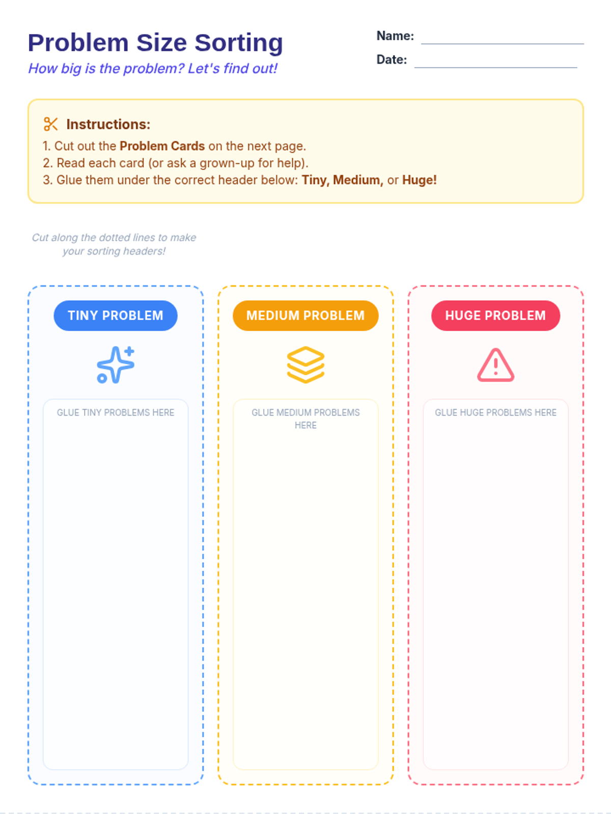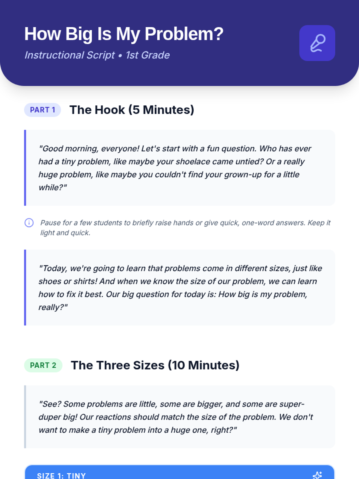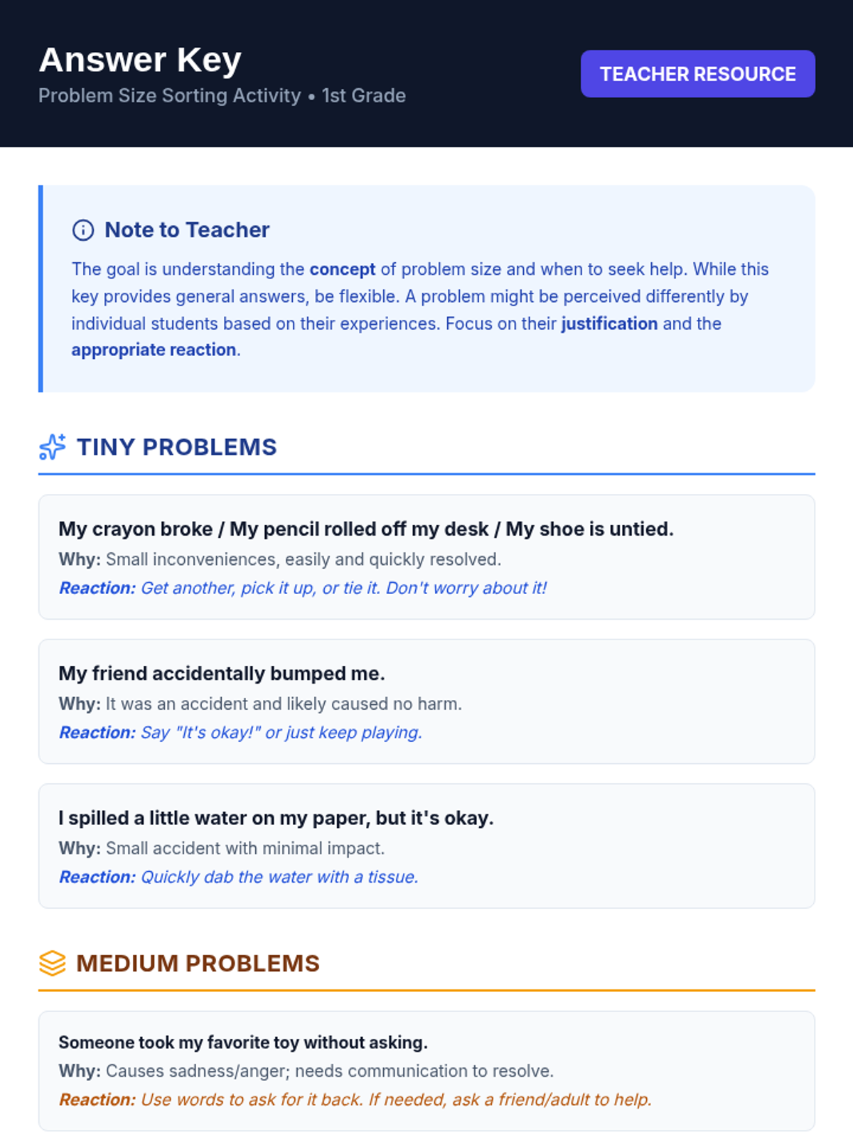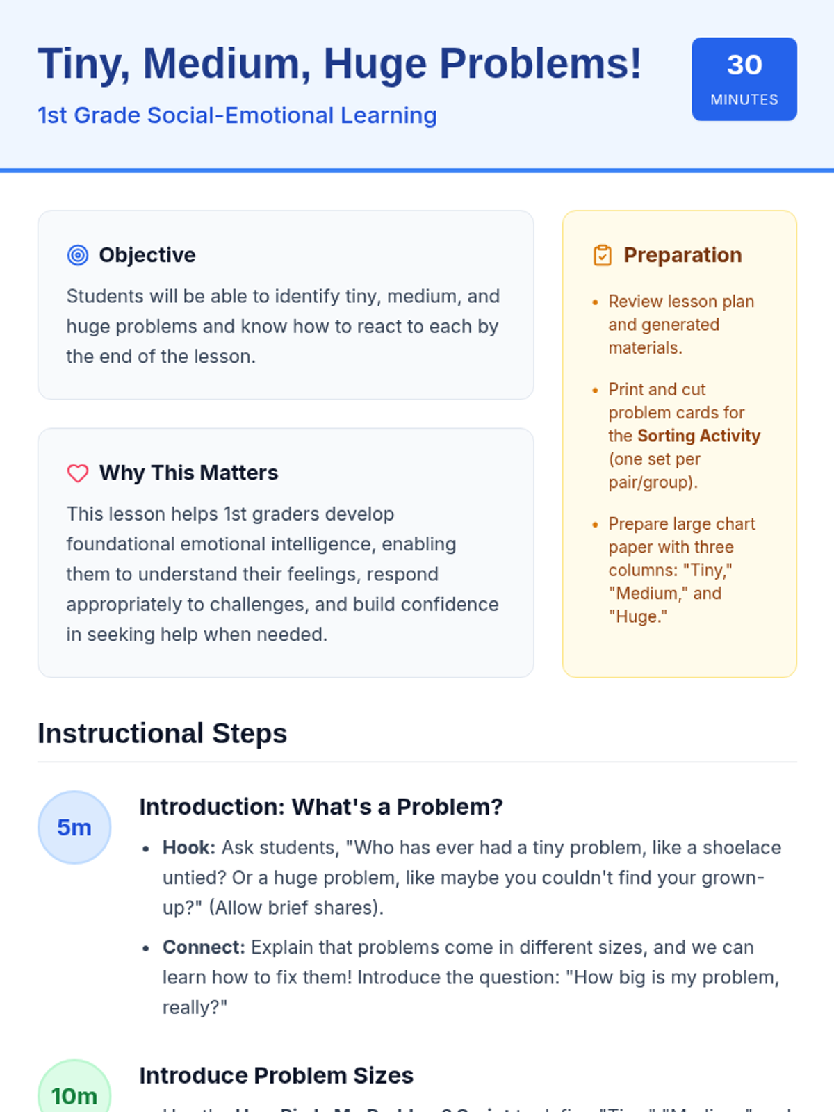 A 30-minute social-emotional learning lesson for 1st graders to identify problem sizes (tiny, medium, huge) and determine appropriate reactions. Students learn to distinguish between problems they can solve independently and those requiring adult help.