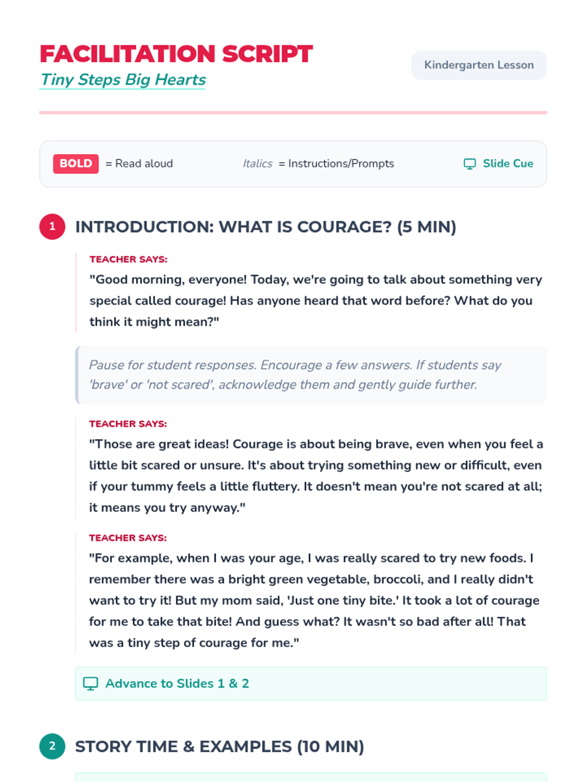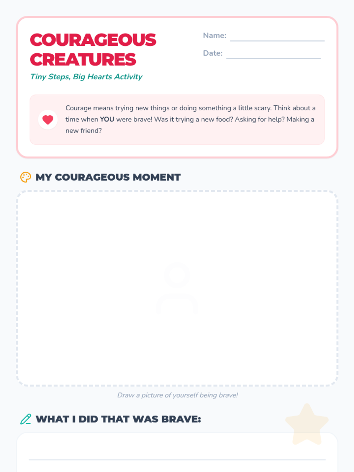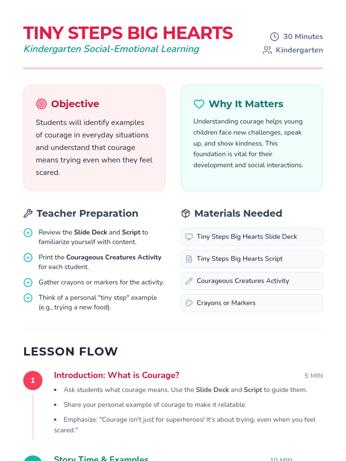 A 30-minute Kindergarten lesson introducing the concept of courage through storytelling, discussion, and drawing. Students learn that bravery means trying even when they feel scared, focusing on small everyday actions.