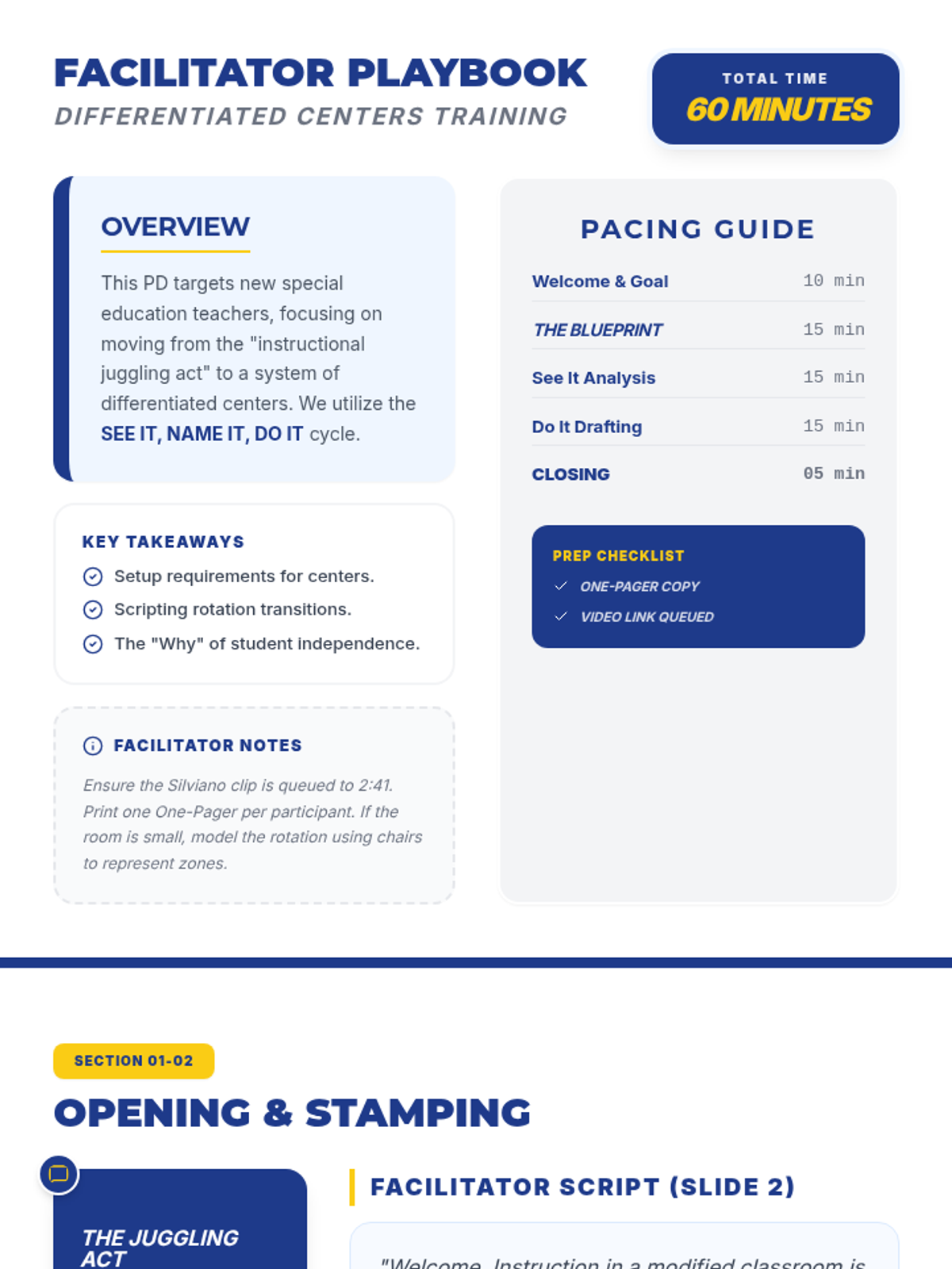 This lesson provides special education teachers with a comprehensive framework for planning, setting up, and executing differentiated centers in a modified classroom setting. It focuses on the foundation of preparation and utilizes the 'See It, Name It, Do It' model to master instructional techniques.