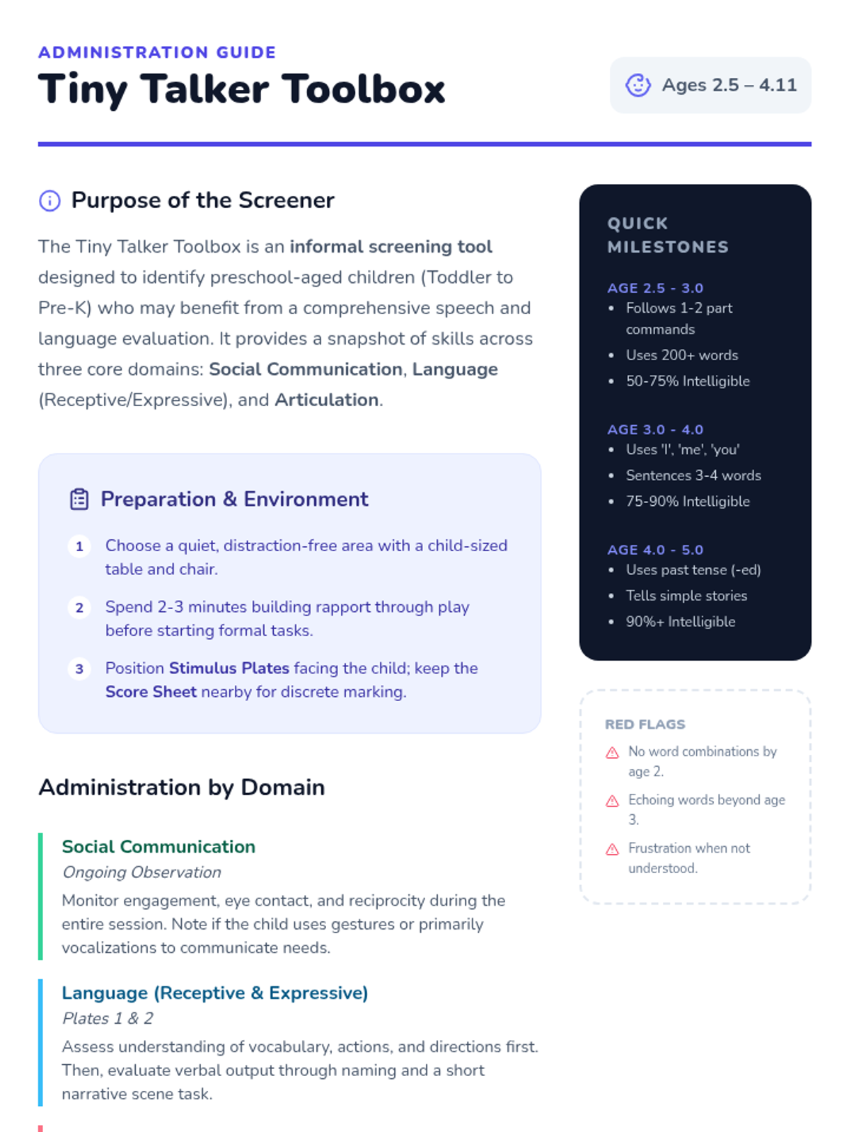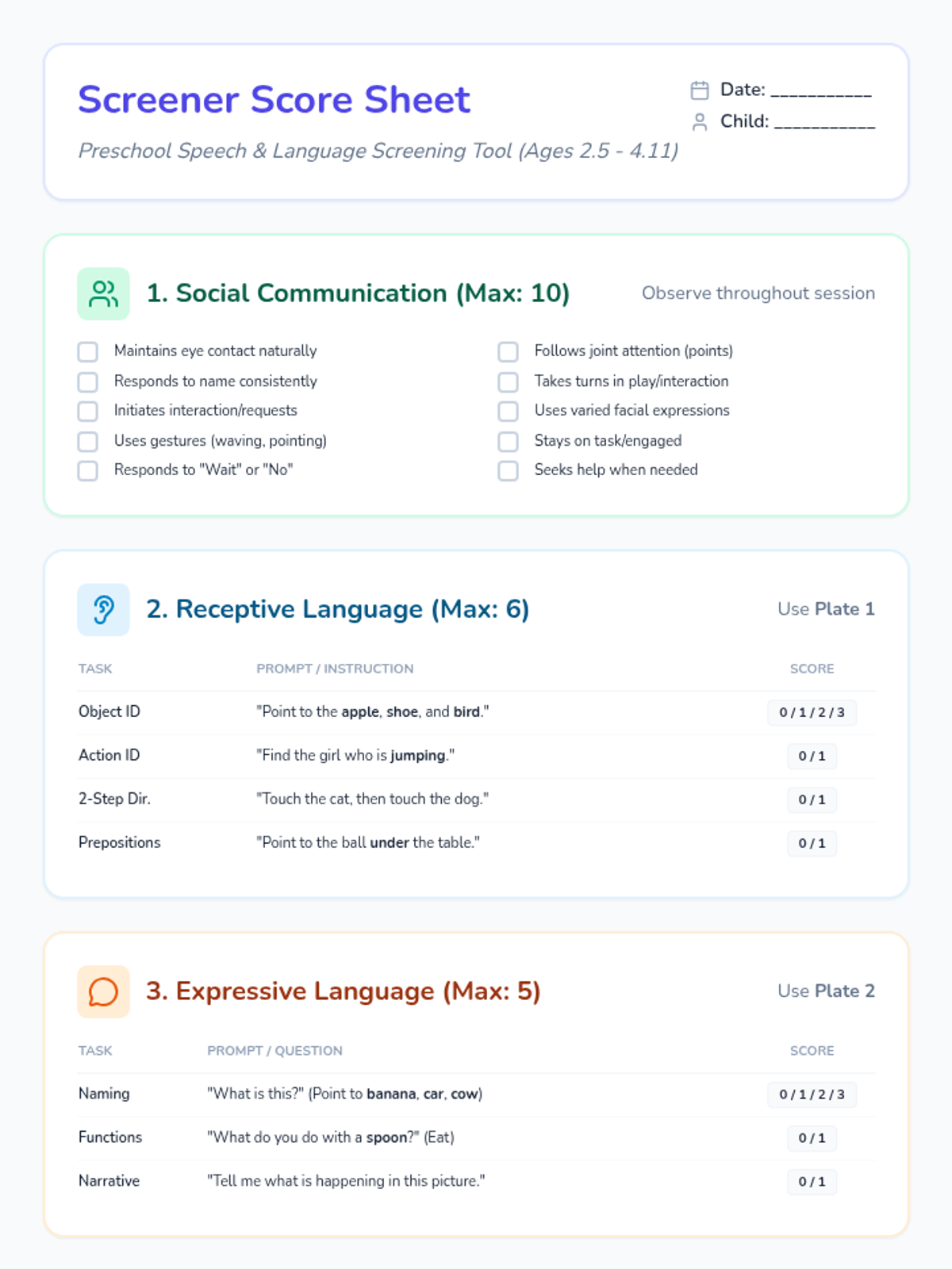A comprehensive preschool speech and language screening tool designed to assess receptive/expressive language, social communication, and articulation through play-based activities and visual prompts.