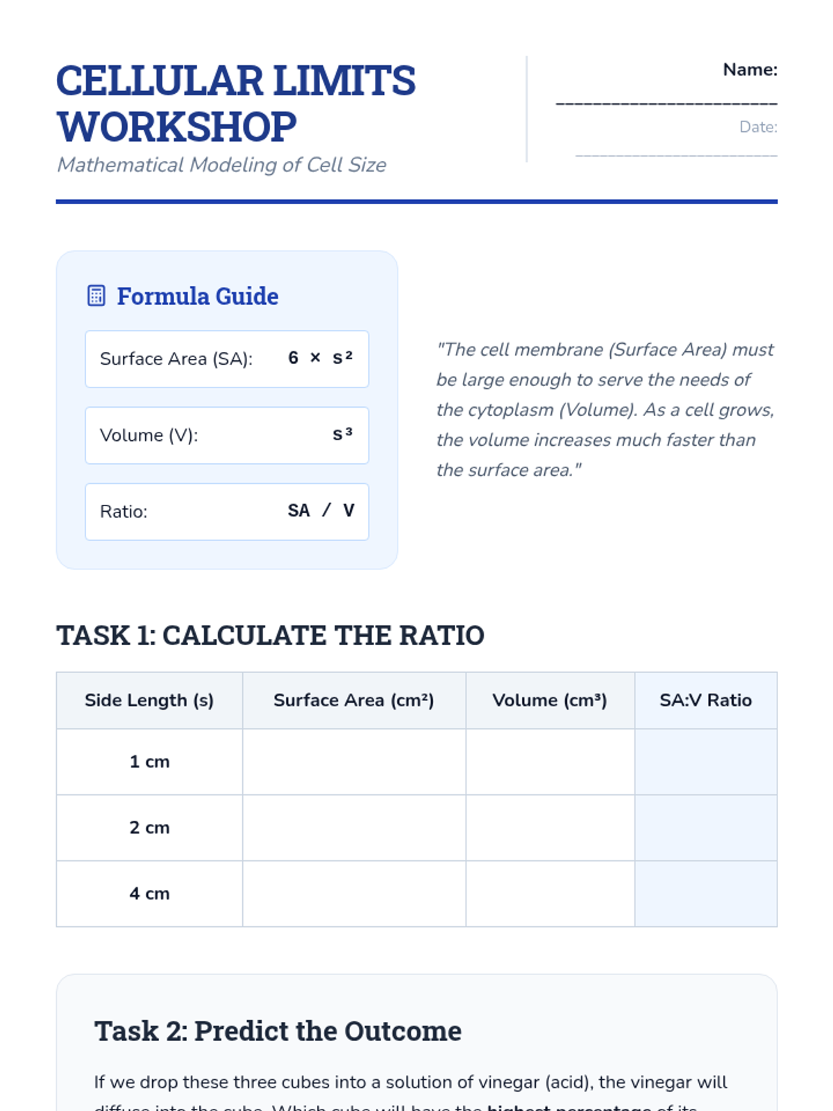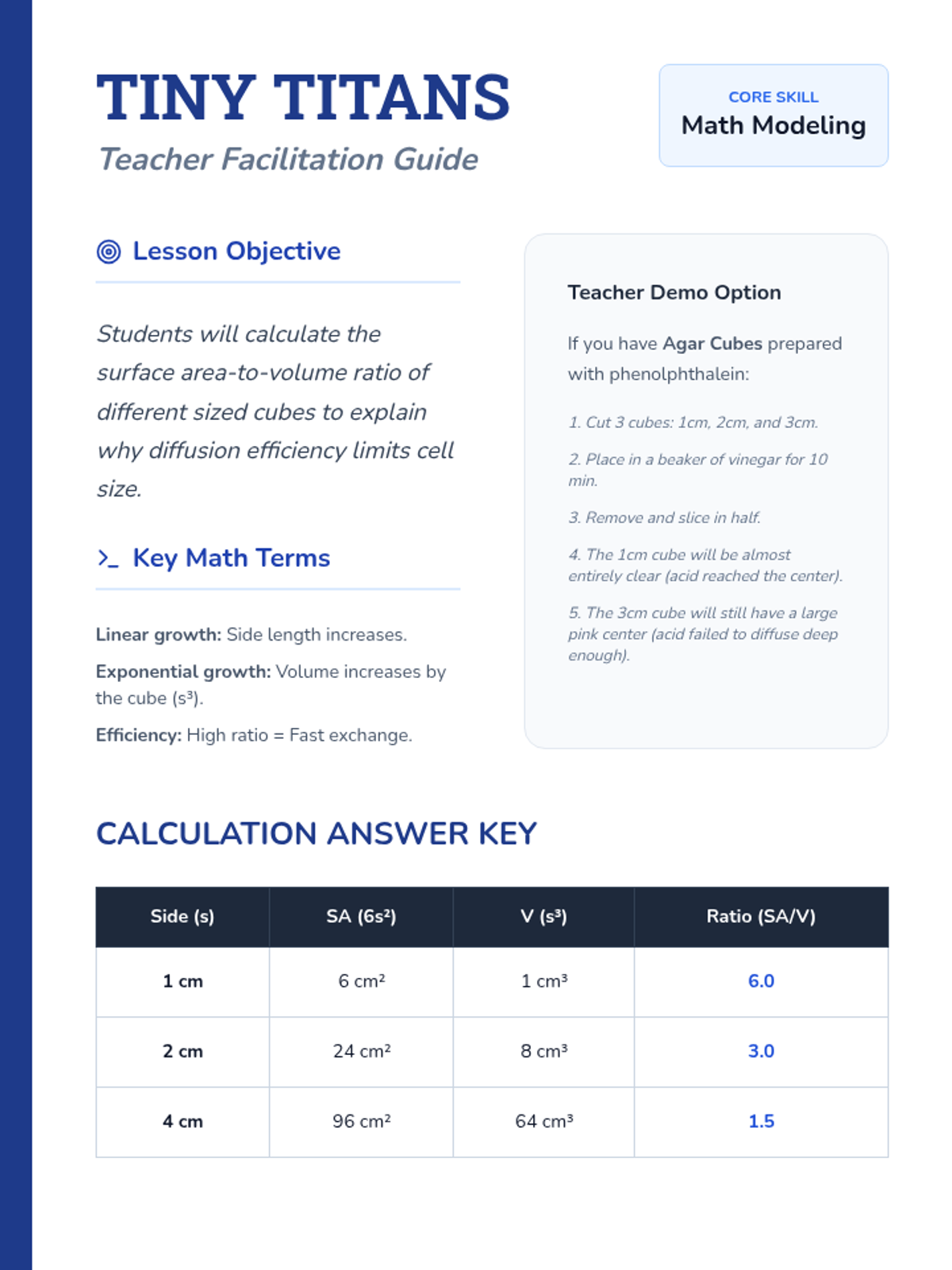 Through a mathematical modeling workshop, students calculate surface area-to-volume ratios of agar cubes to understand why cells are microscopic. They relate this concept to the efficiency of diffusion as a transport mechanism.
