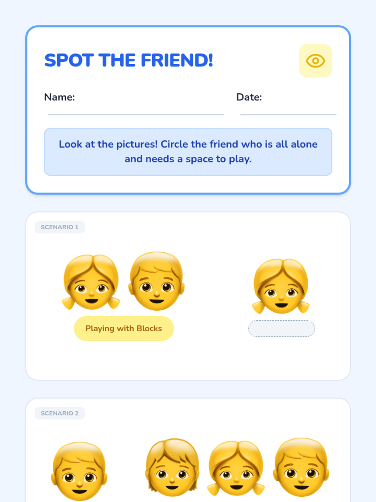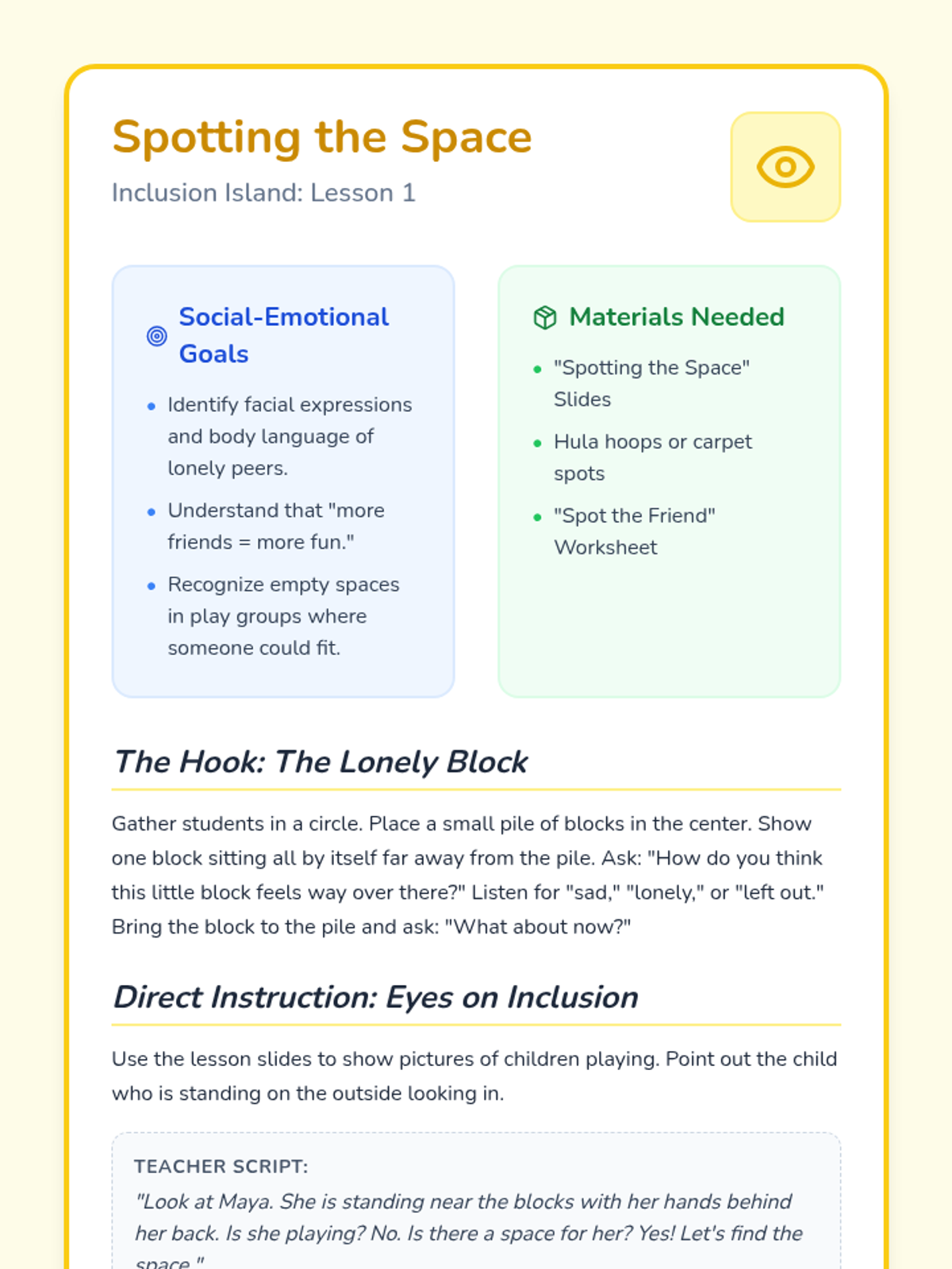 A foundational lesson focused on recognizing when a peer is playing alone and might want to join in, using visual cues and social stories.