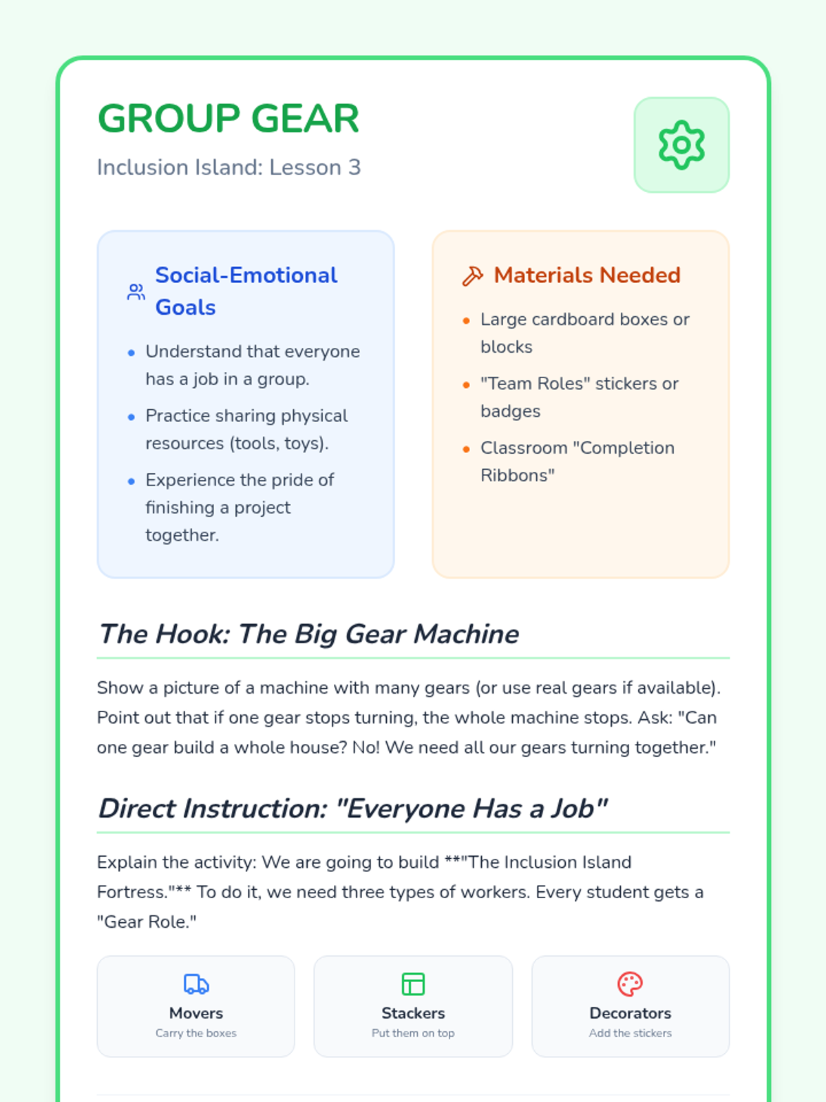 A hands-on collaborative project where students must work together, ensuring every person has a specific and valued role in the group.