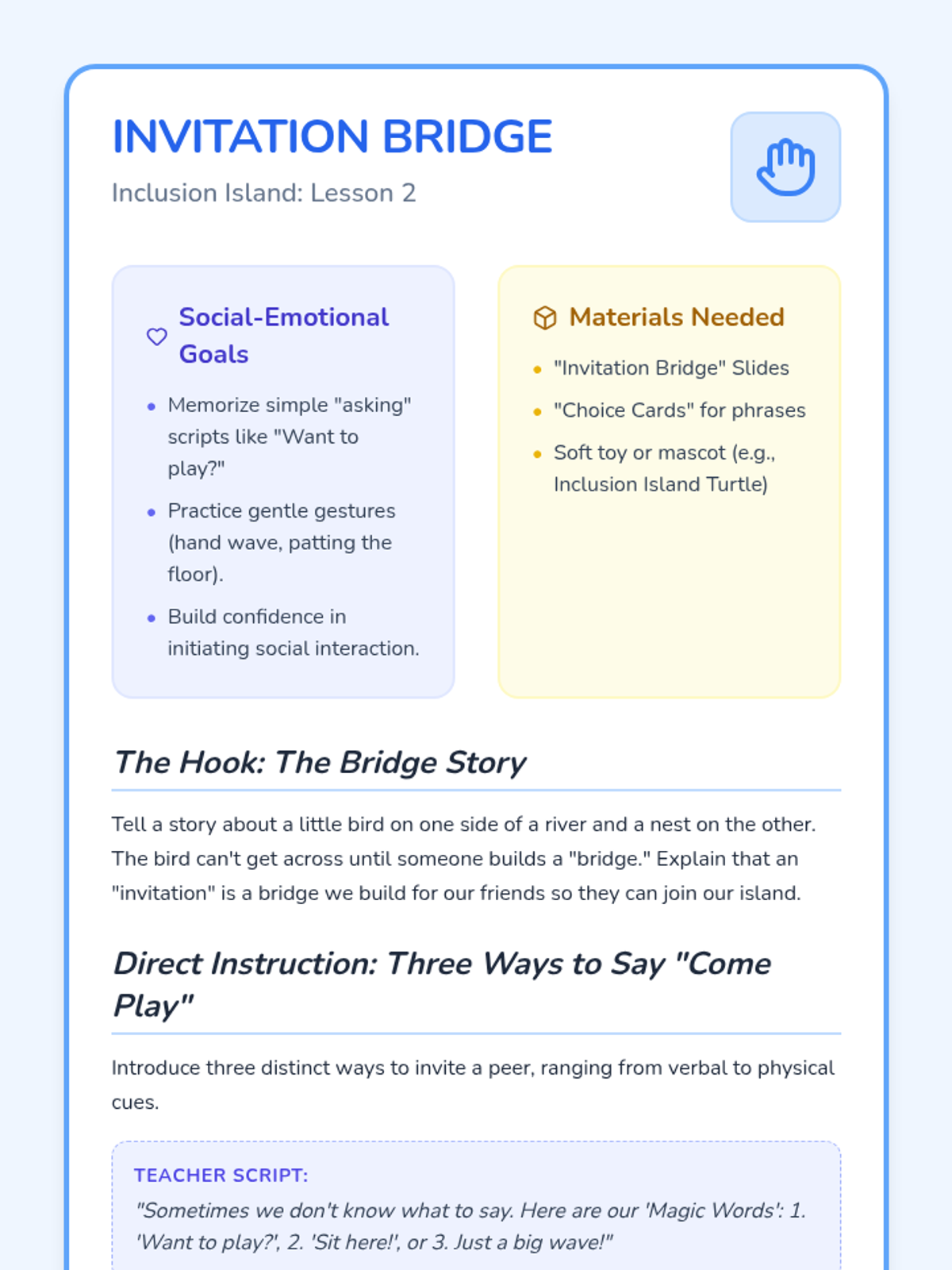 Students learn simple phrases and gestures to invite others into their activities, practicing through guided roleplay and social scripting.