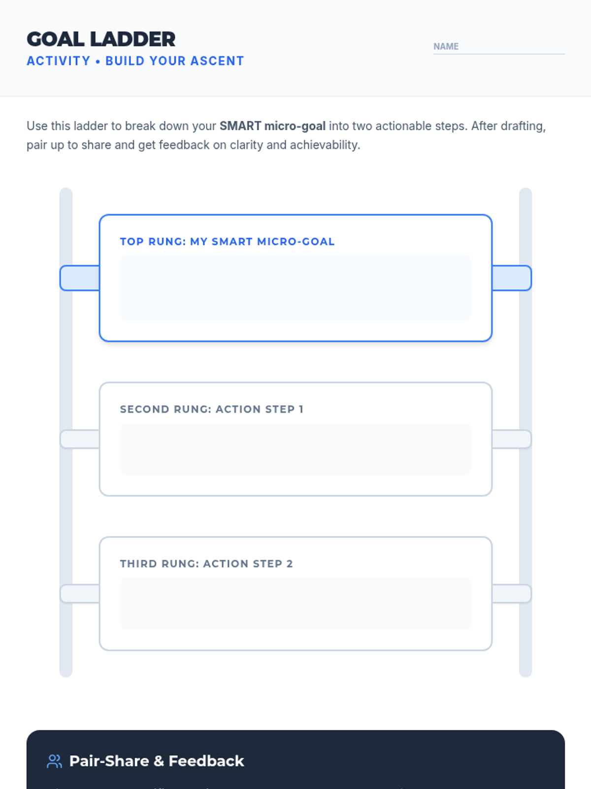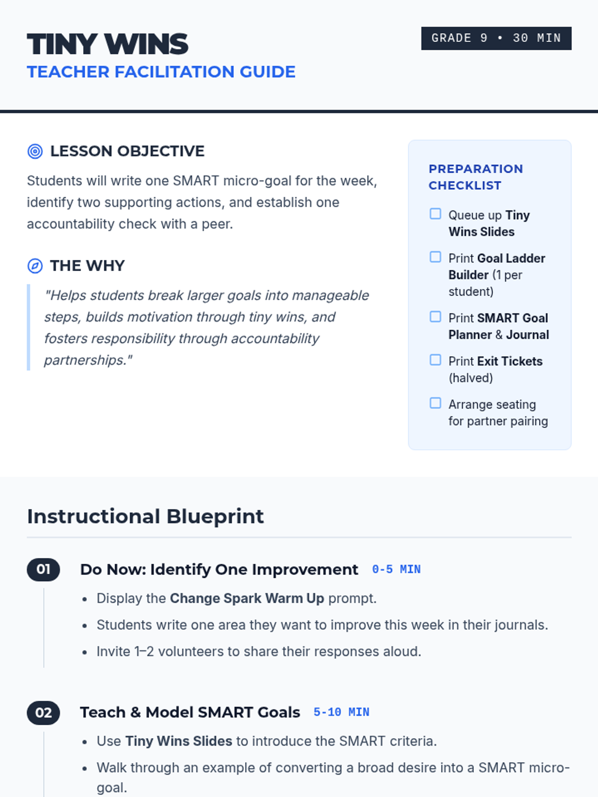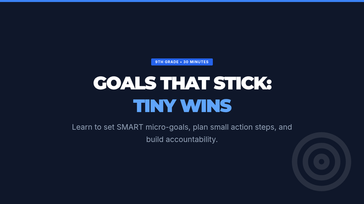 In this 30-minute 9th Grade lesson, students learn to set SMART micro-goals, plan small actionable steps, and establish accountability checks. This builds motivation and habit formation by celebrating tiny wins and ensuring progress.