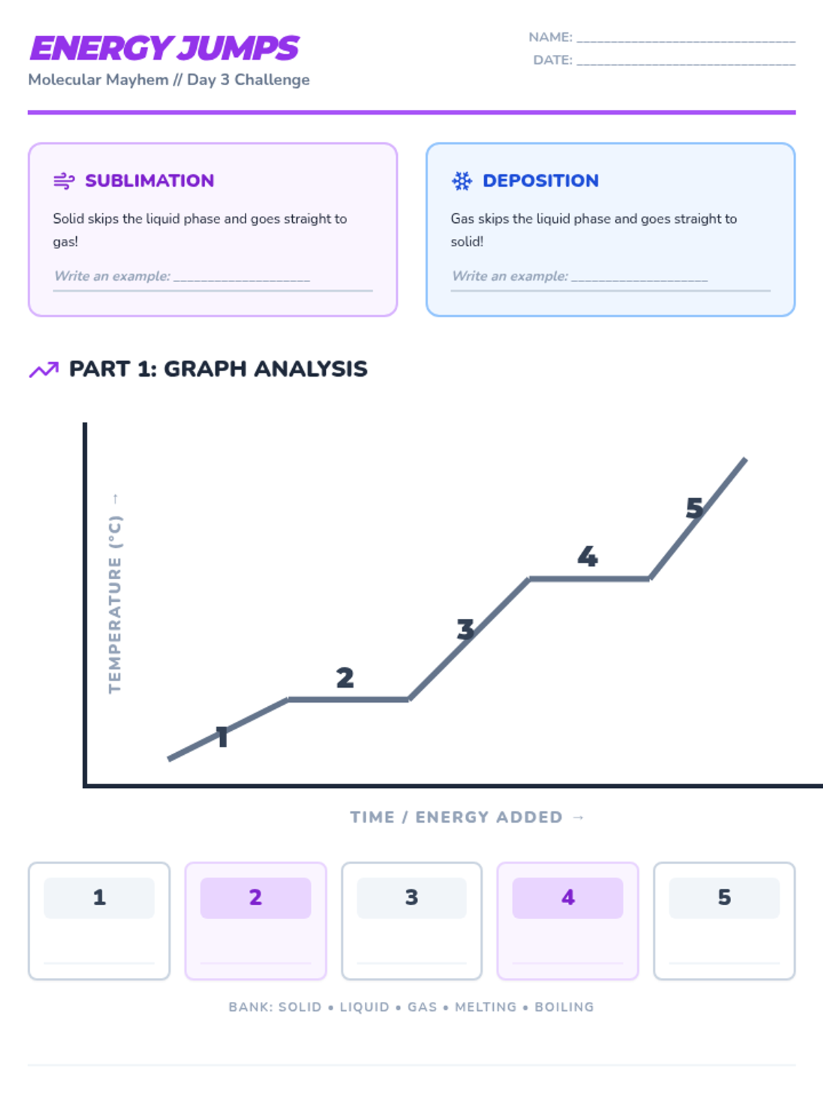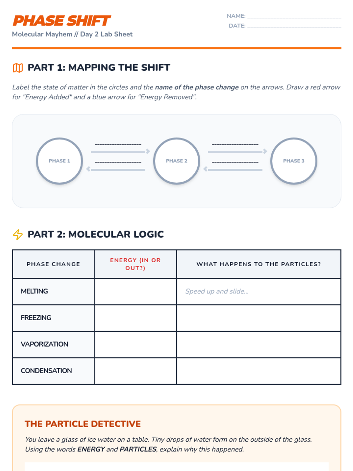 Day 2 dives into particle motion and spacing during phase changes, featuring a CER practice and a comprehensive exit ticket review.