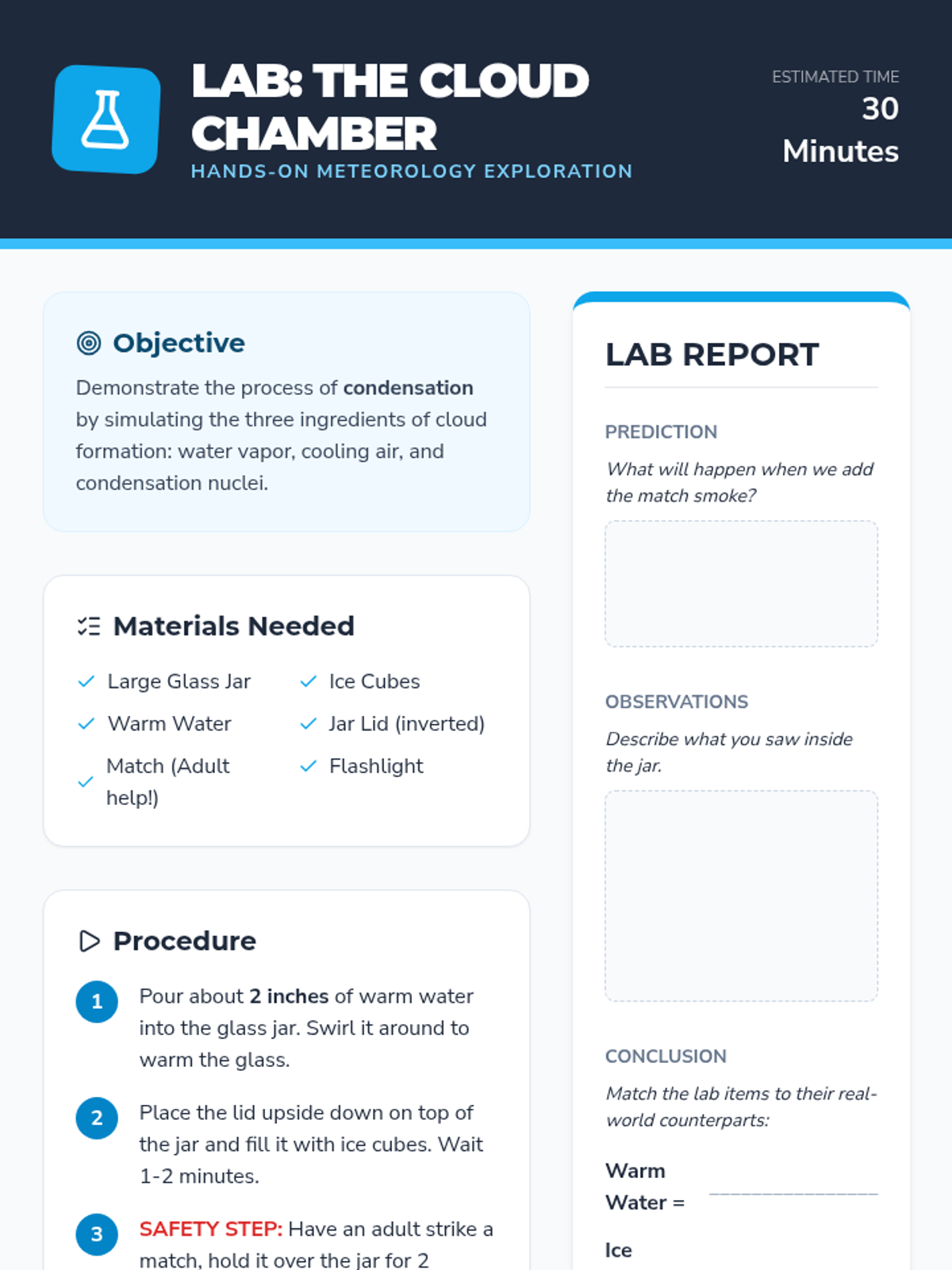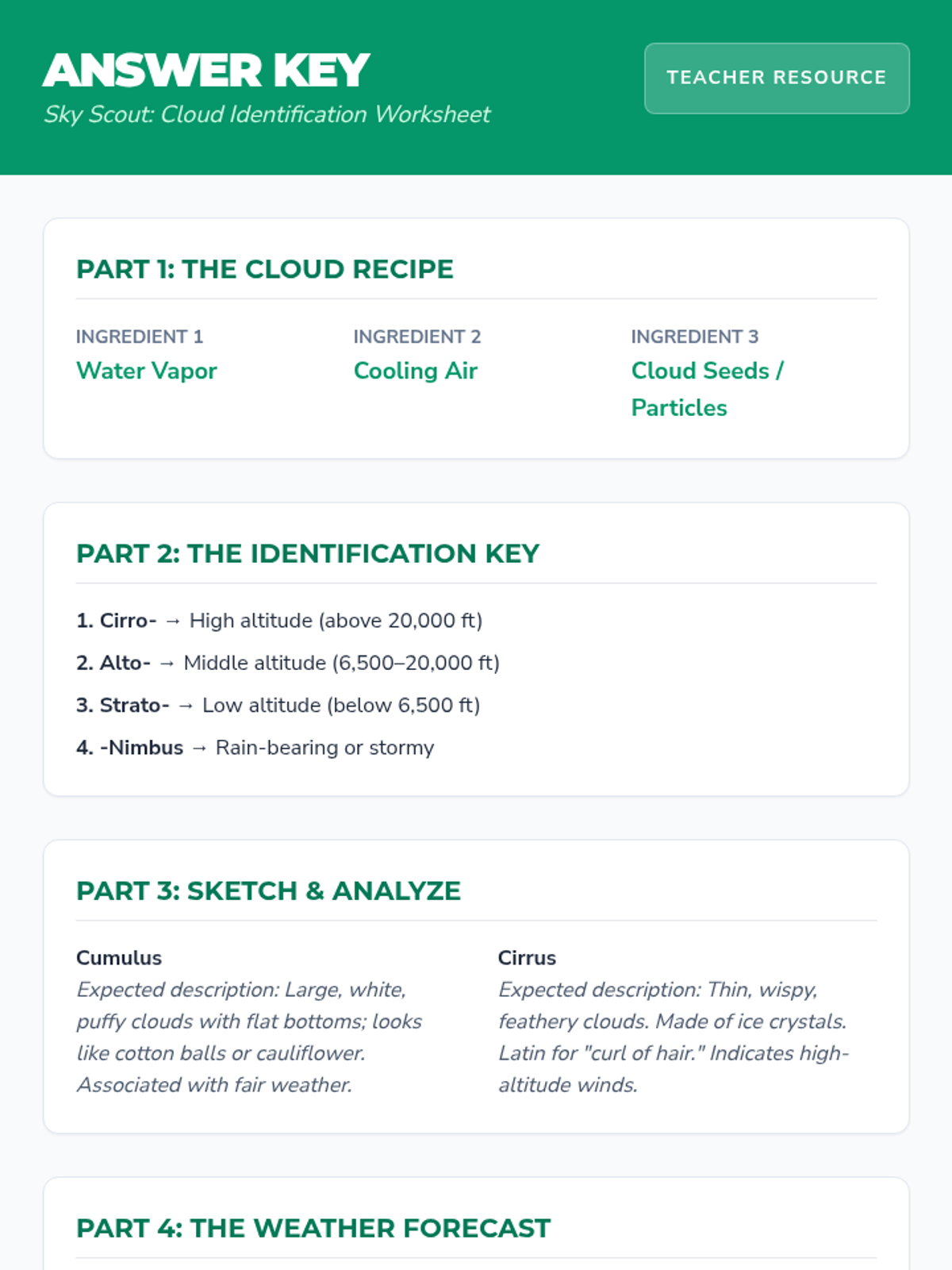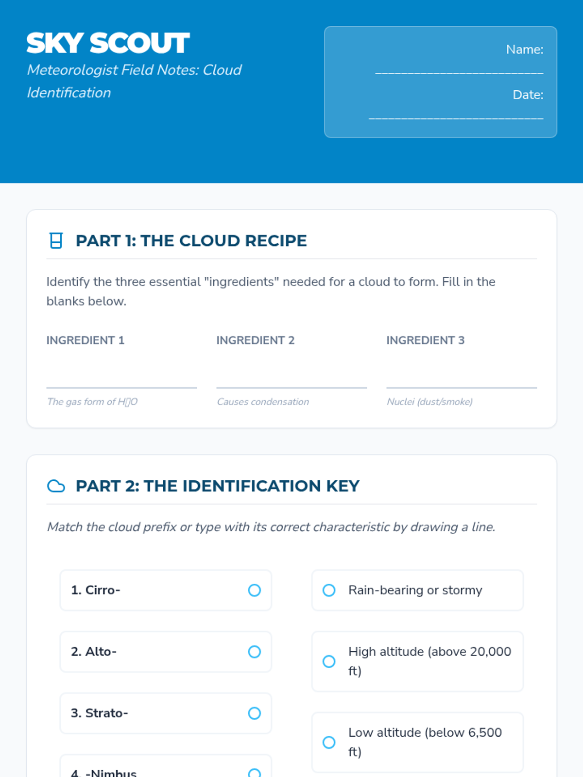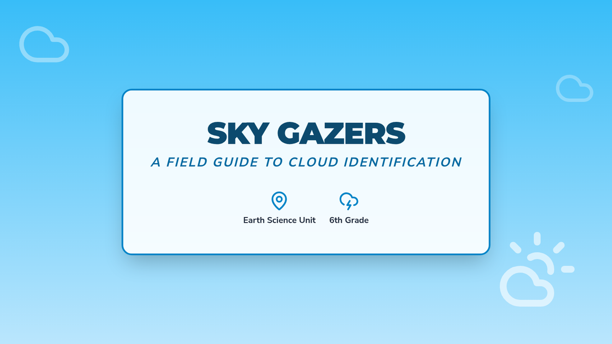 A comprehensive introduction to cloud types and formation for 6th-grade students, featuring instructional slides, a field-guide-style worksheet, and a classic hands-on lab.